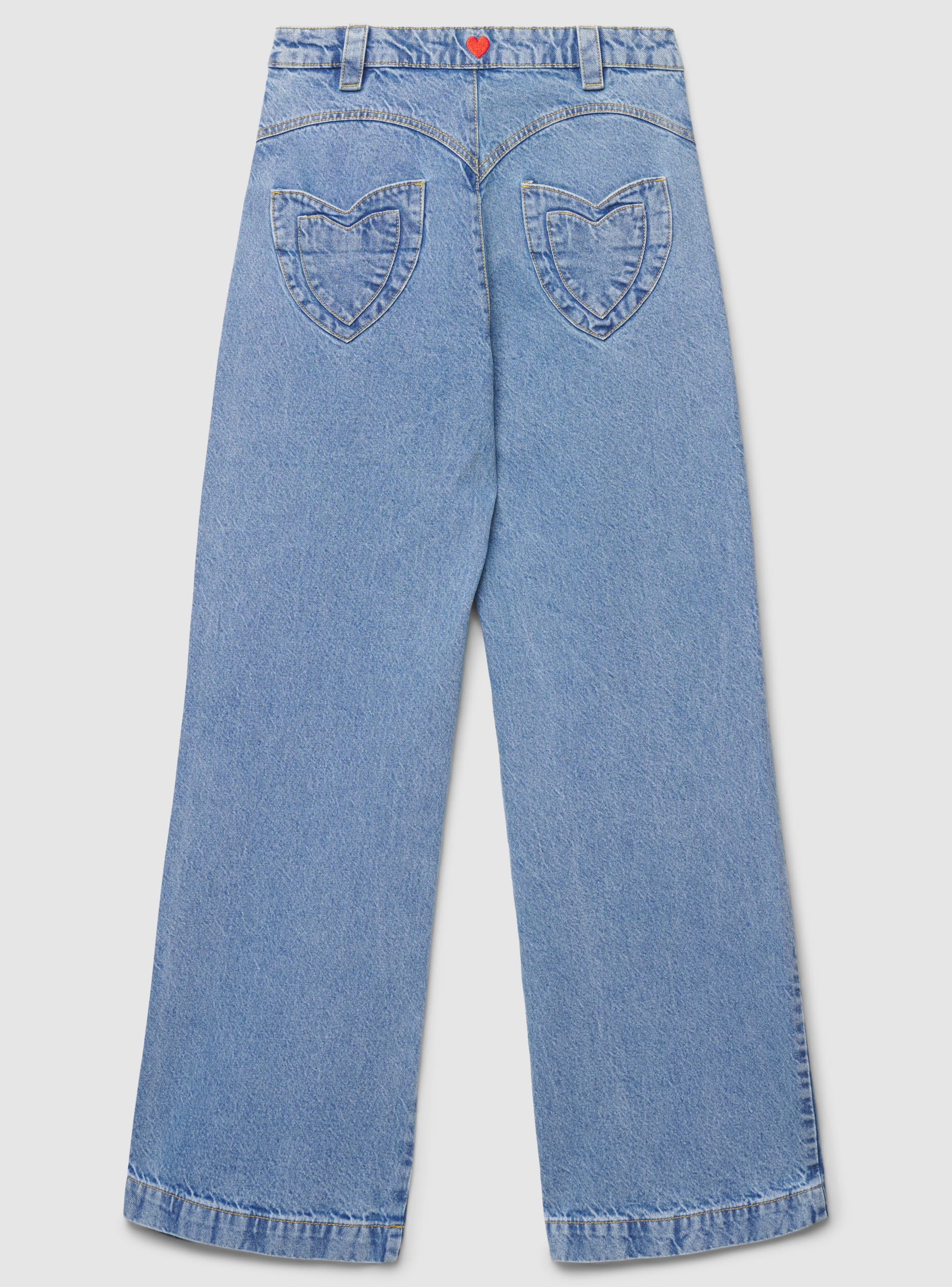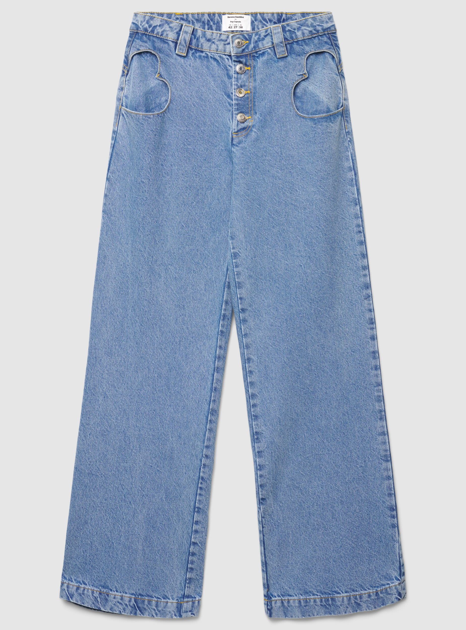 Jeans da donna a gamba ampia, pensati per look urban e day-off. La vita alta valorizza la silhouette, mentre la chiusura frontale con bottoni e i passanti permettono di abbinarli facilmente a cintura e top infilati. Le tasche a cuore sul davanti e le tasche applicate sul retro aggiungono un dettaglio distintivo. Modello a tinta unita, ideale con sneakers o sandali.Dettagli