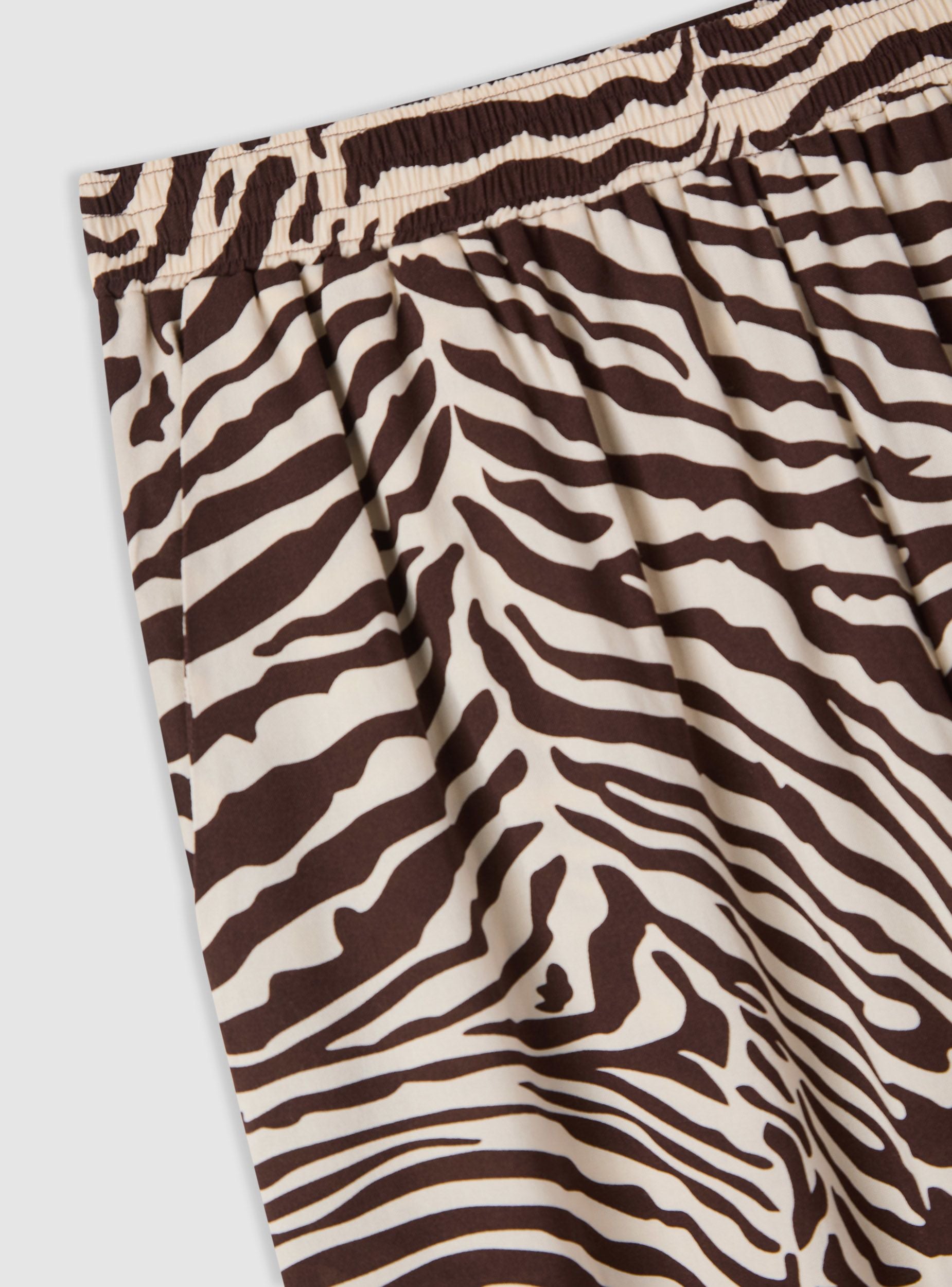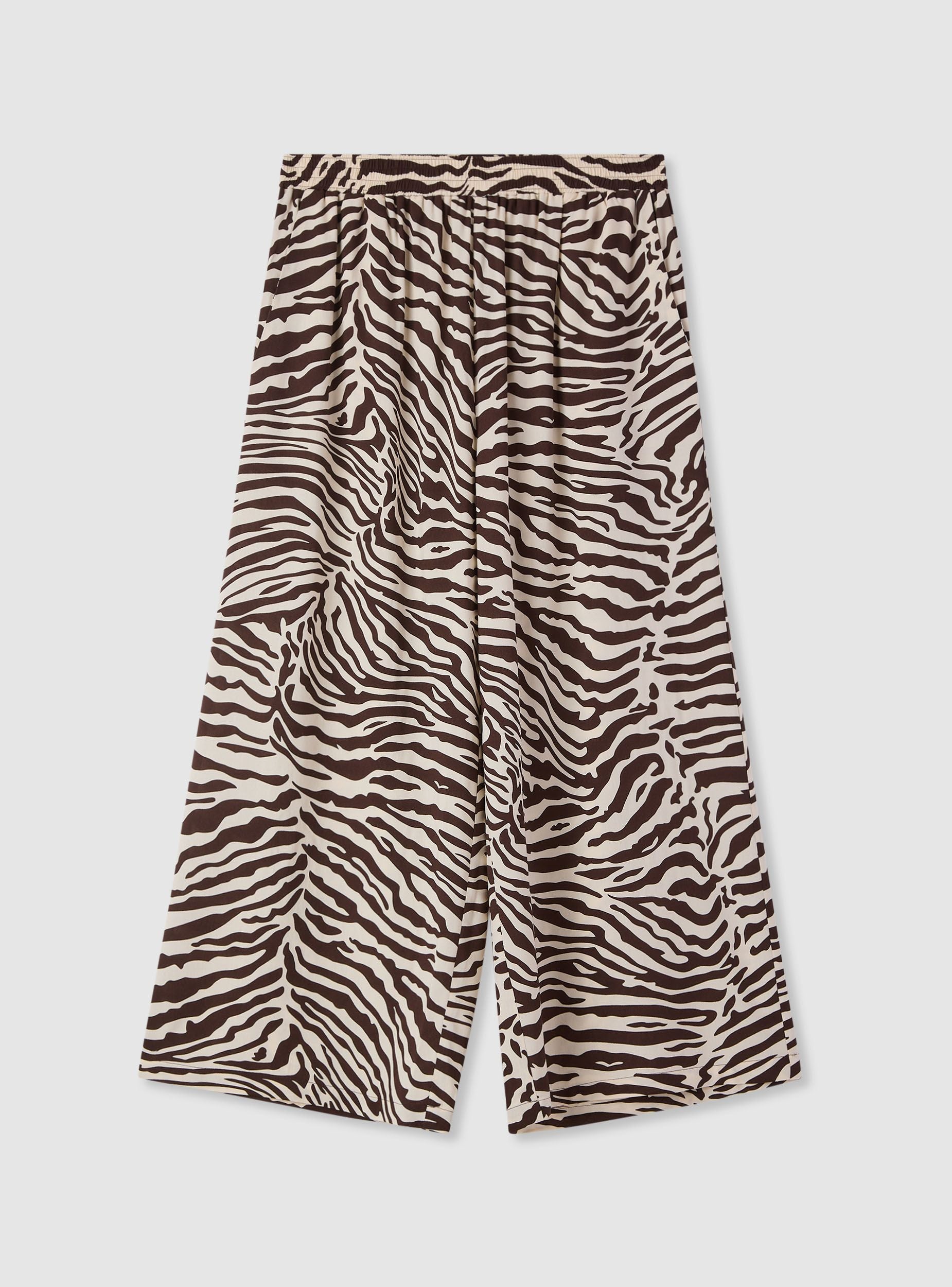 Pantaloni da donna con stampa animalier zebrata, perfetti per look casual e vacanza. Modello cropped a gamba ampia e dritta con vita con elastico e tasche laterali. Ideali con top aderenti o camicie morbide e sandali per outfit leggeri e disinvolti.Dettagli