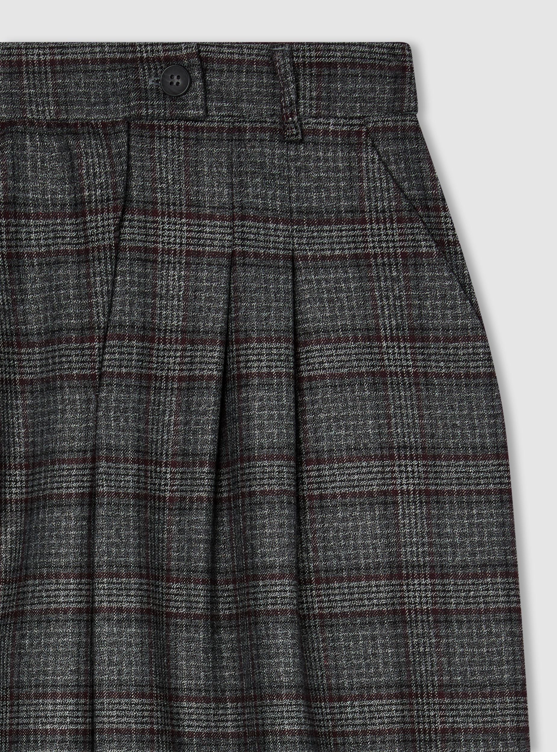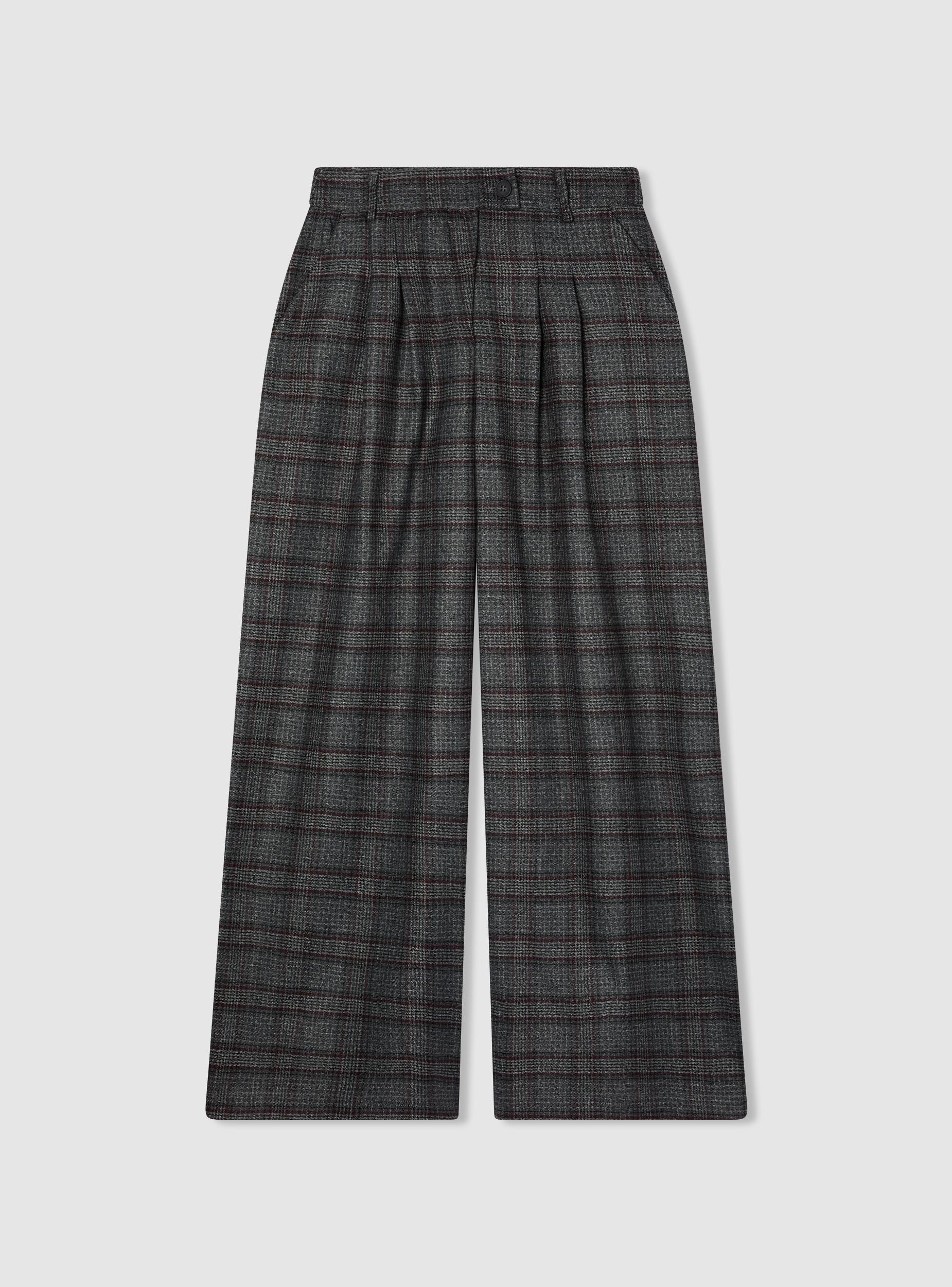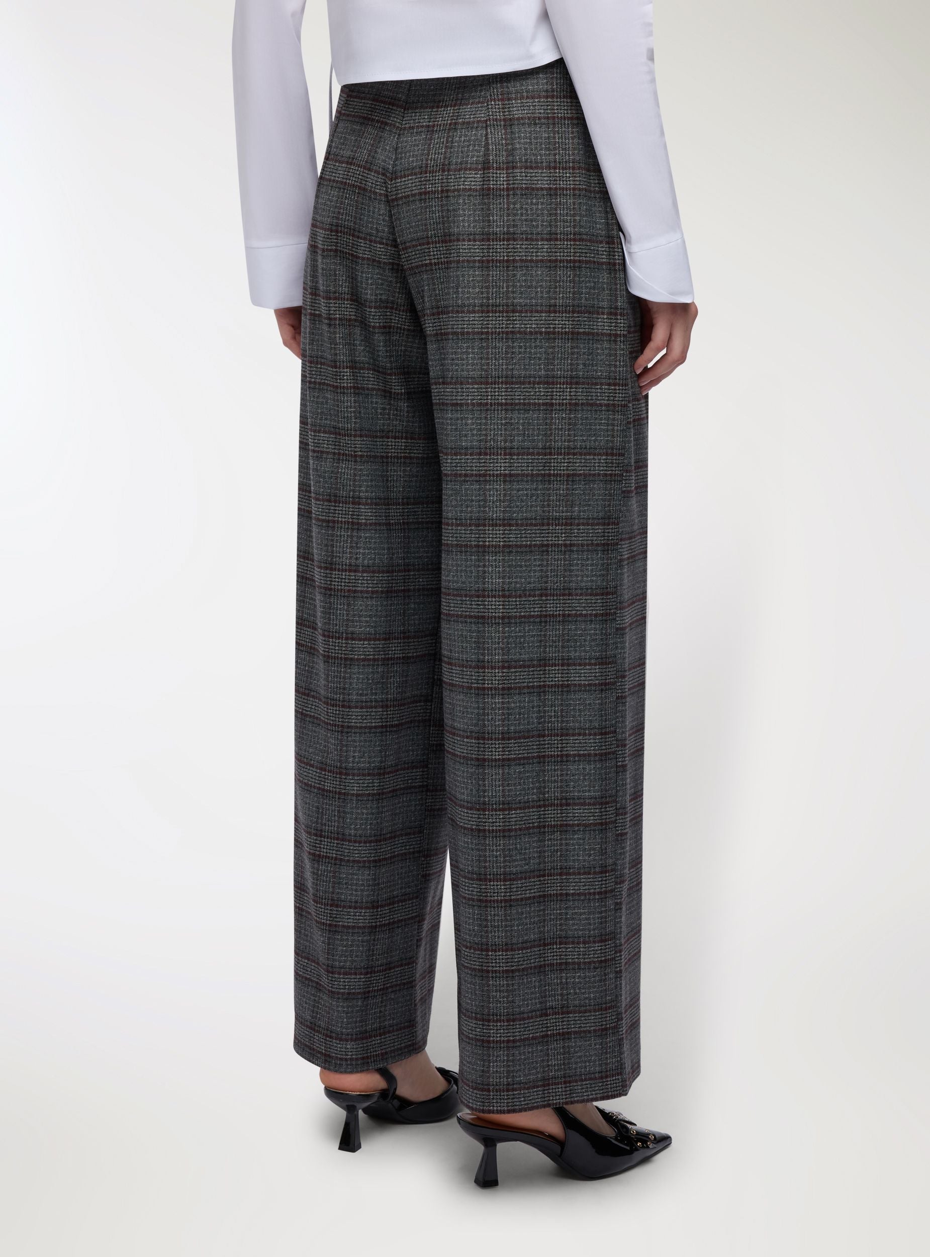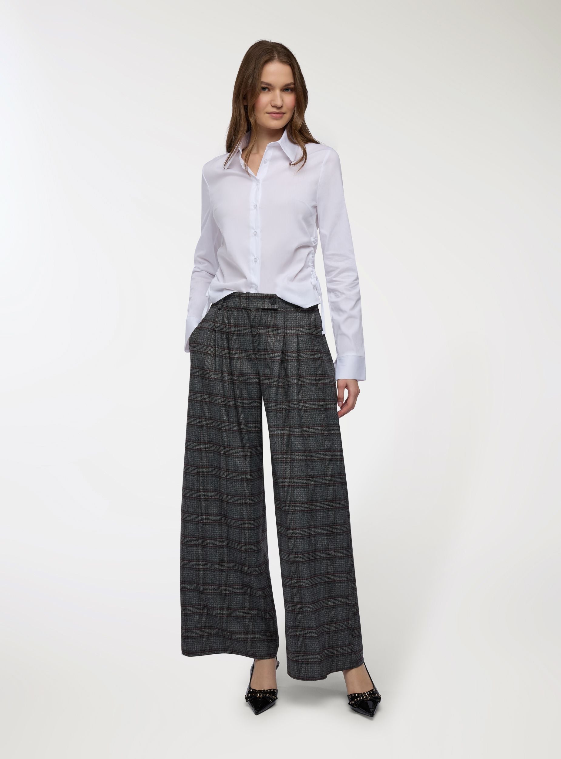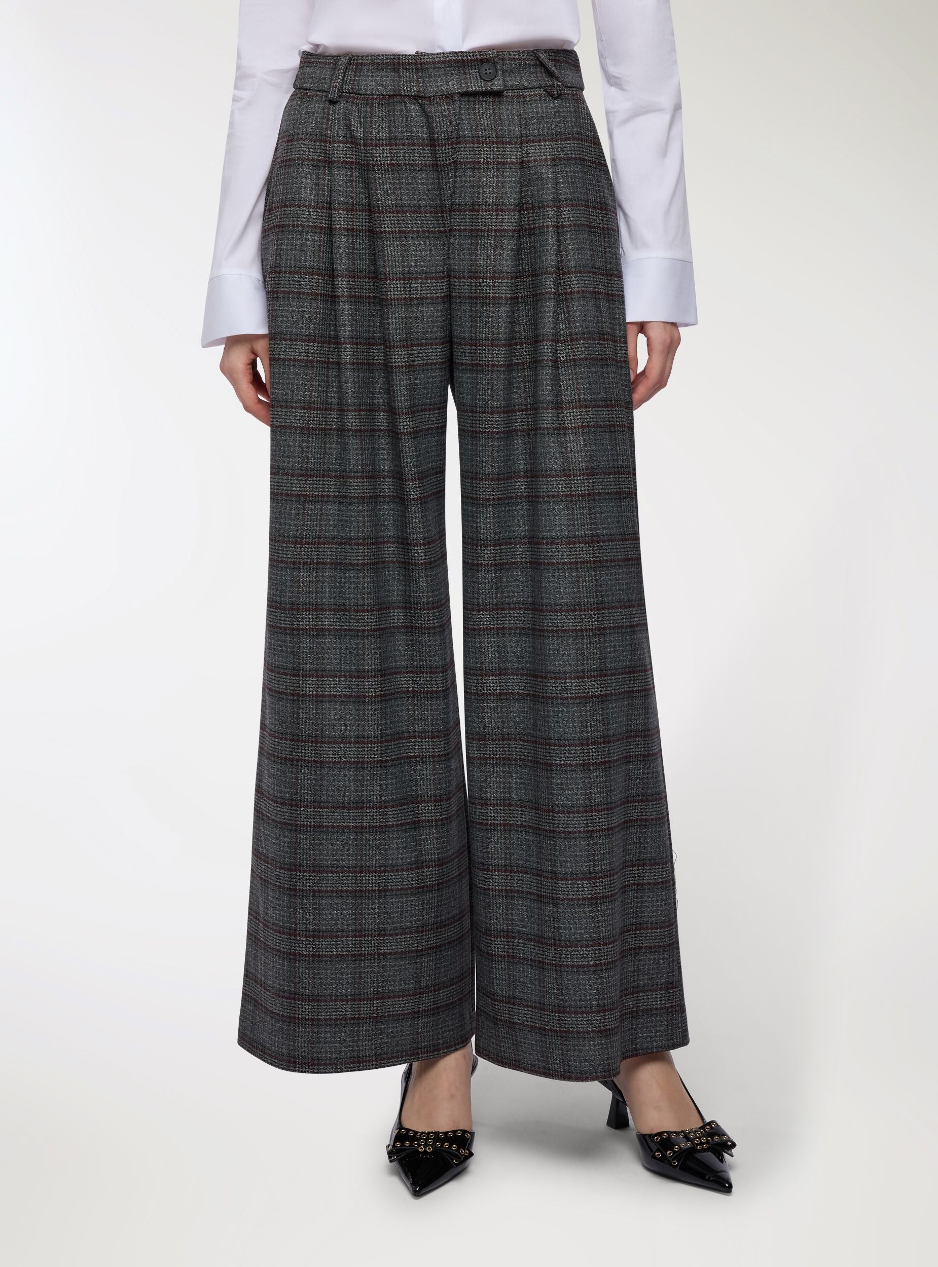 Pantaloni da donna a gamba ampia con fantasia a quadri, ideali per look urban e ufficio. Vita con passanti e chiusura con bottone e zip, pinces frontali per una vestibilità confortevole e linee morbide. Tasche laterali alla francese e lunghezza alla caviglia valorizzano mocassini o stivaletti. Perfetti con camicia e blazer per il lavoro o con maglietta e sneakers nel tempo liberoDettagli
