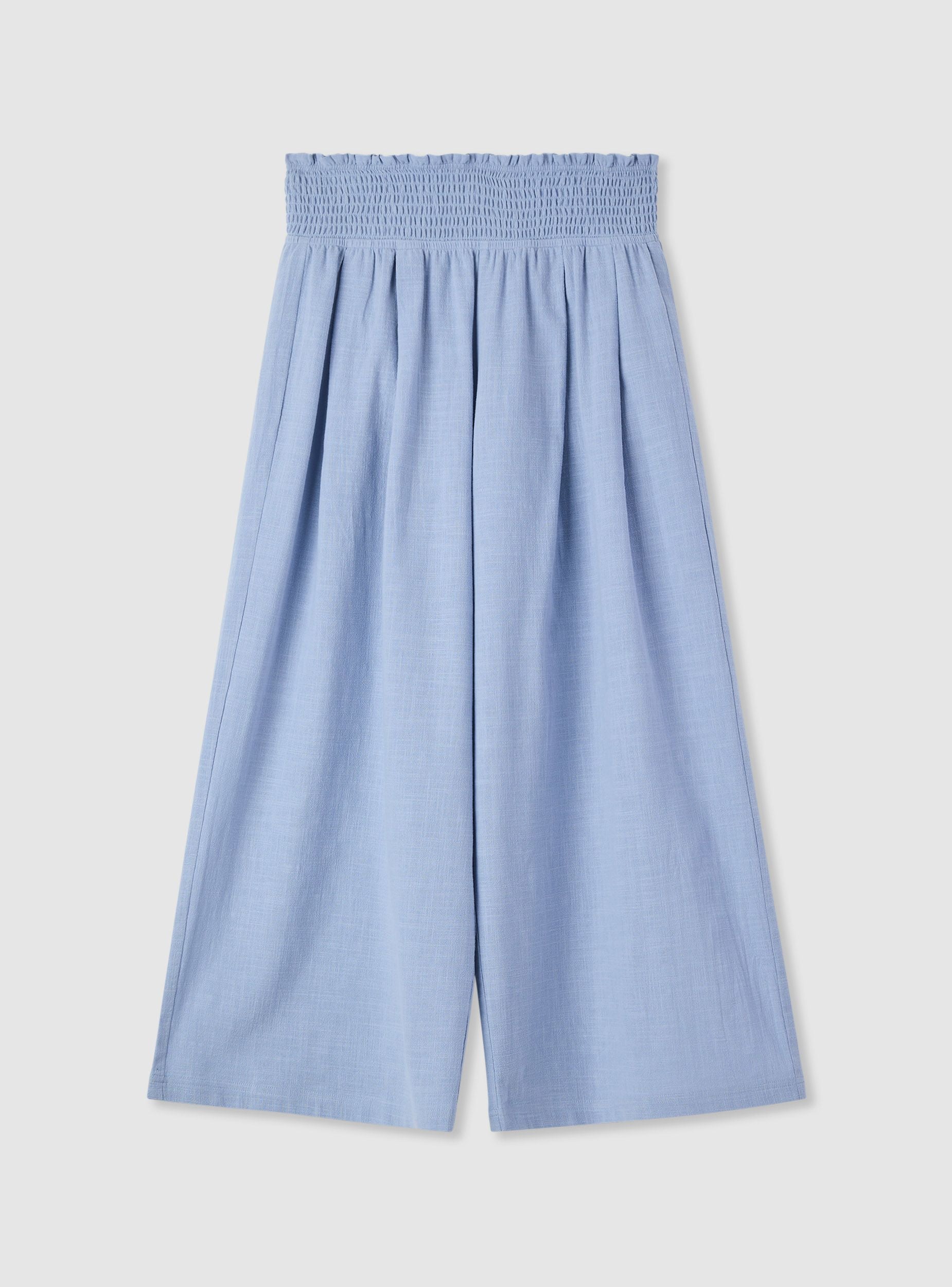 Pantaloni da donna a tinta unita dal taglio crop con gamba ampia, pensati per look freschi e rilassati. La vita alta con fascia arricciata e con elastico assicura comfort e una linea valorizzante. Modello senza chiusura, ideale con top aderenti o camicie morbide e sandali, sneakers o espadrillas per il tempo libero e la città.Dettagli