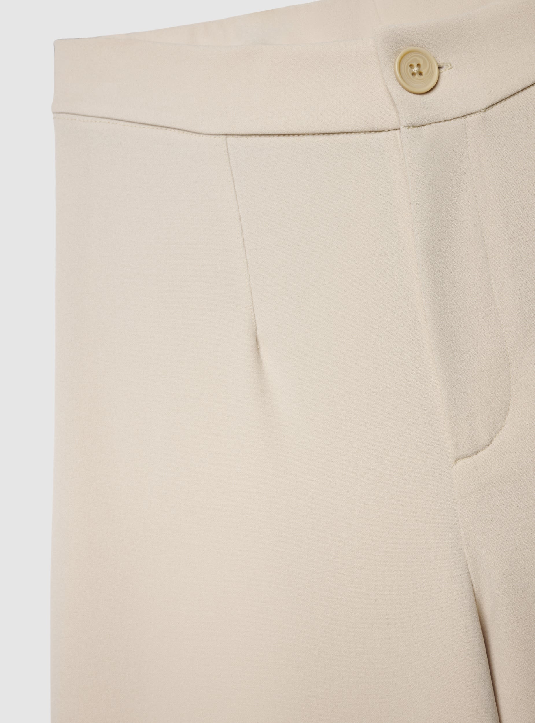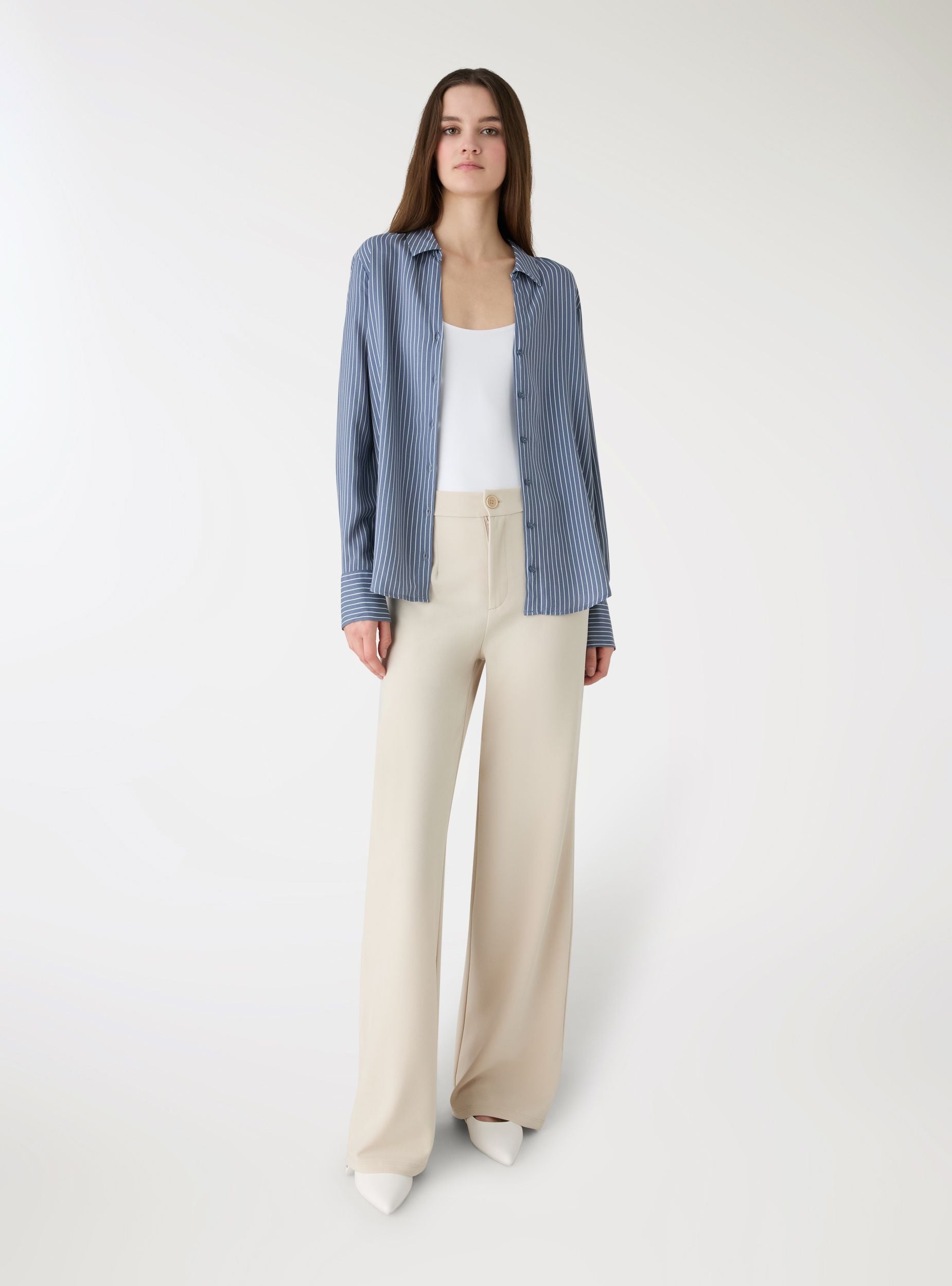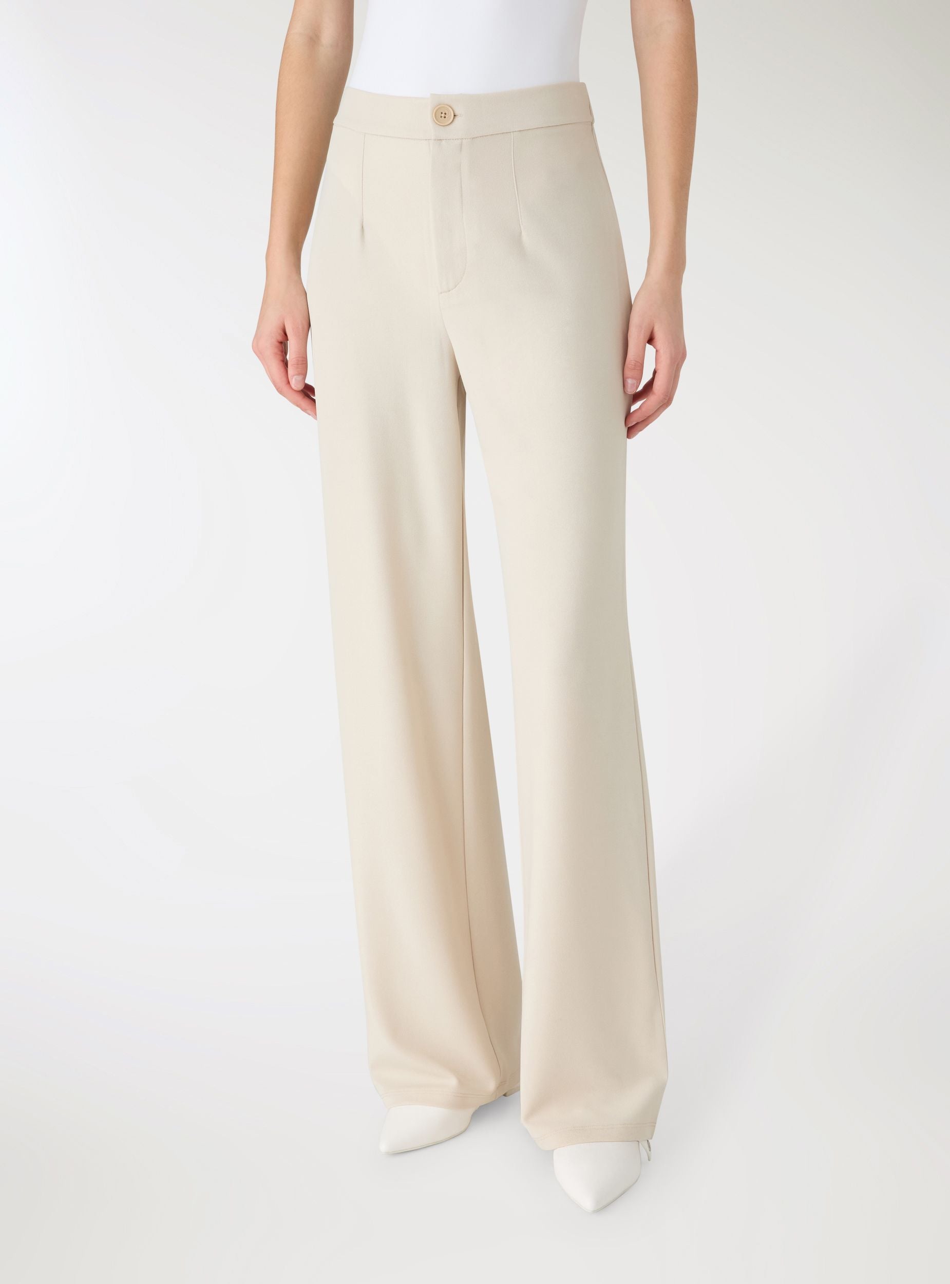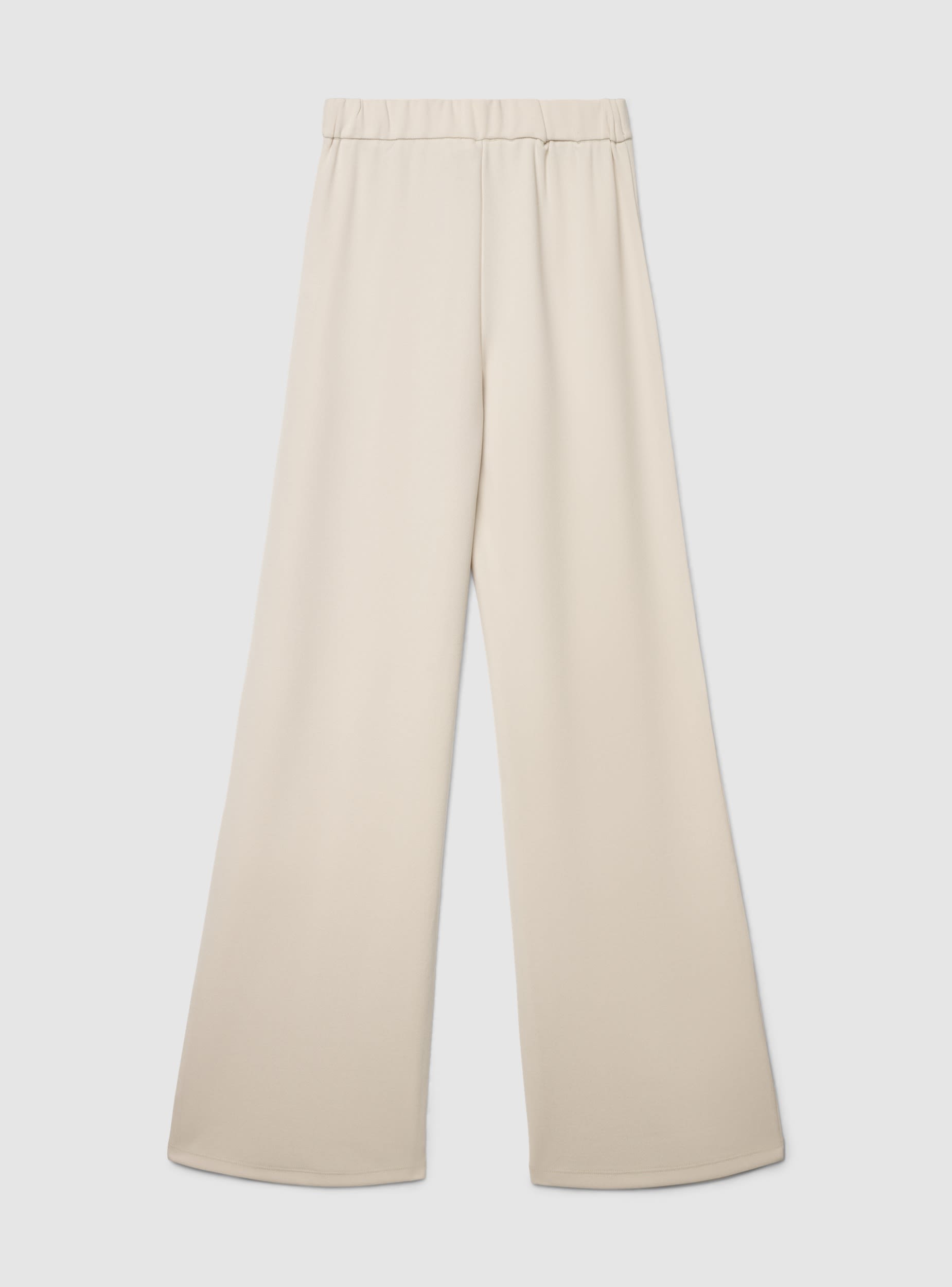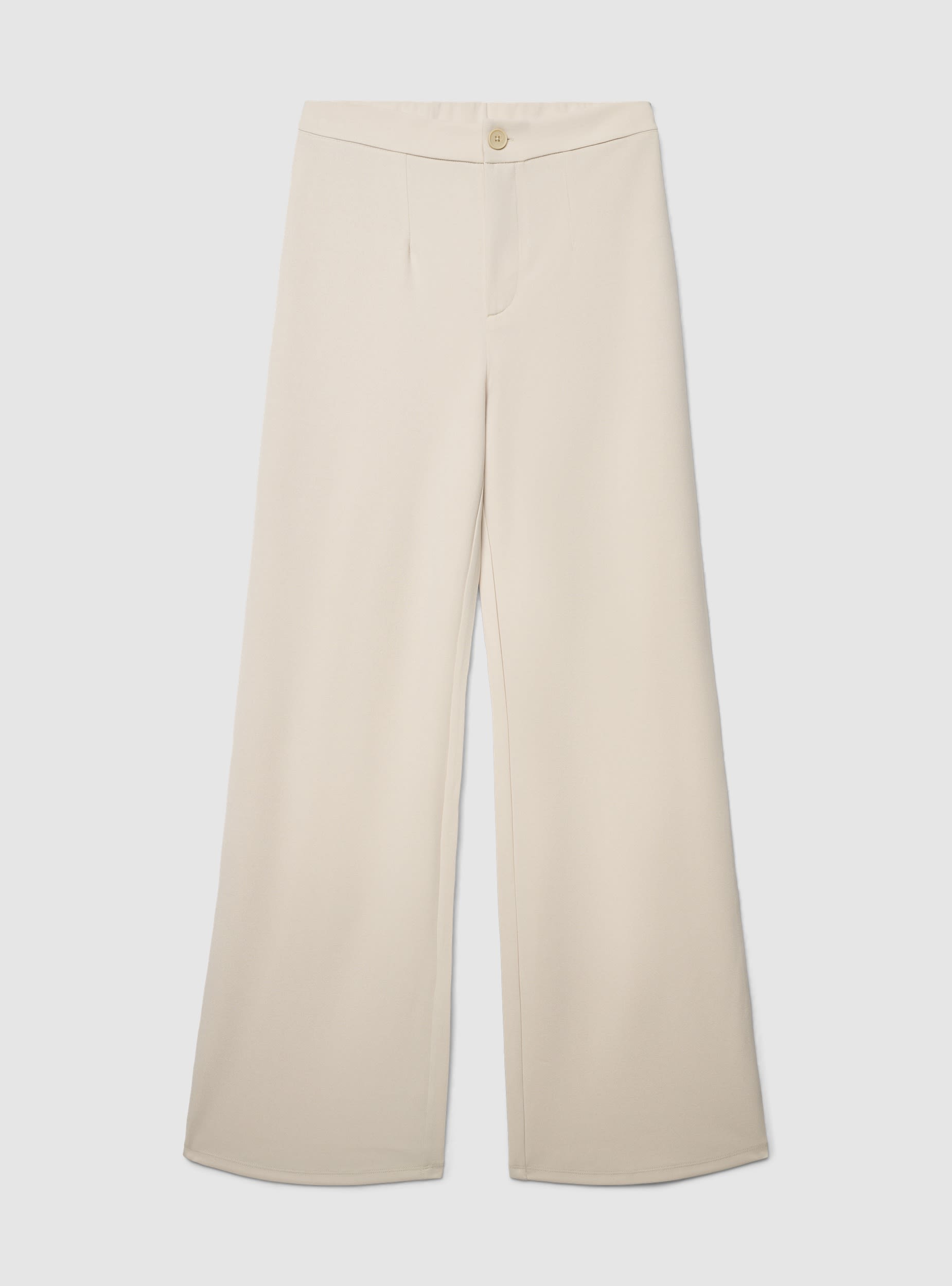 Pantaloni da donna a tinta unita con linea wide leg. Chiusura frontale con bottone e zip, retro elasticizzato per maggiore comfort. Ideale per ufficio, eventi informali o serate. Si abbinano a camicie o top aderenti e blazer per look curati. Vestibilità regolare con gamba ampia che slancia la figura.Dettagli