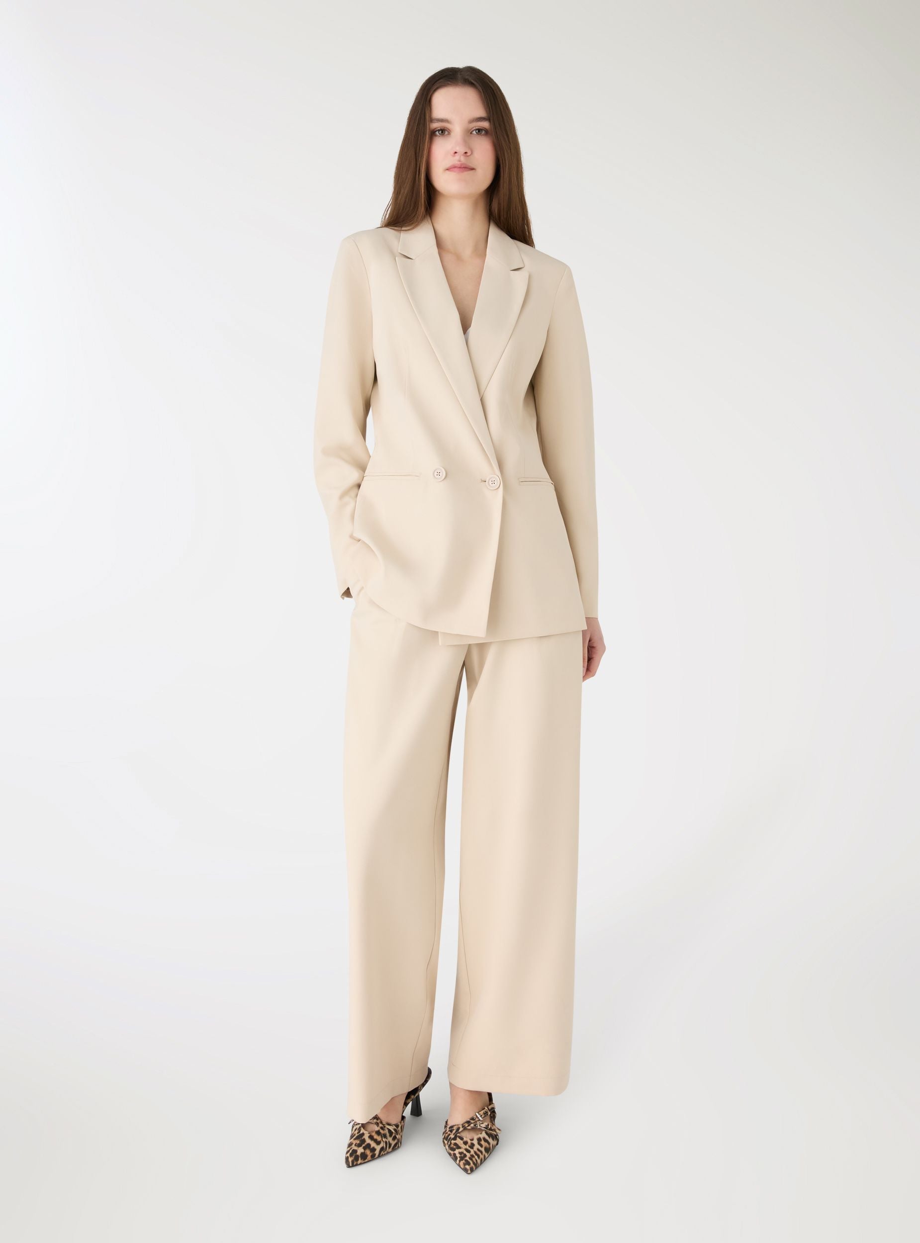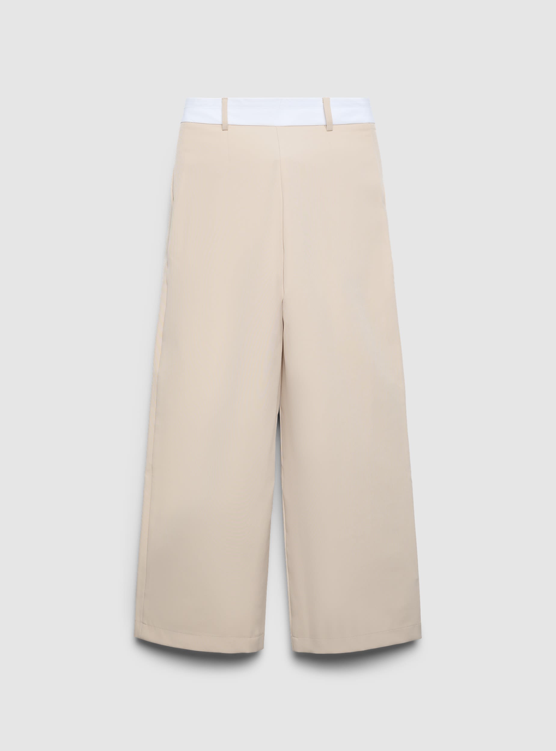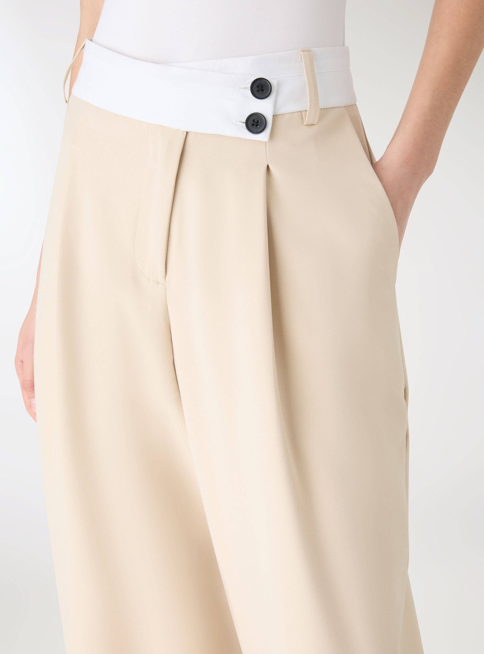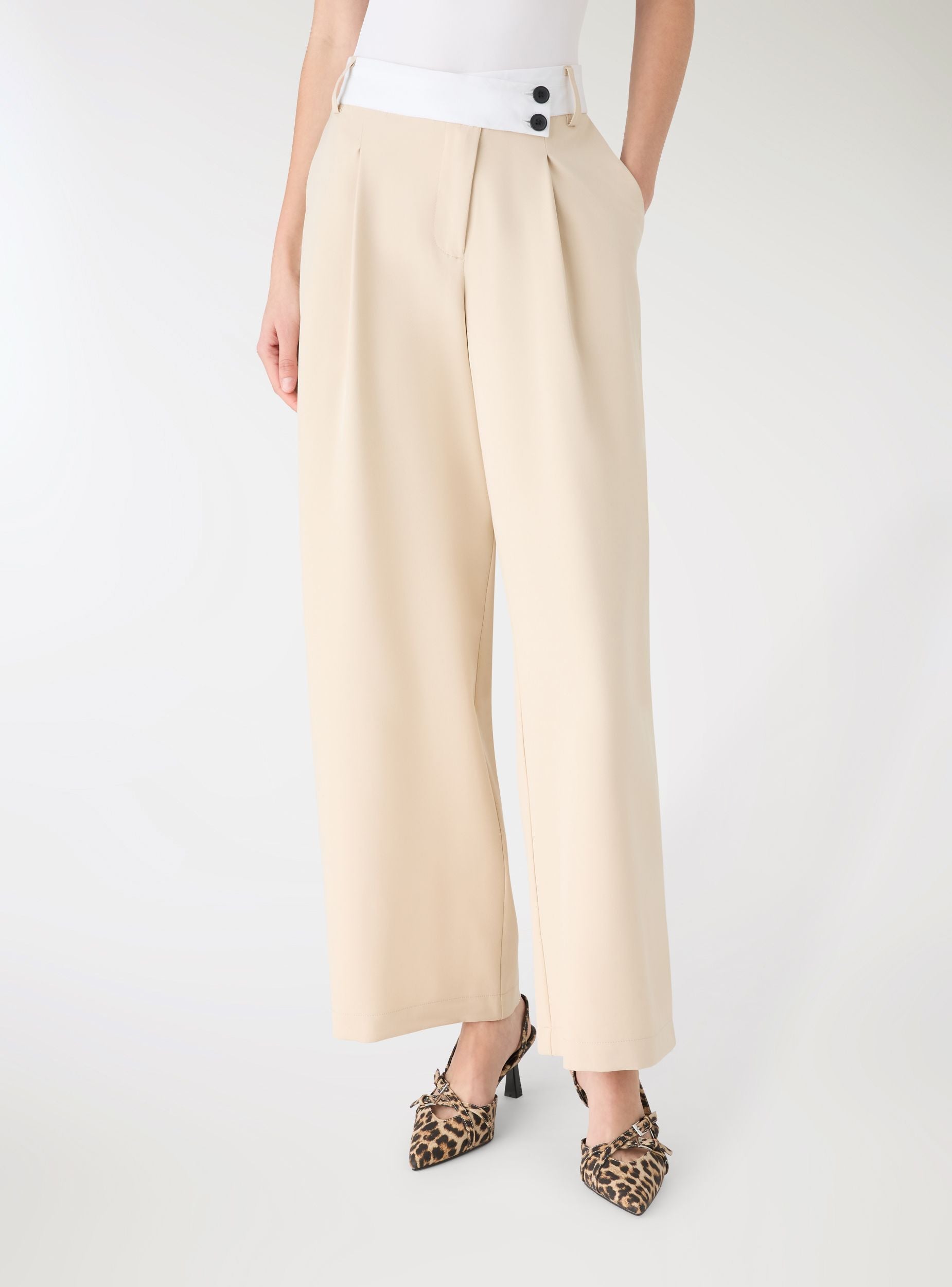 Pantaloni da donna a tinta unita con linea wide leg e vita evidenziata da fascia a contrasto con chiusura a doppi bottoni. Il taglio lungo e la gamba ampia con pieghe frontali valorizzano la figura e offrono comfort. Presenza di passanti per cintura e tasche laterali pratiche. Ideali per l’ufficio con camicia e blazer o per il tempo libero con top e sneakers, per look versatili dal tocco contemporaneo.Dettagli
