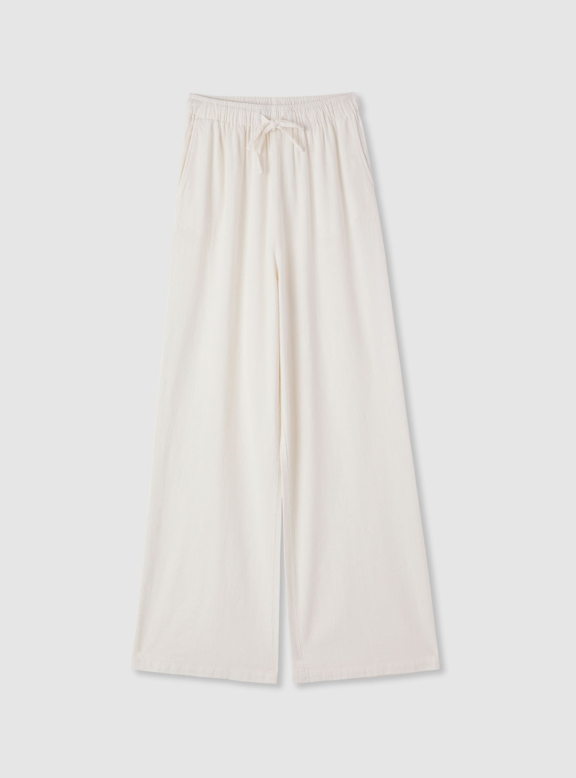 Pantaloni lunghi da donna in tessuto cotone a tinta unita, perfetti per il tempo libero e look casual. Modello wide leg con vestibilità confortevole e vita elasticizzata regolabile tramite coulisse. Presentano tasche laterali a filetto e linea morbida che cade dritta fino alla caviglia. Facili da abbinare a maglietta e sandali o a una camicia leggera per outfit rilassati dalla silhouette ariosa.Dettagli