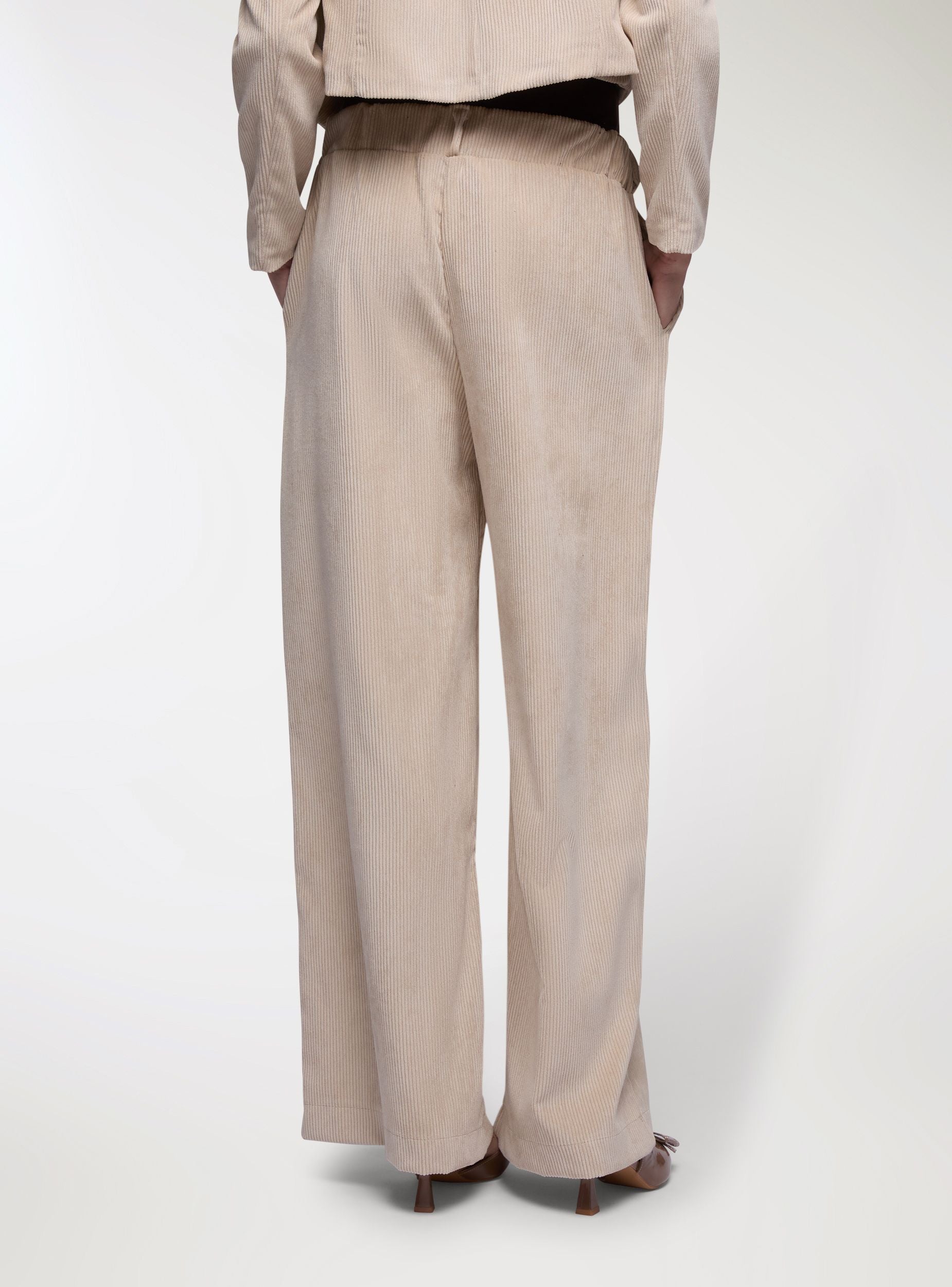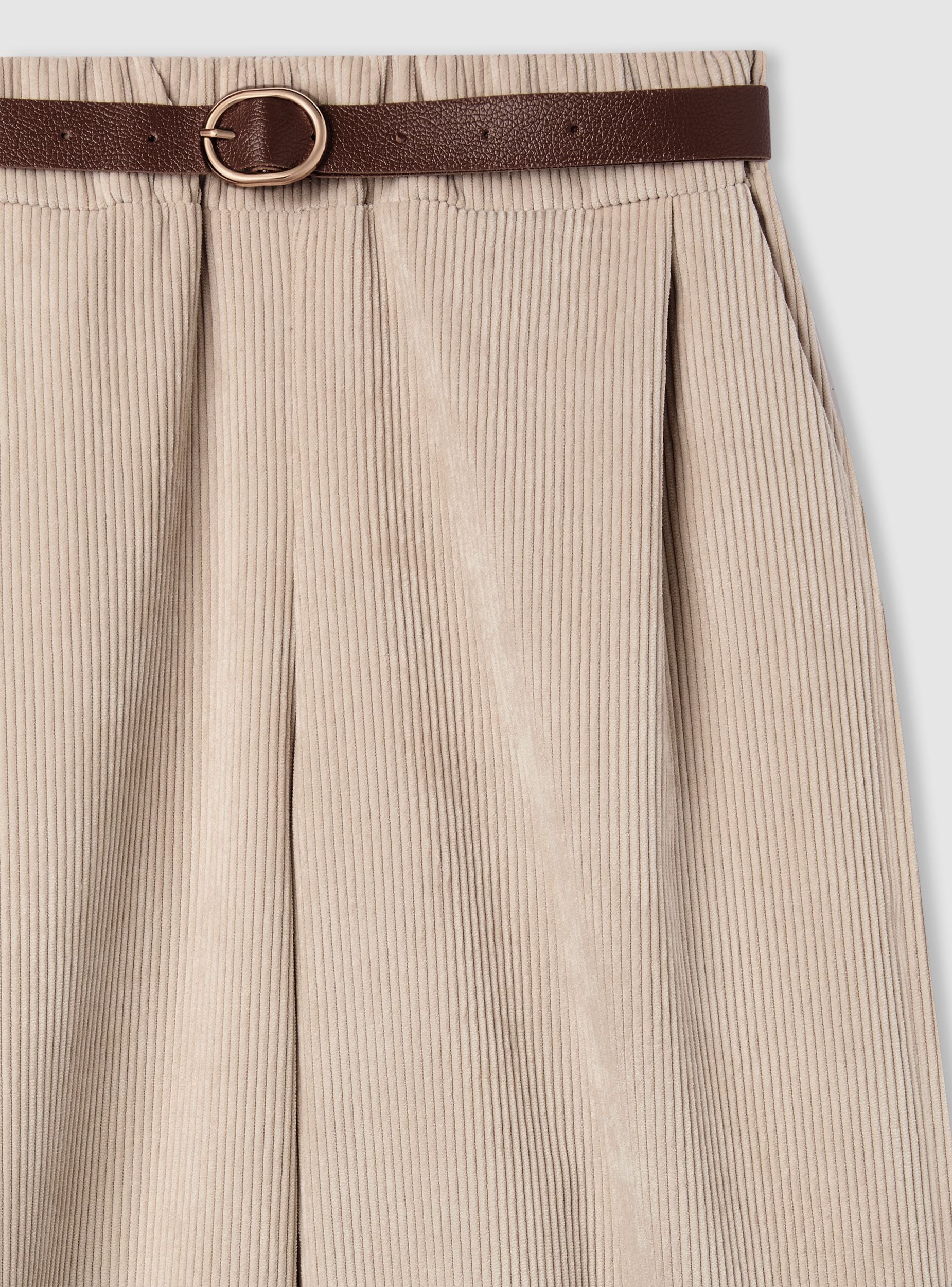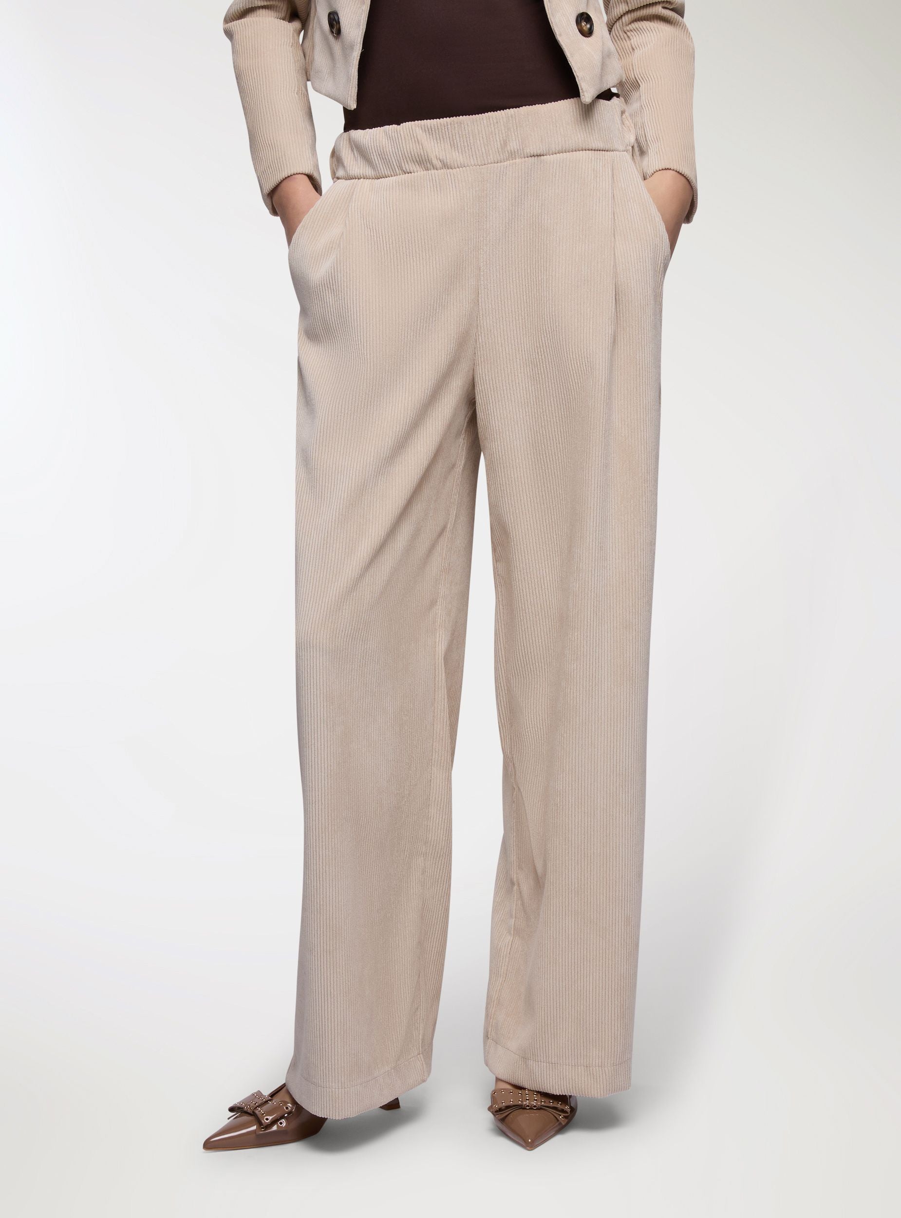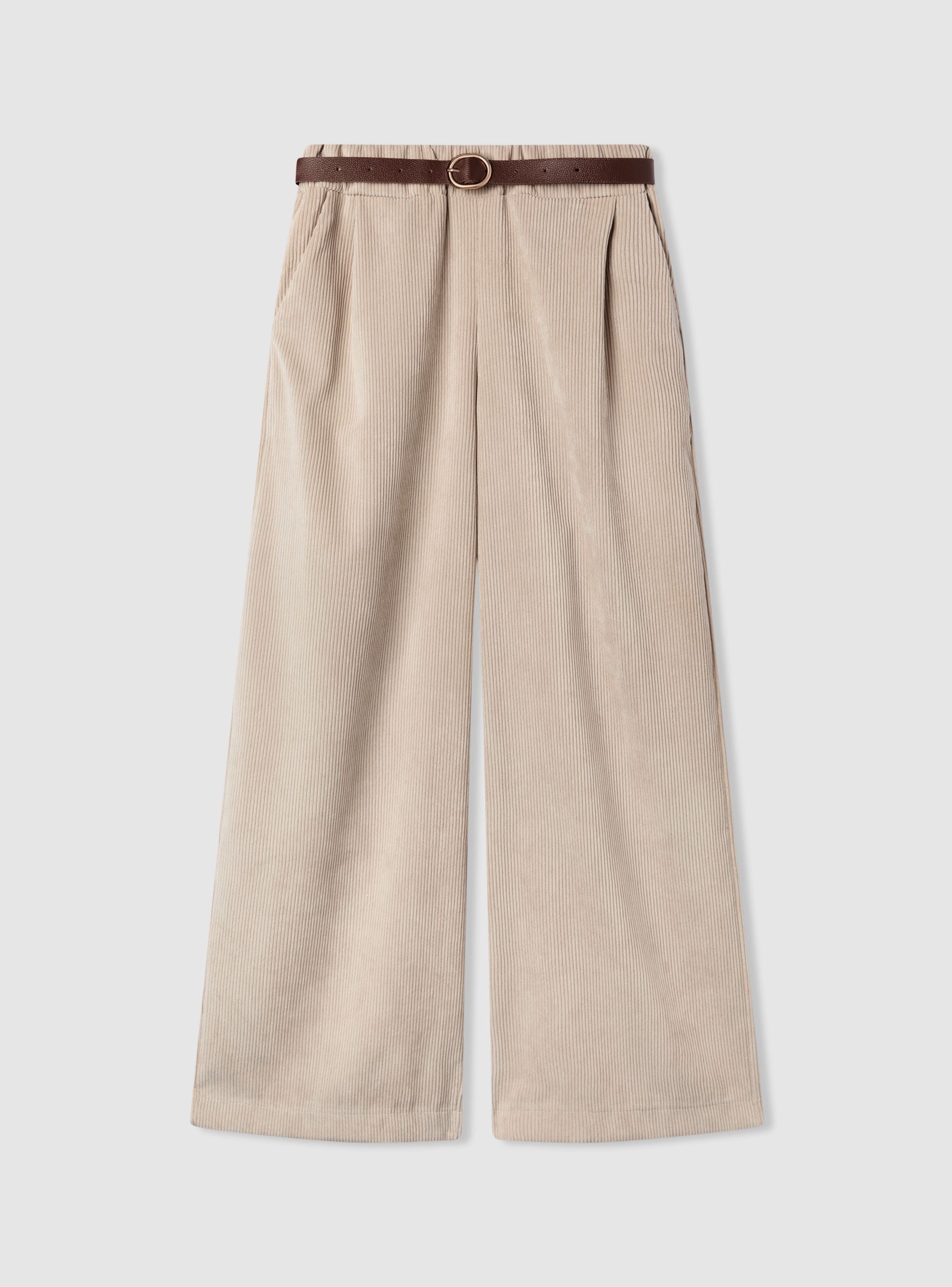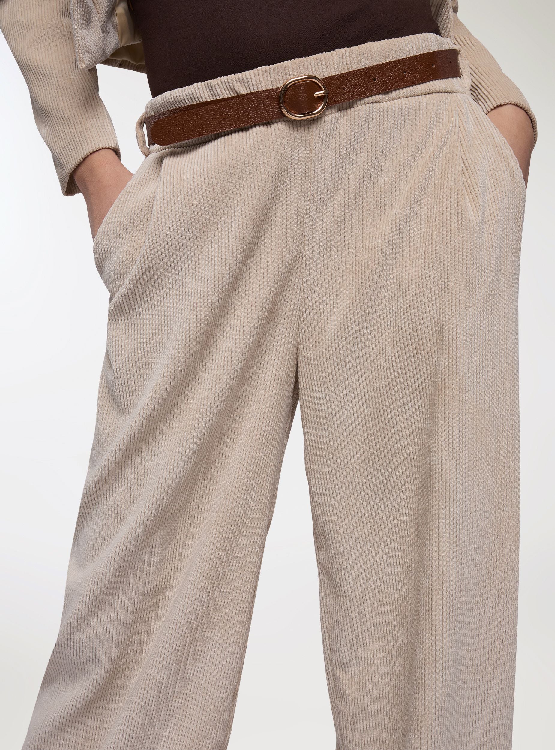 Pantaloni lunghi da donna a tinta unita con linea wide leg e pinces frontali che valorizzano la vestibilità morbida. Vita con passanti e cintura inclusa con fibbia rotonda, comodi da indossare tutto il giorno. Tessuto effetto velluto a costine. Tasche laterali per un tocco pratico. Facili da abbinare a camicie e stivaletti per l’ufficio o a maglioni e mocassini nel tempo libero, donano un look curato e versatile.Dettagli