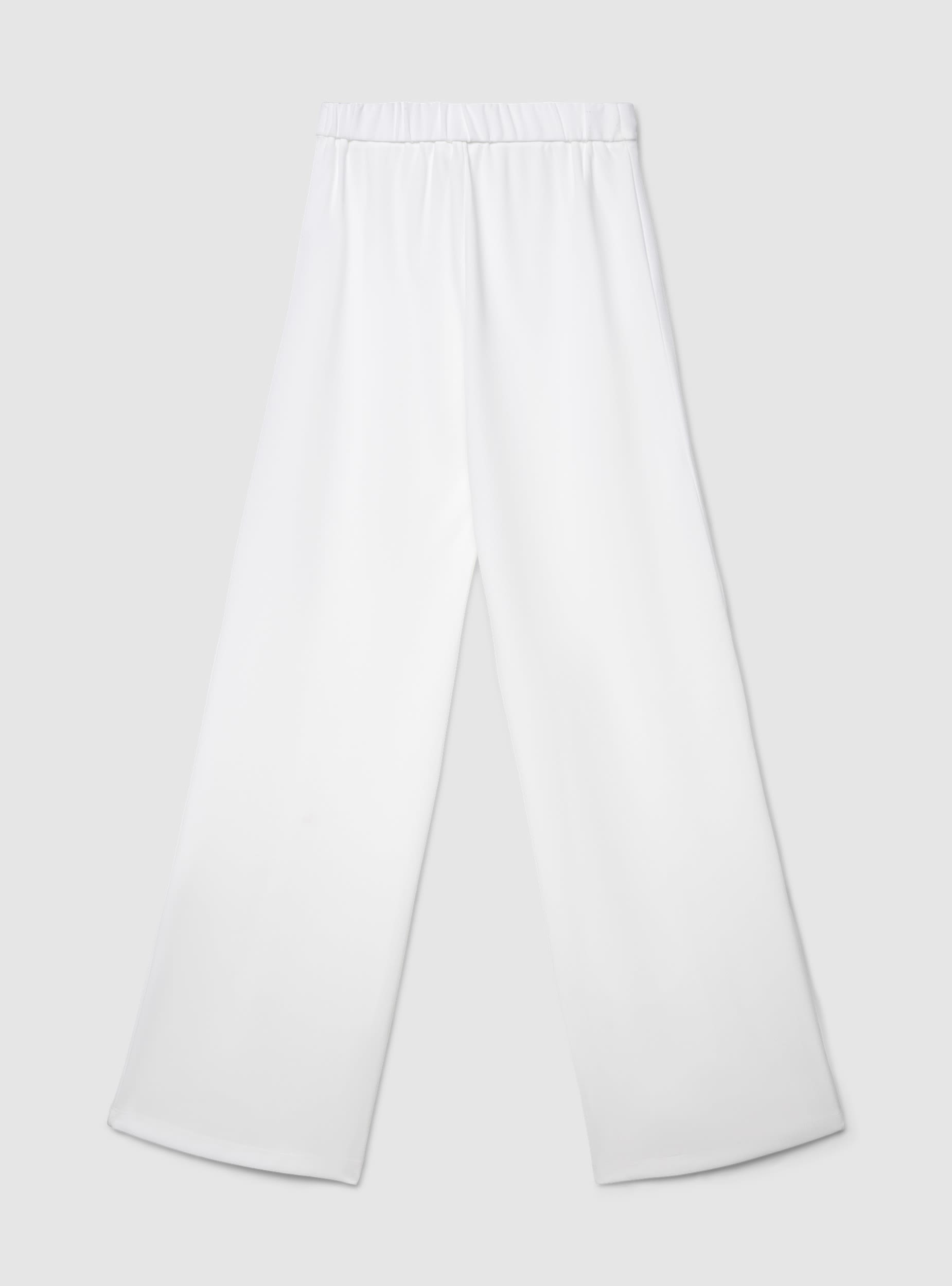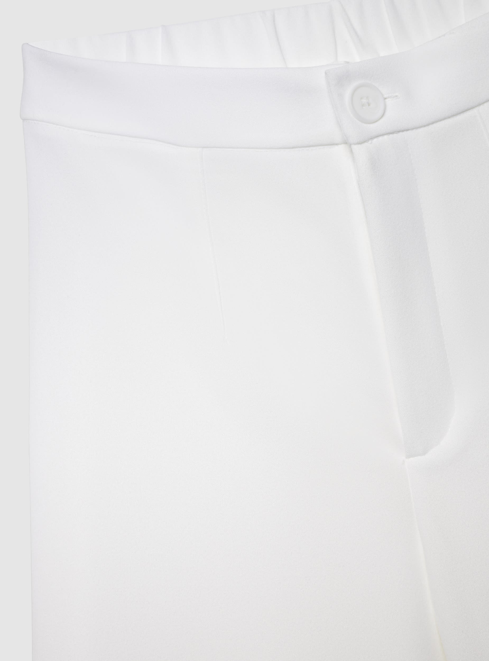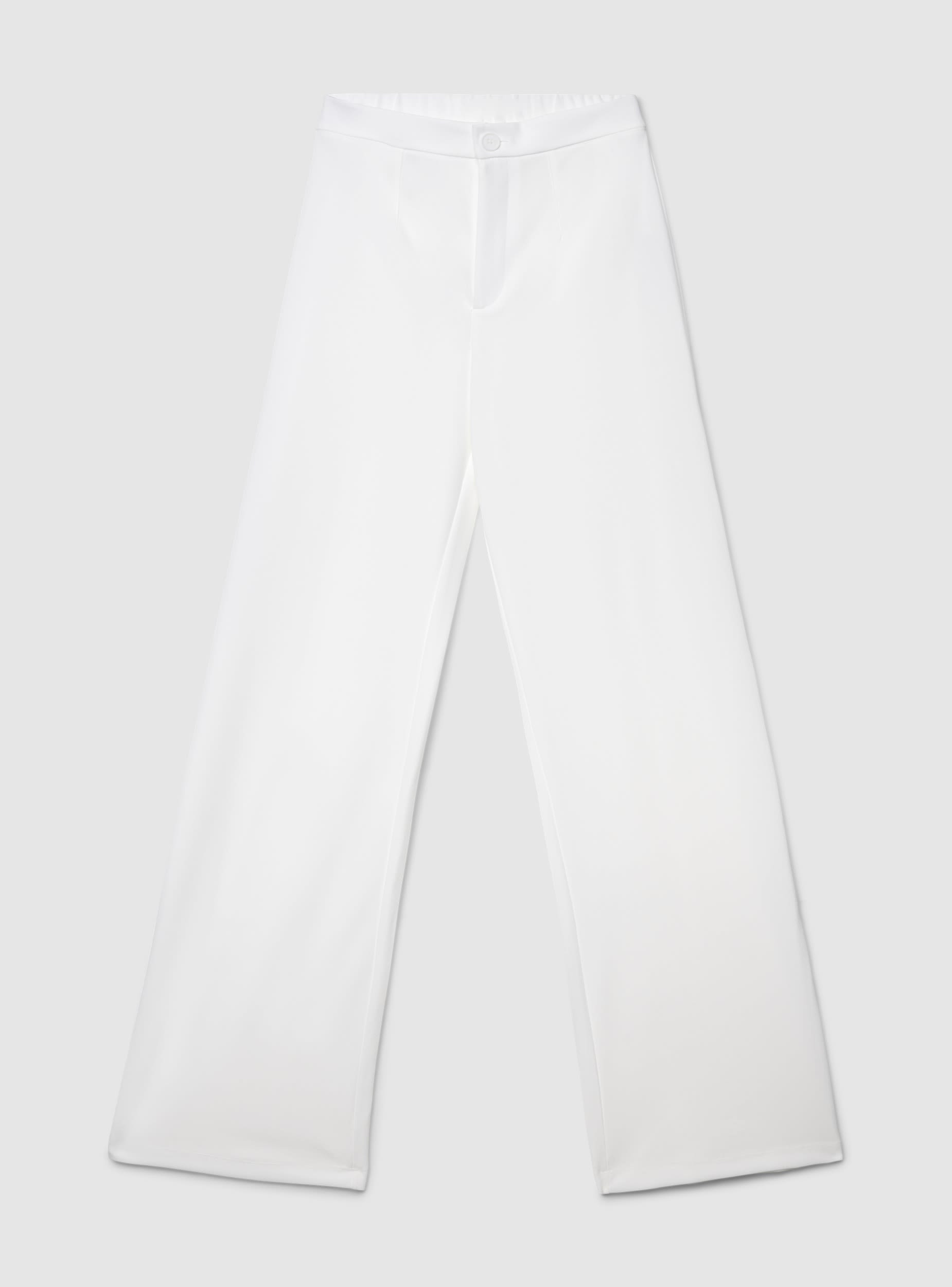 Pantaloni da donna a tinta unita con linea wide leg. Chiusura frontale con bottone e zip, retro elasticizzato per maggiore comfort. Ideale per ufficio, eventi informali o serate. Si abbinano a camicie o top aderenti e blazer per look curati. Vestibilità regolare con gamba ampia che slancia la figura.Dettagli