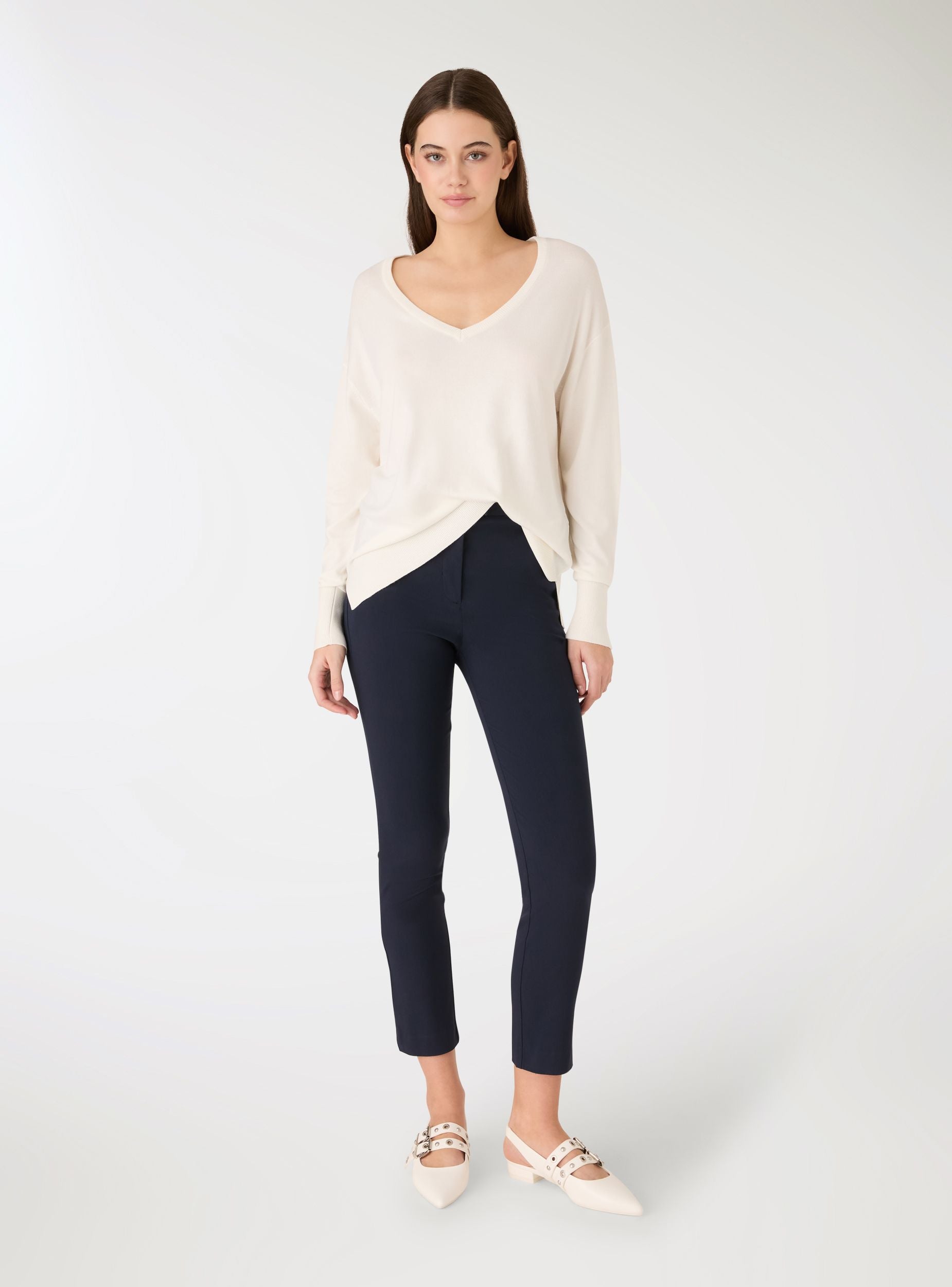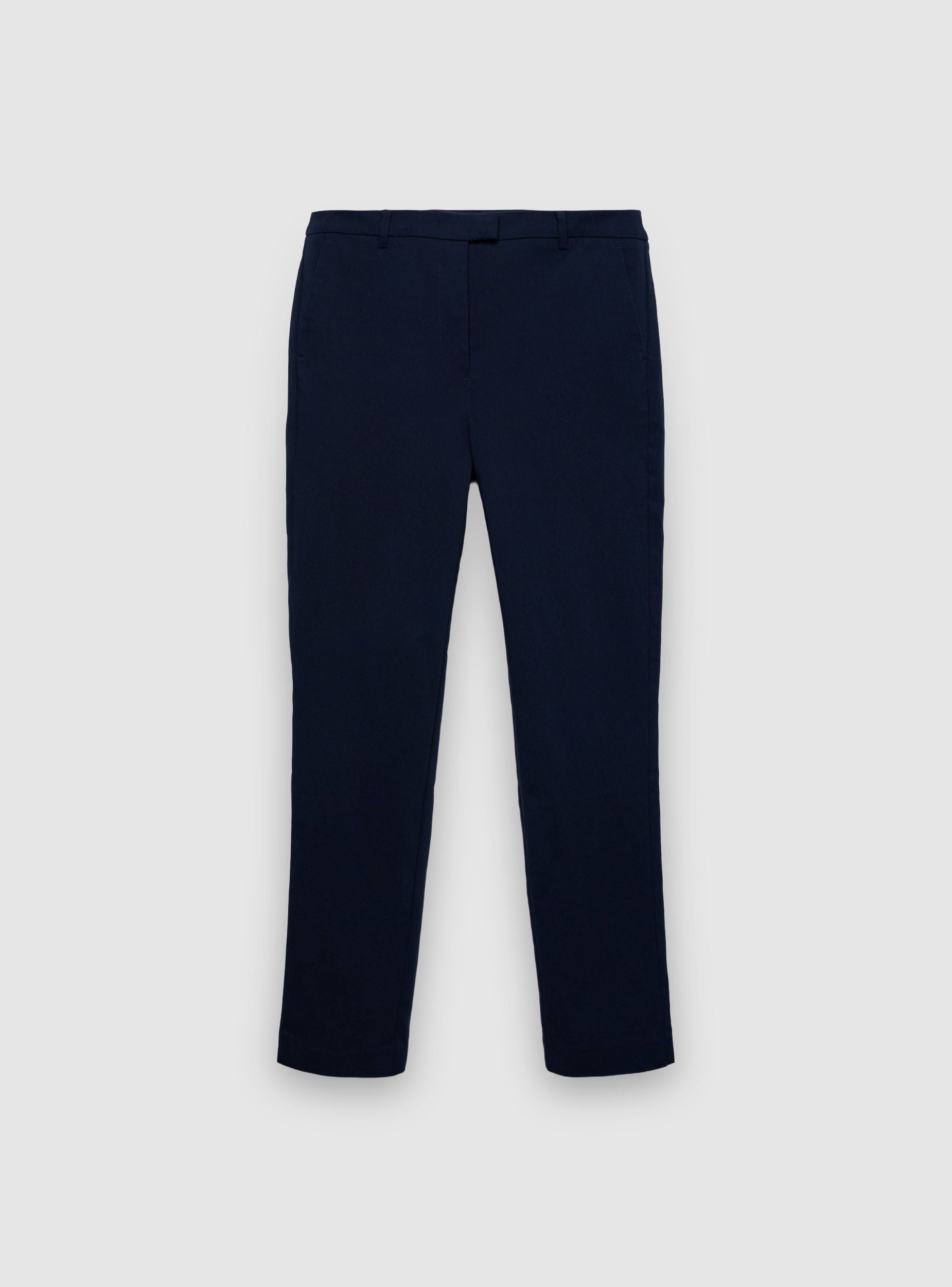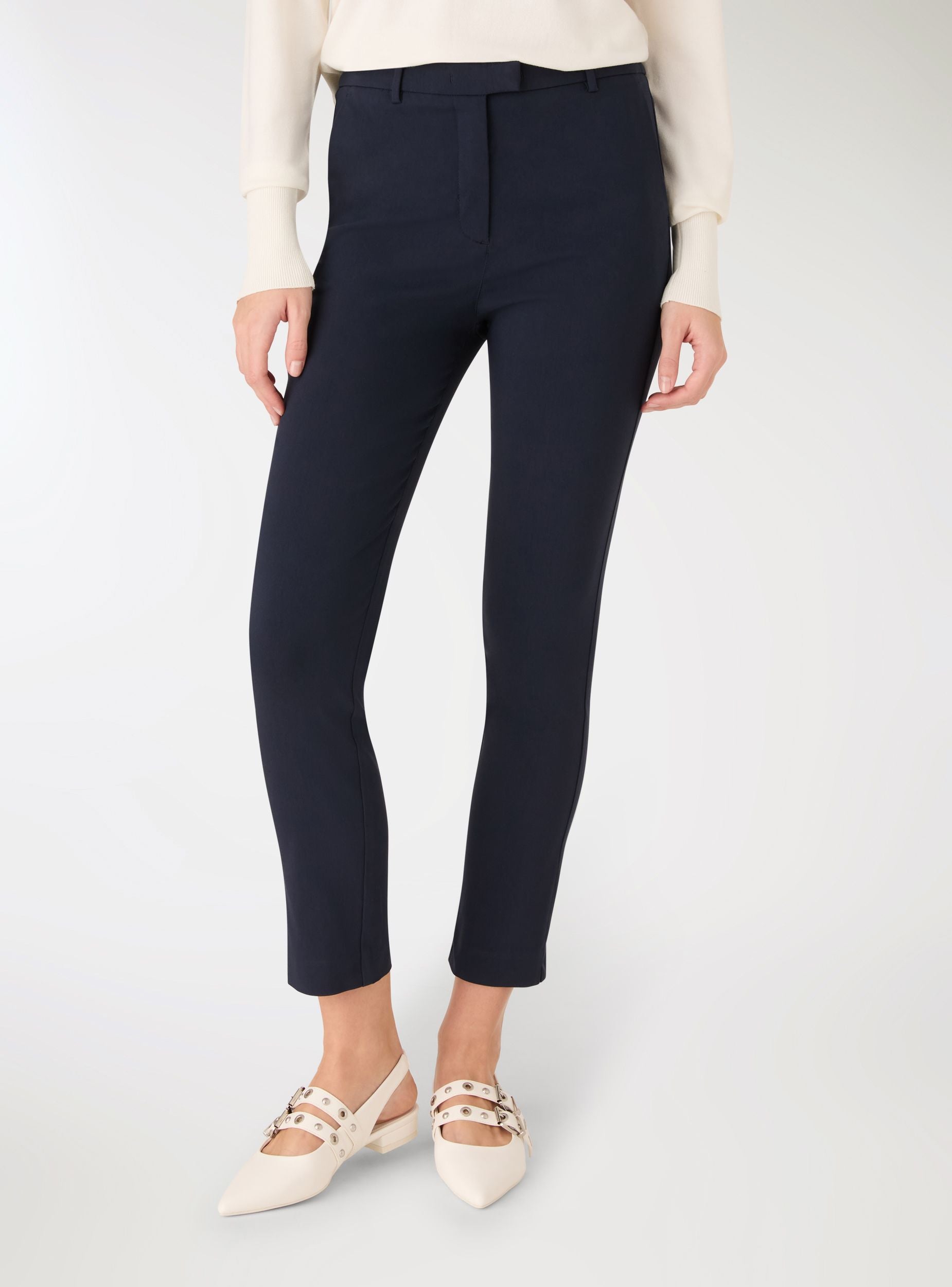 Pantaloni da donna in tinta unita, perfetti per l’ufficio e gli outfit quotidiani. Modello lungo con vestibilità skinny e passanti per cintura. Chiusura frontale con gancio e cerniera nascosta, tasche alla francese ai lati e tasche a filetto sul retro per un tocco pulito. Facili da abbinare a camicie e blazer per un look formale, oppure a maglietta e sneakers per un’impronta casual curata.Dettagli