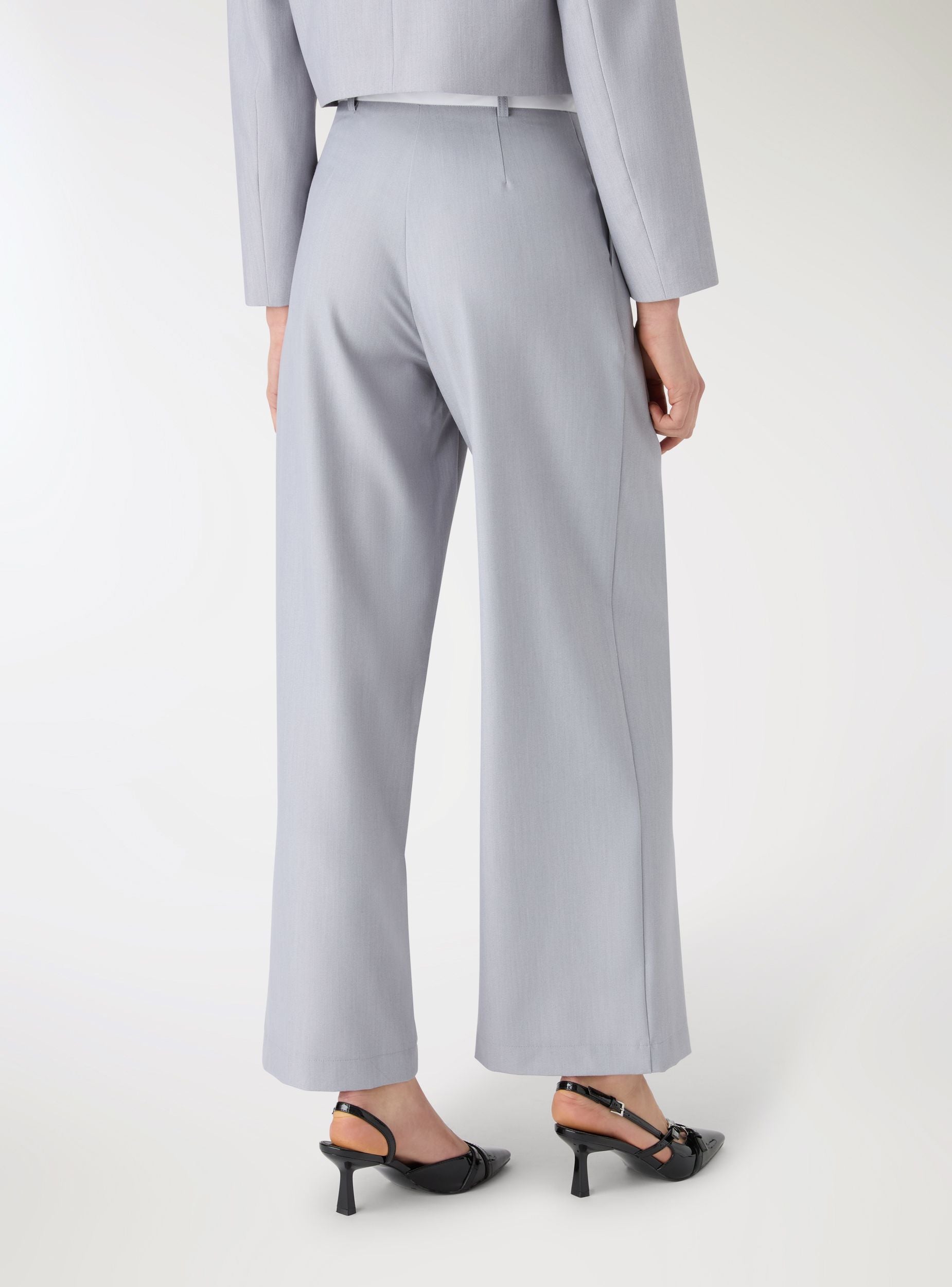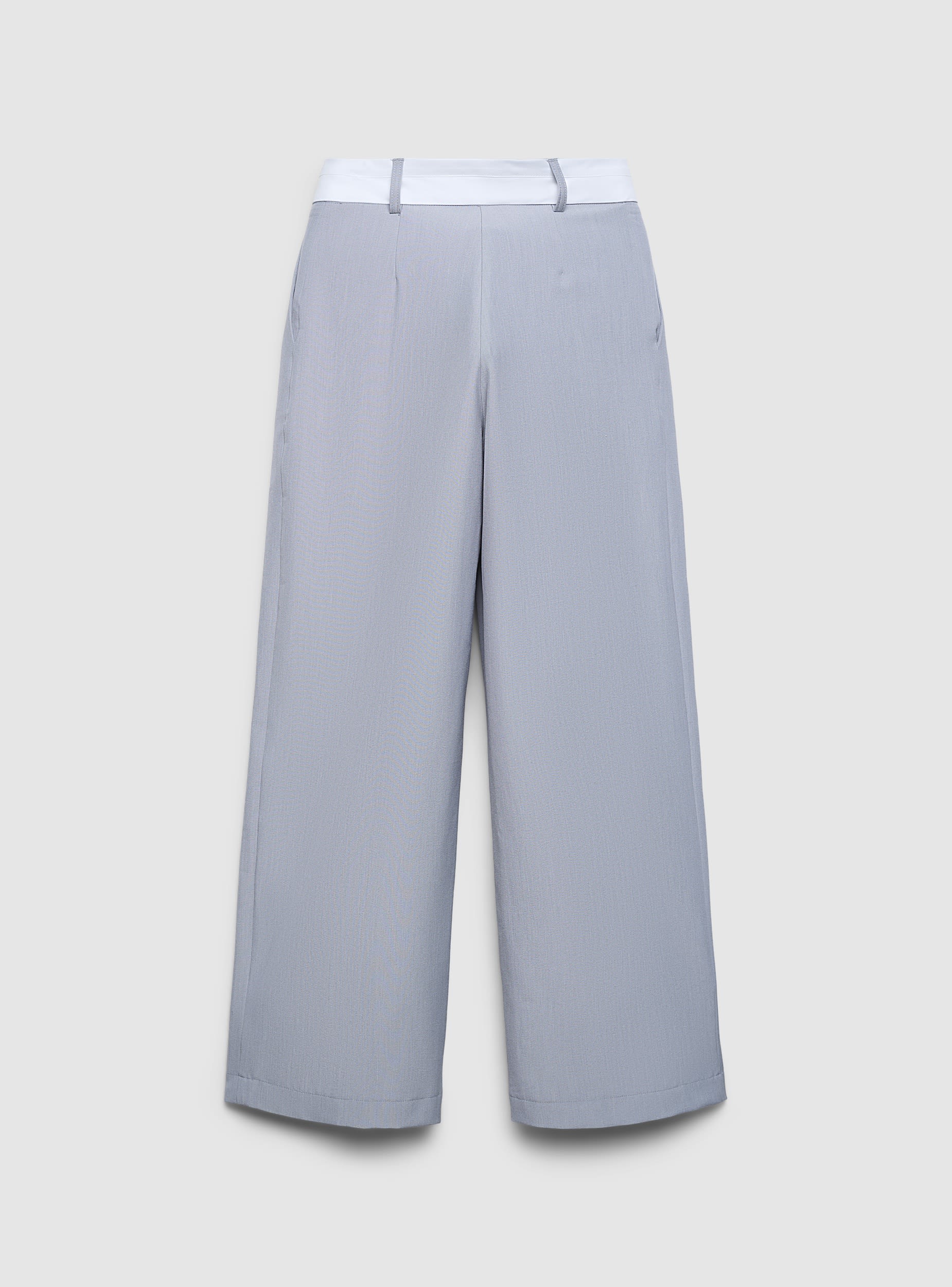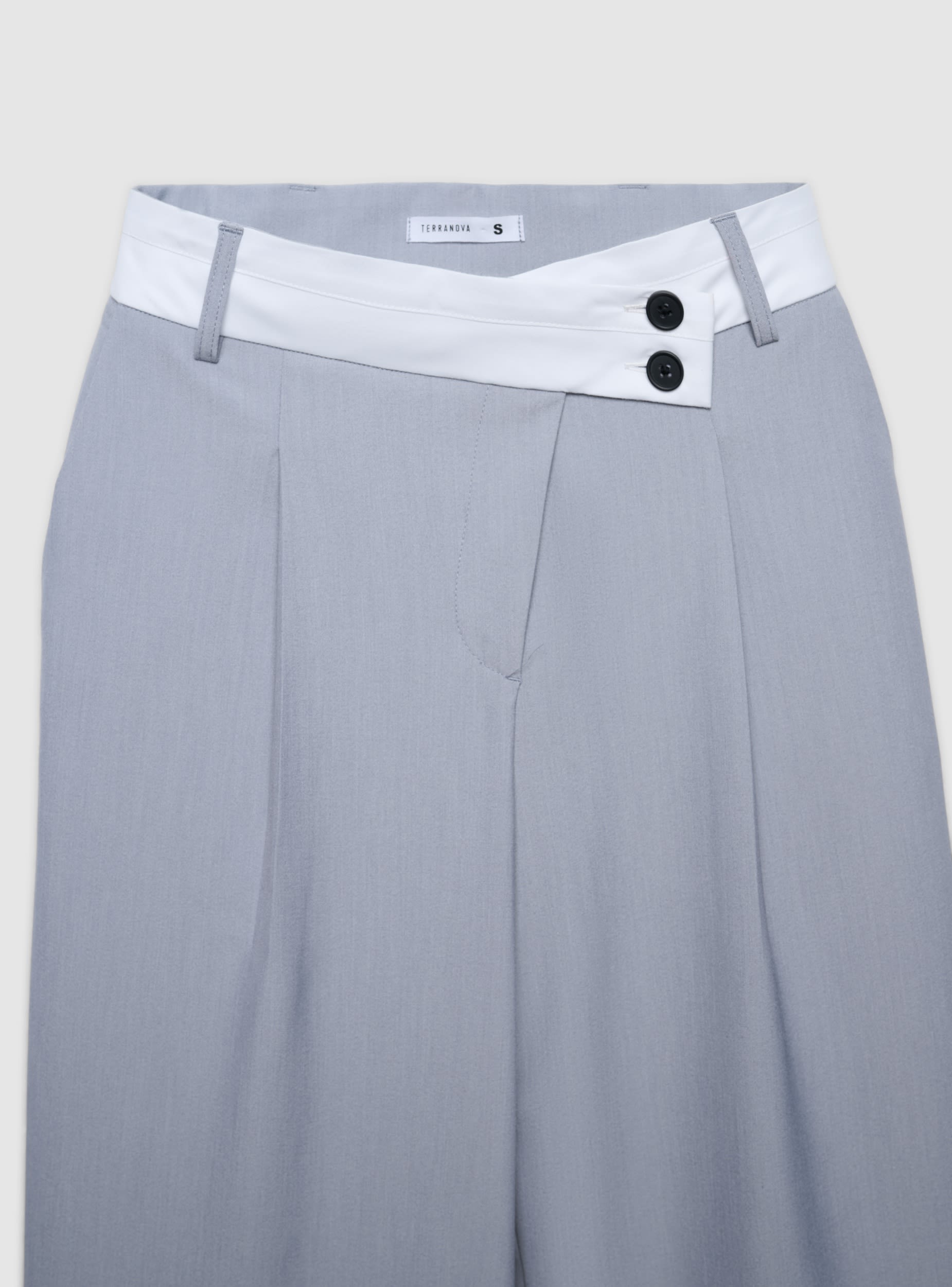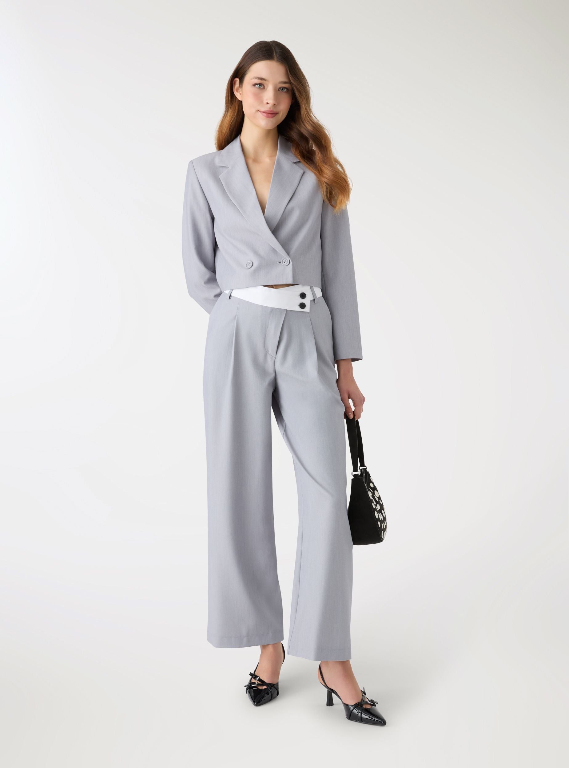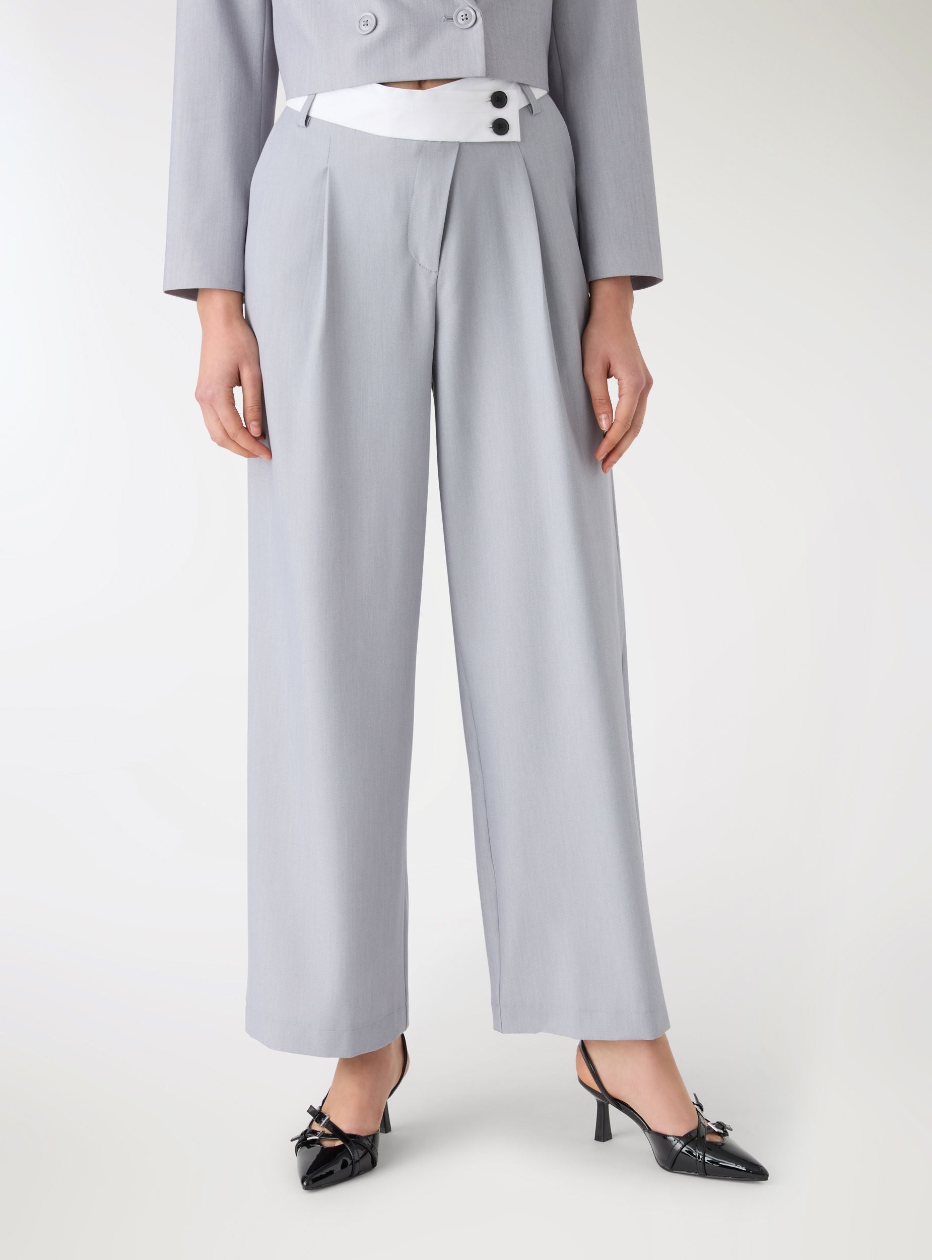 Pantaloni da donna a tinta unita con gamba ampia e linea dritta, perfetti per look casual o urban chic. Vita con fascia a contrasto e doppio bottone laterale, passanti per cintura e piega frontale che valorizza la vestibilità. Tasche laterali inserite e lunghezza alla caviglia per un effetto moderno. Abbinabili a camicie o top aderenti e blazer per outfit da ufficio o tempo libero.Dettagli