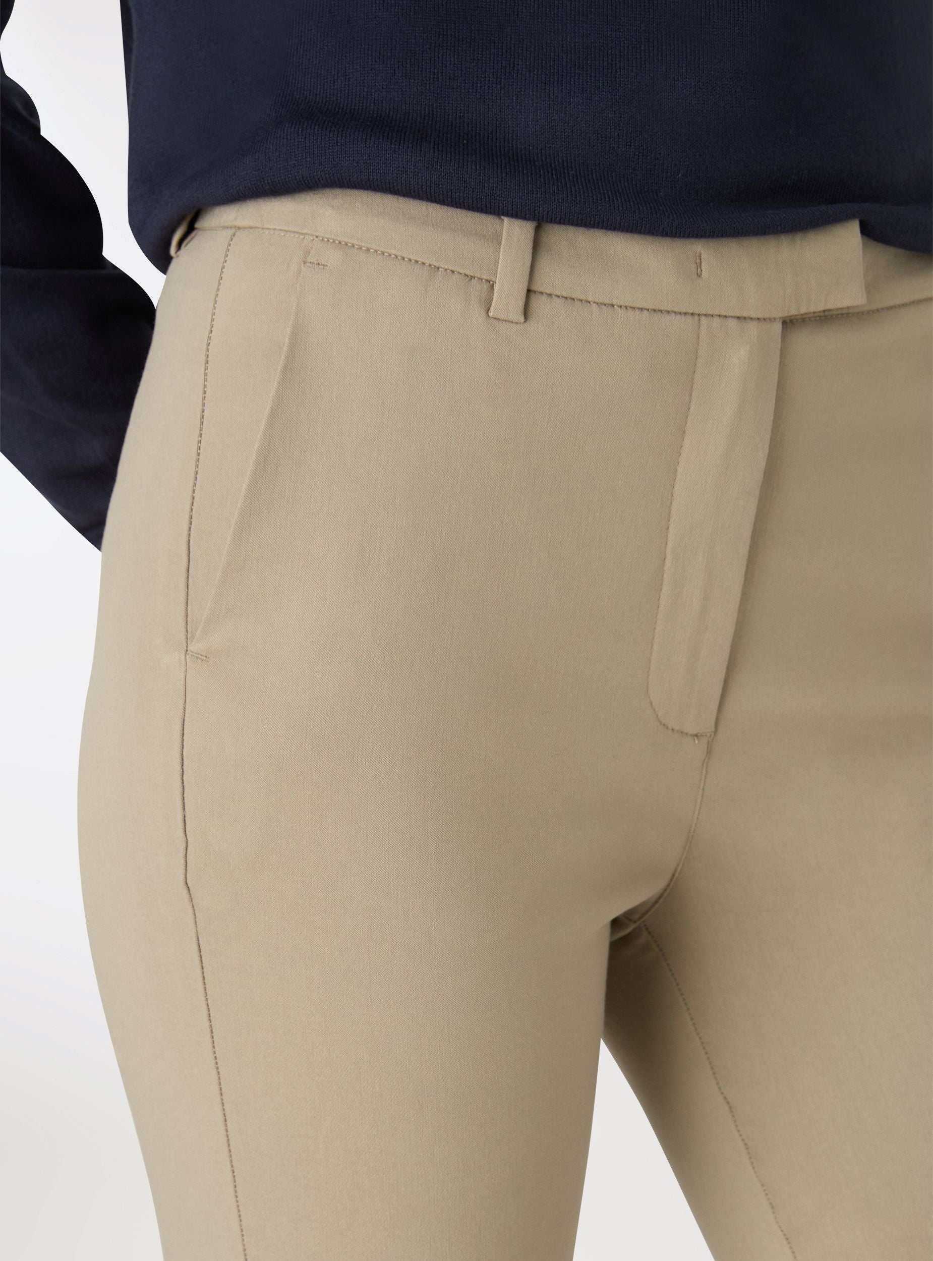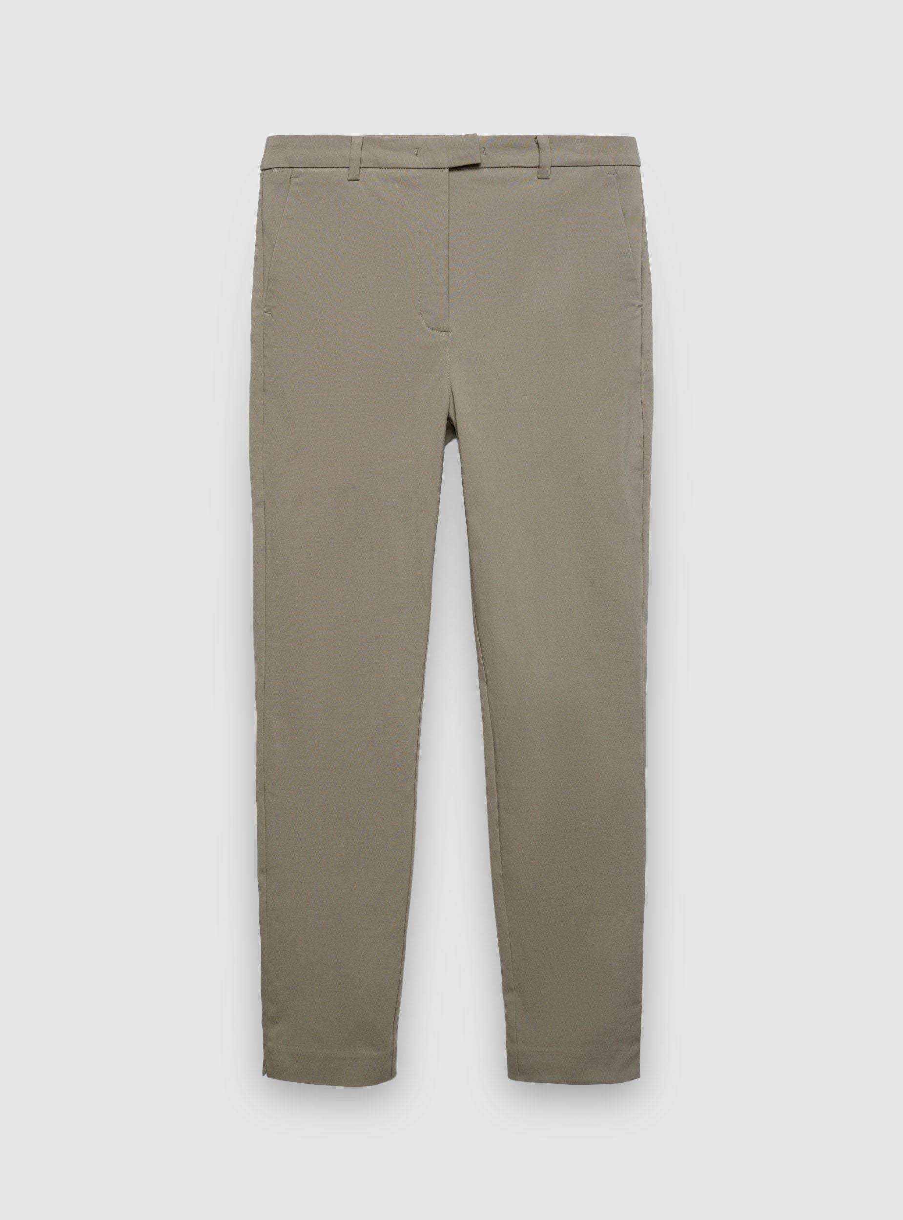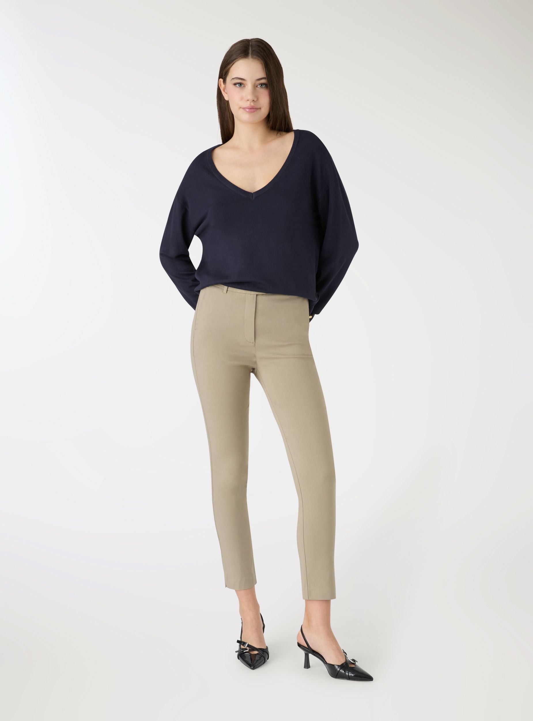 Pantaloni da donna in tinta unita, perfetti per l’ufficio e gli outfit quotidiani. Modello lungo con vestibilità skinny e passanti per cintura. Chiusura frontale con gancio e cerniera nascosta, tasche alla francese ai lati e tasche a filetto sul retro per un tocco pulito. Facili da abbinare a camicie e blazer per un look formale, oppure a maglietta e sneakers per un’impronta casual curata.Dettagli
