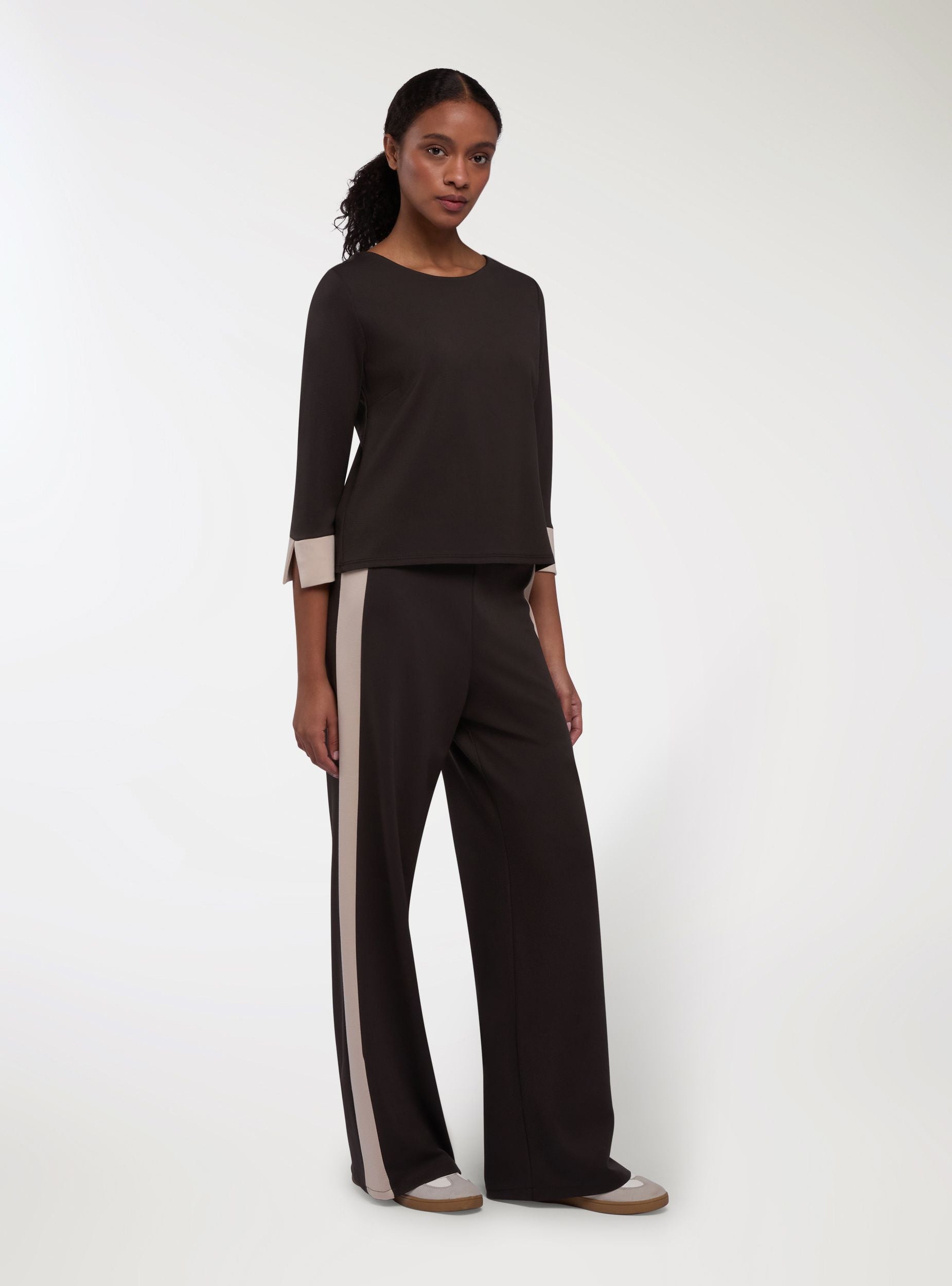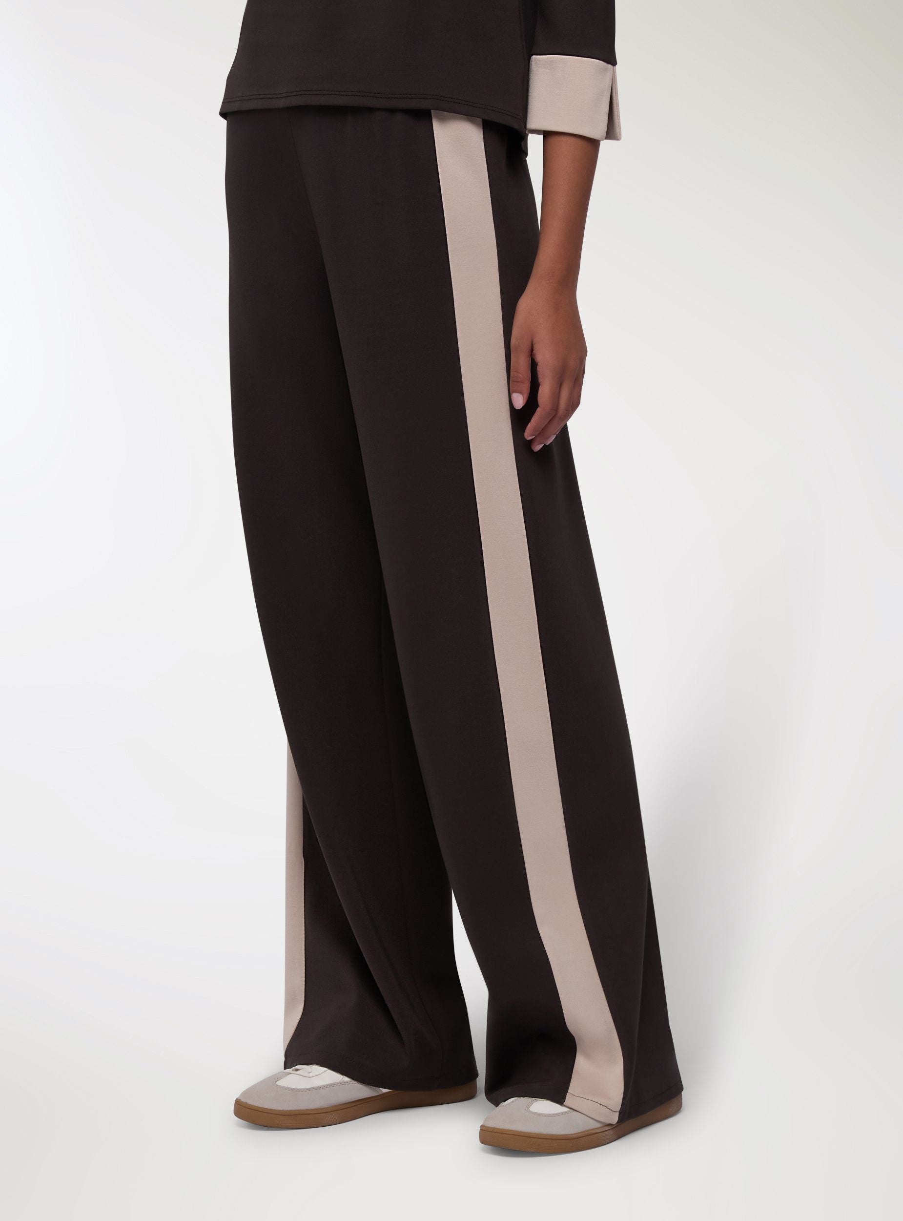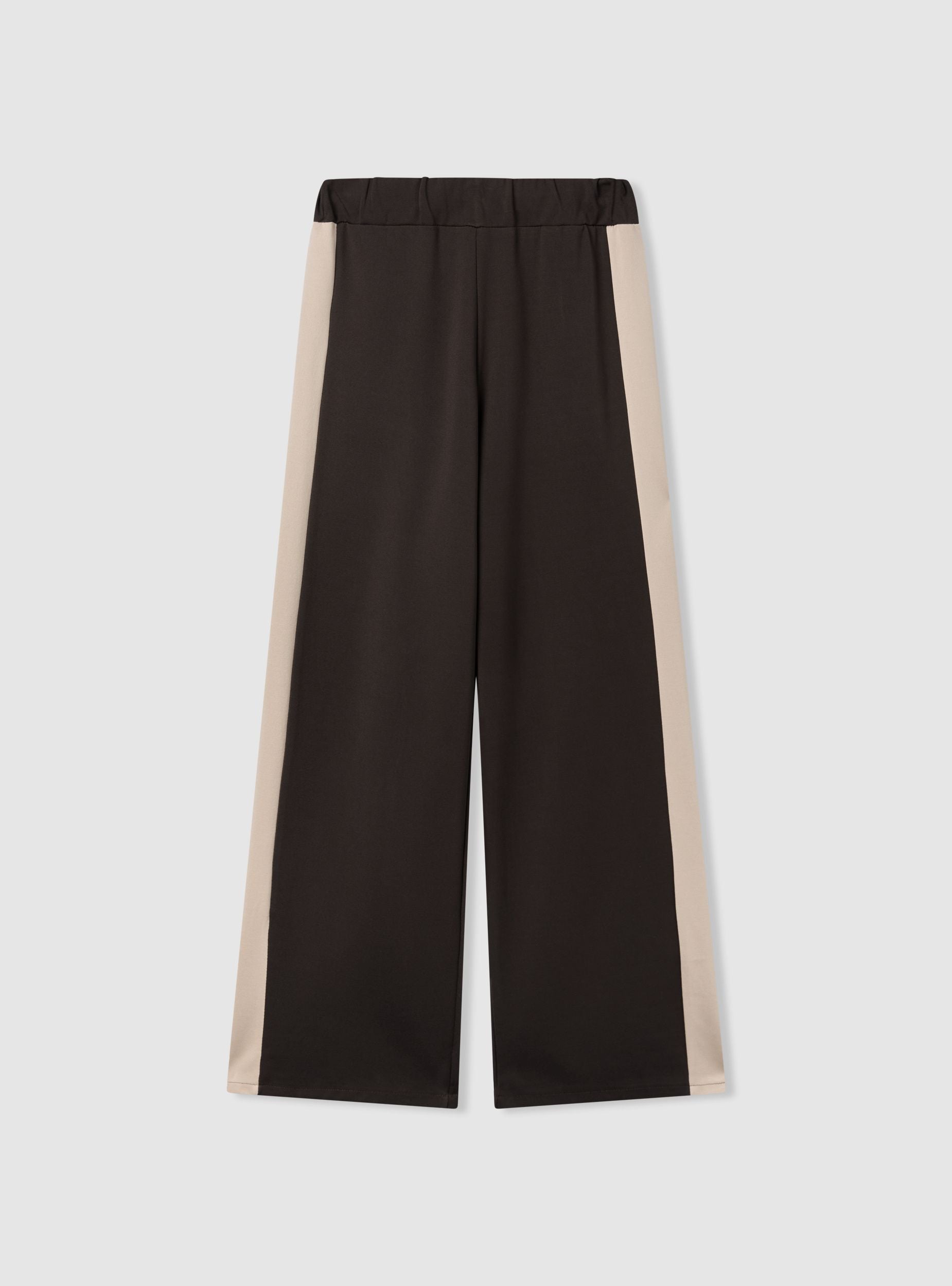 Pantaloni da donna dal taglio wide leg, ideali per un look casual o urbano. Vita con elastico per comfort quotidiano. Design con bande laterali a contrasto che slanciano la figura e aggiungono carattere. Perfetti con maglietta e sneakers per il giorno o con camicia e mocassini per un tocco più curato.Dettagli