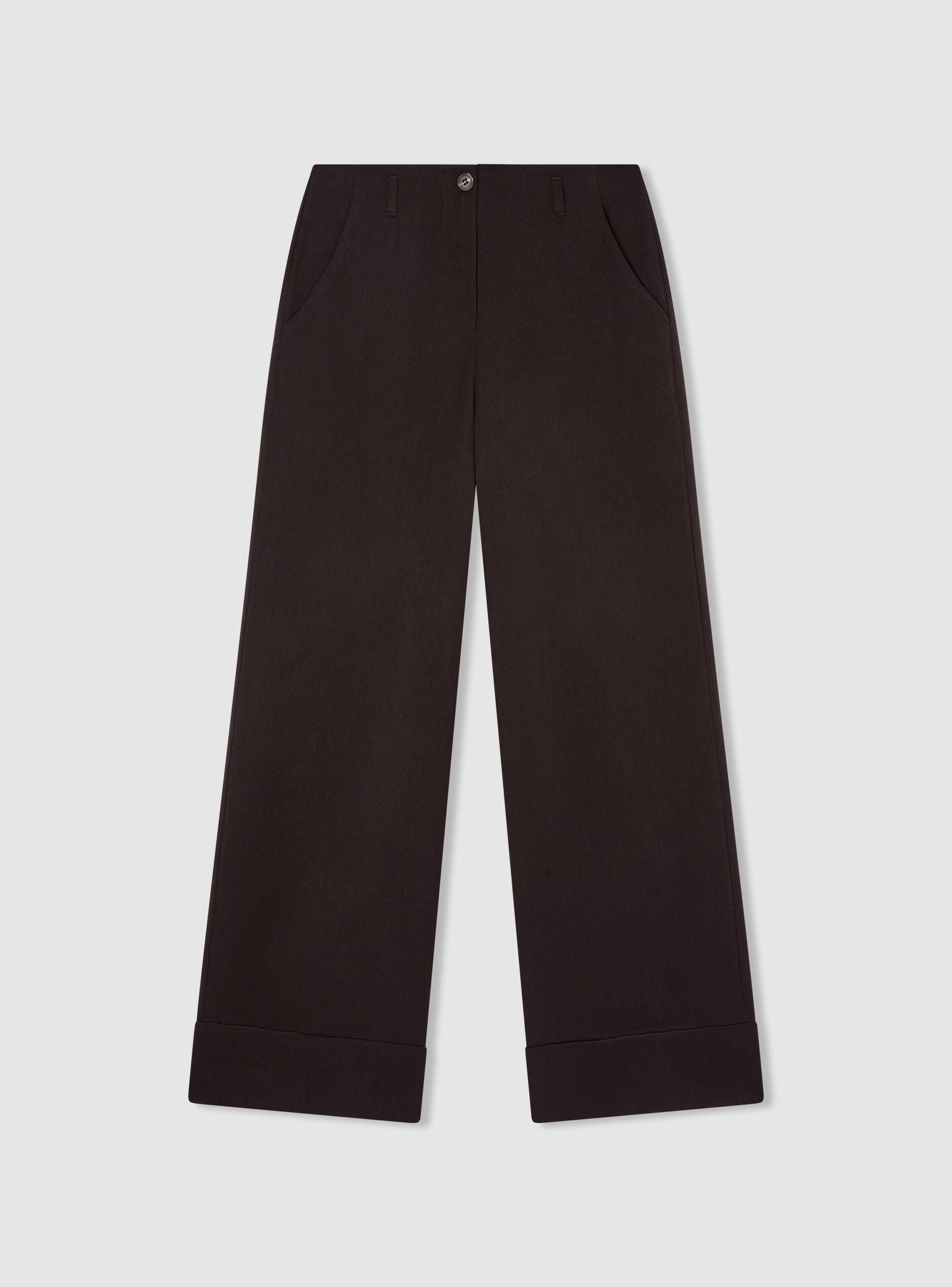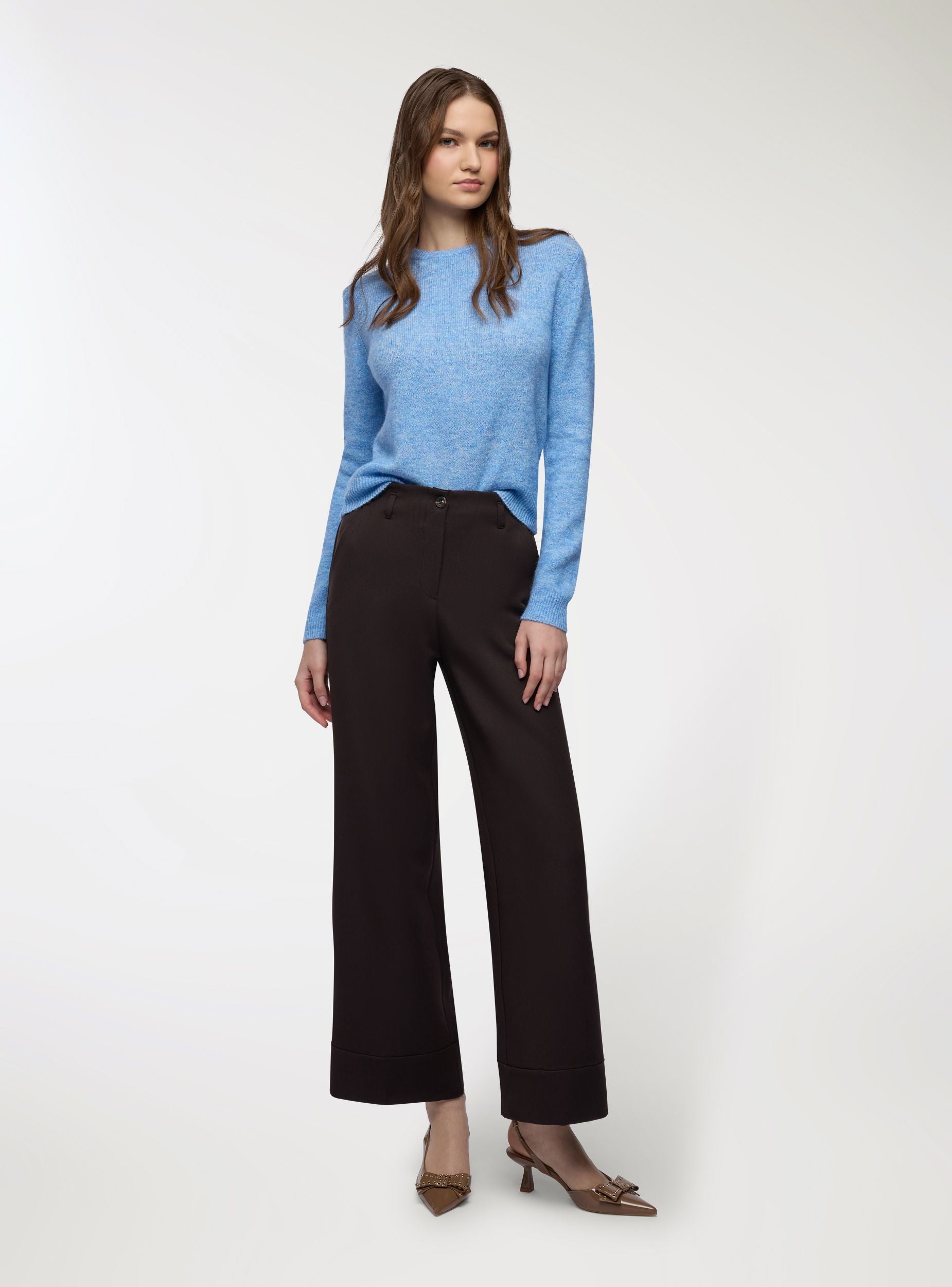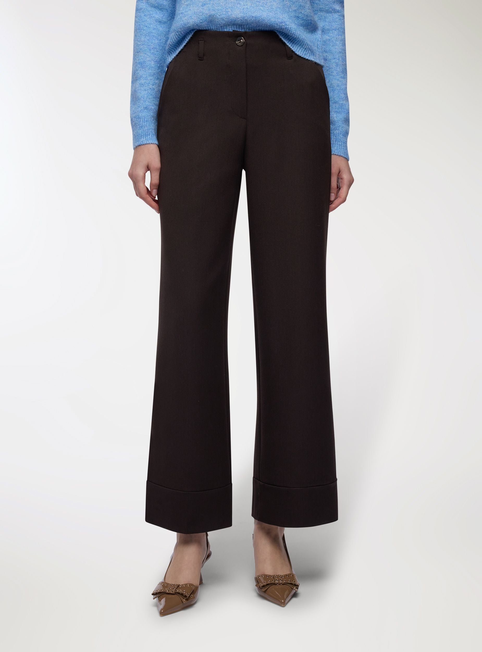 Pantaloni da donna a tinta unita con gamba dritta e fondo con risvolto, ideali per look da ufficio o occasioni eleganti. Vita media con passanti, chiusura con bottone e zip. Tasche laterali alla francese e linee pulite che valorizzano una vestibilità regular. Facili da abbinare a camicie, blazer o maglioni per outfit versatili dal giorno alla sera.Dettagli
