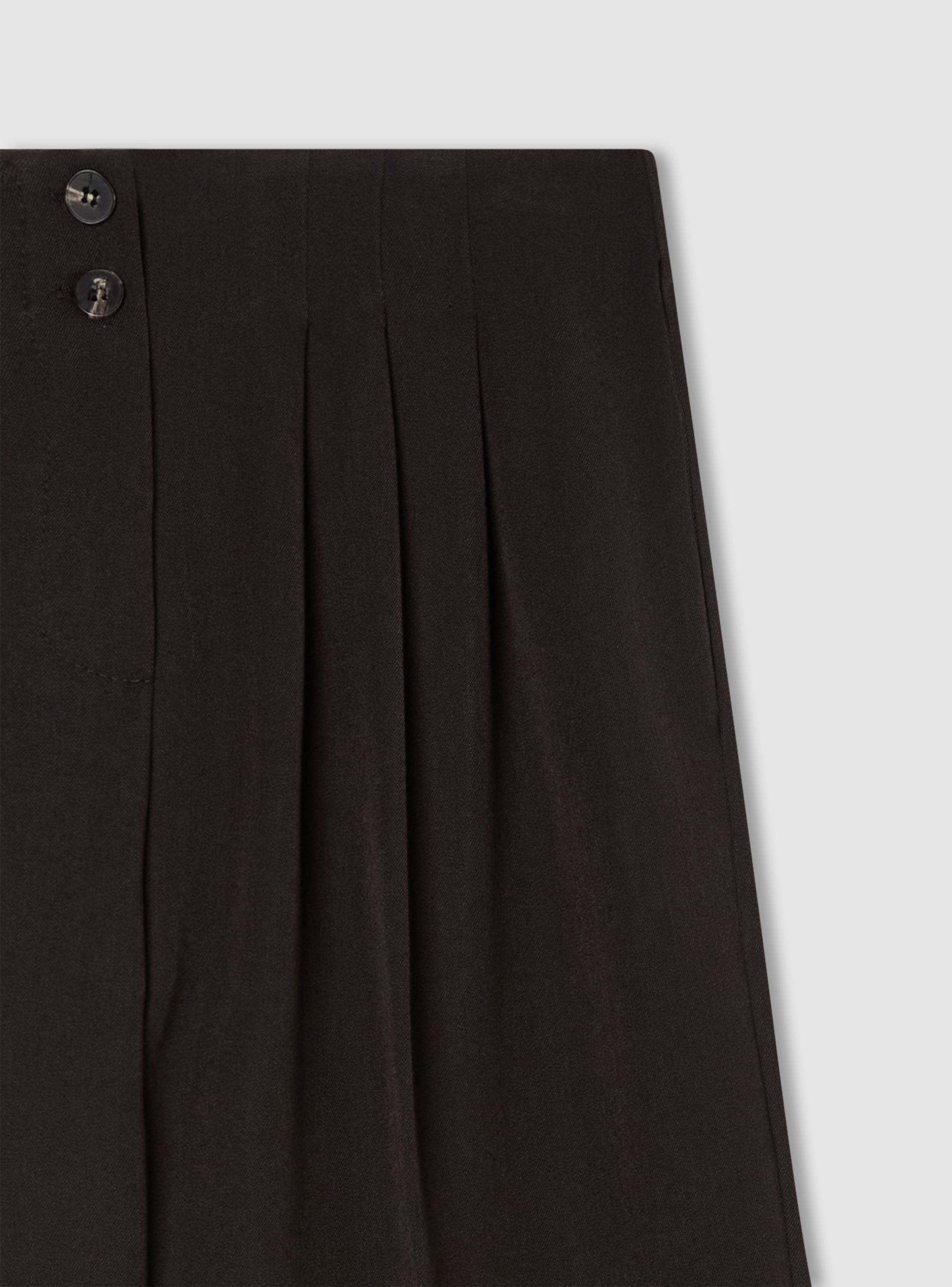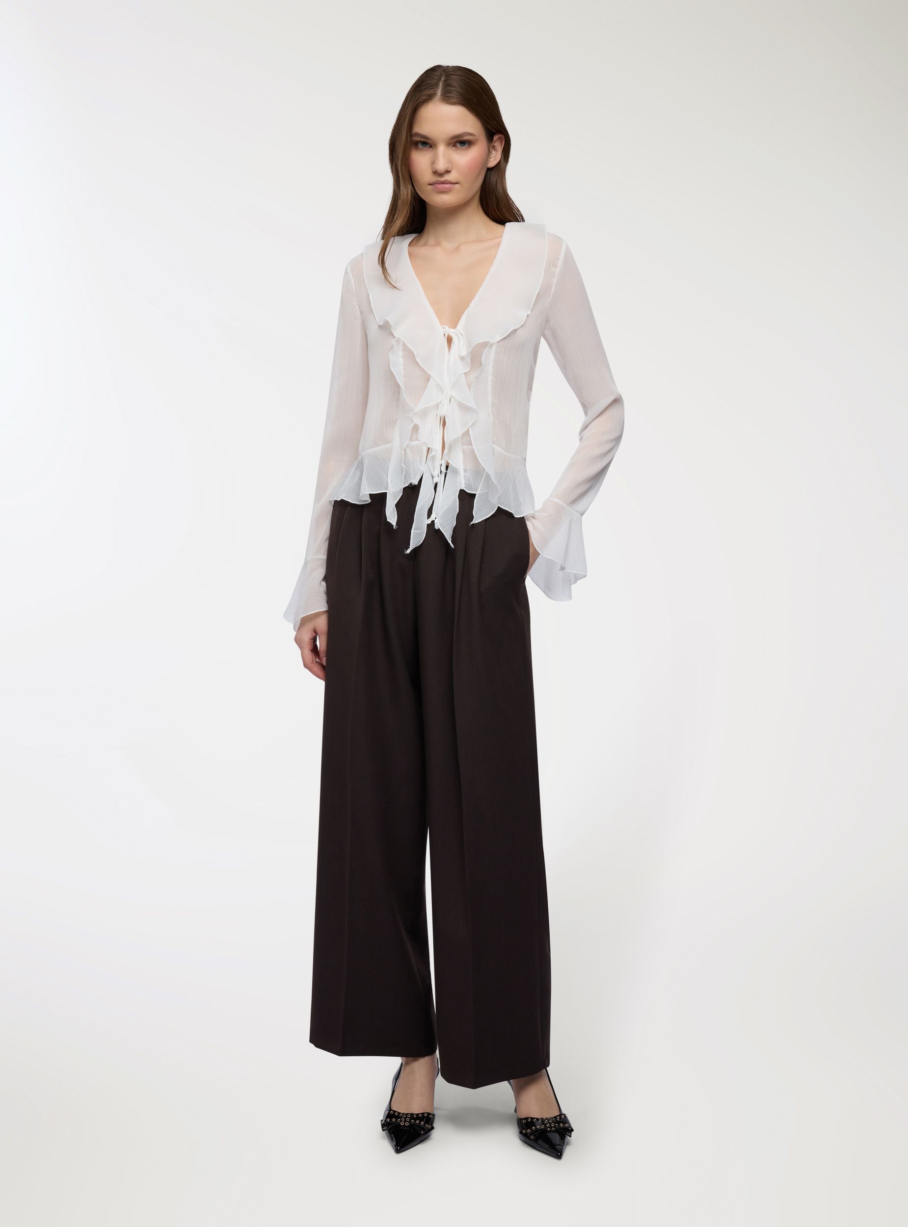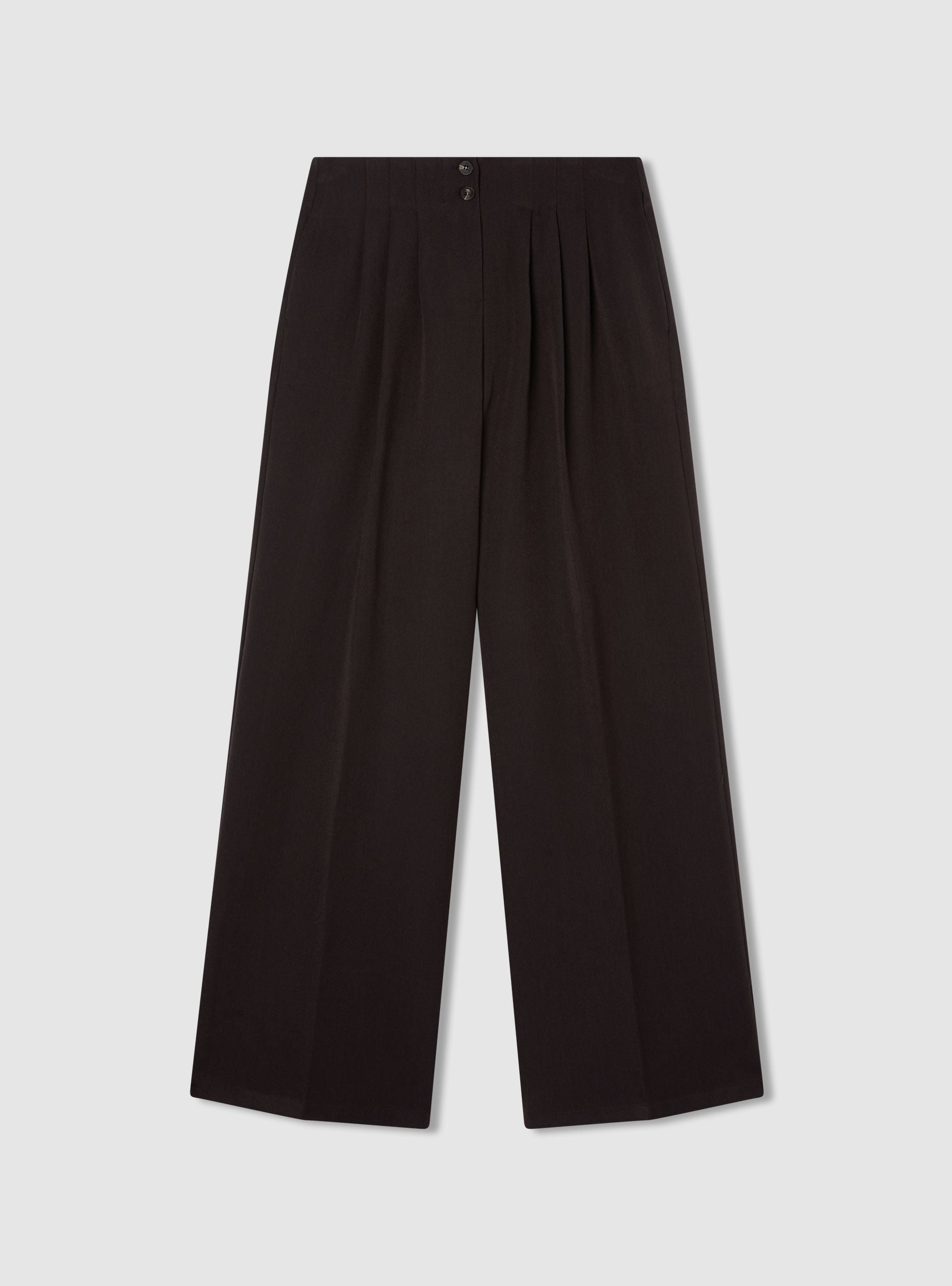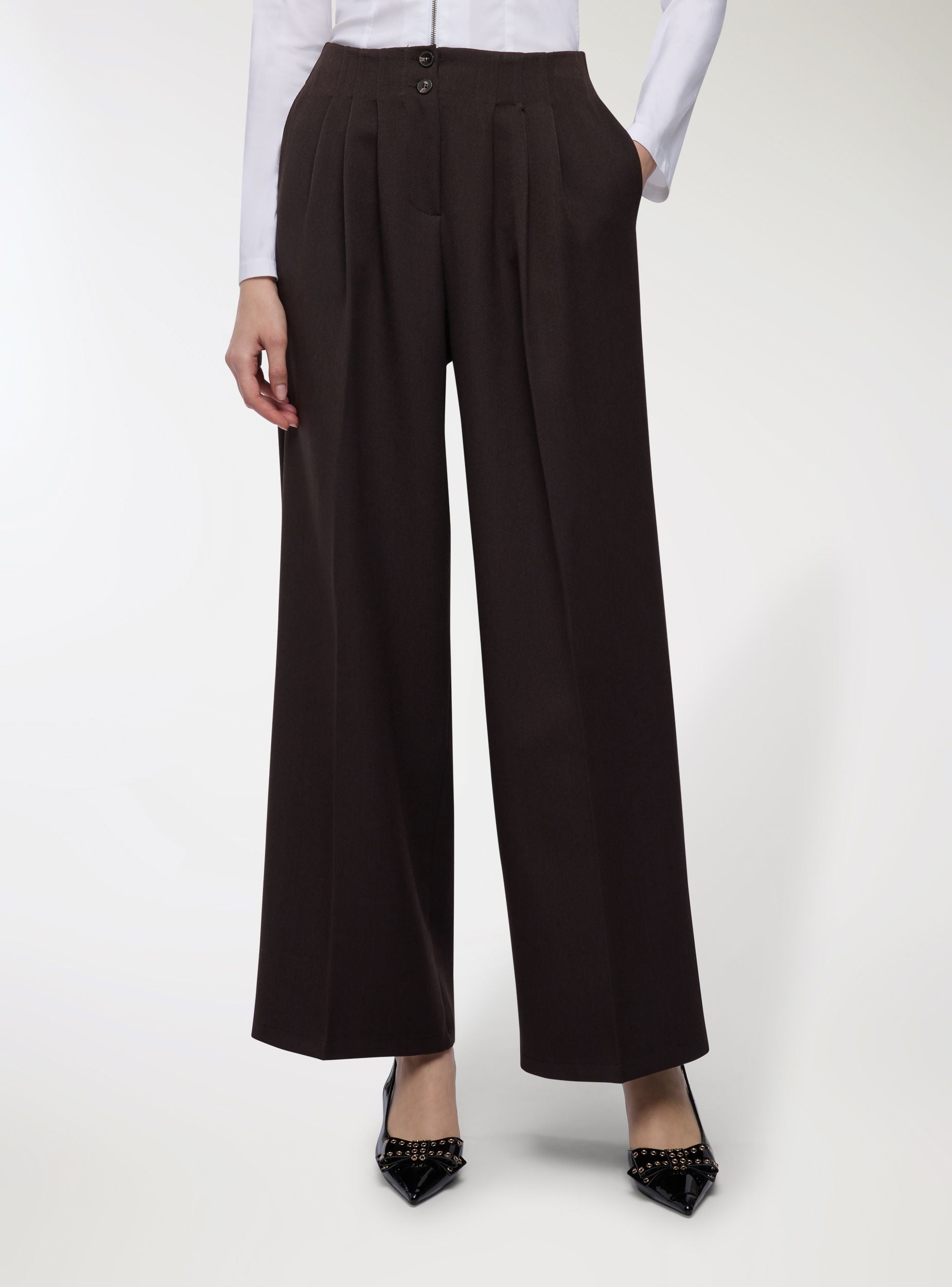 Pantaloni lunghi da donna in tinta unita, dal taglio wide leg con pieghe frontali che aggiungono movimento. Vita regolare e chiusura davanti con bottoni e zip per una vestibilità comoda. Linea fluida e gamba ampia fino alla caviglia, perfetti con camicie per l’ufficio o con maglietta e blazer per il tempo libero. Tasche laterali discrete completano un look versatile e curato.Dettagli