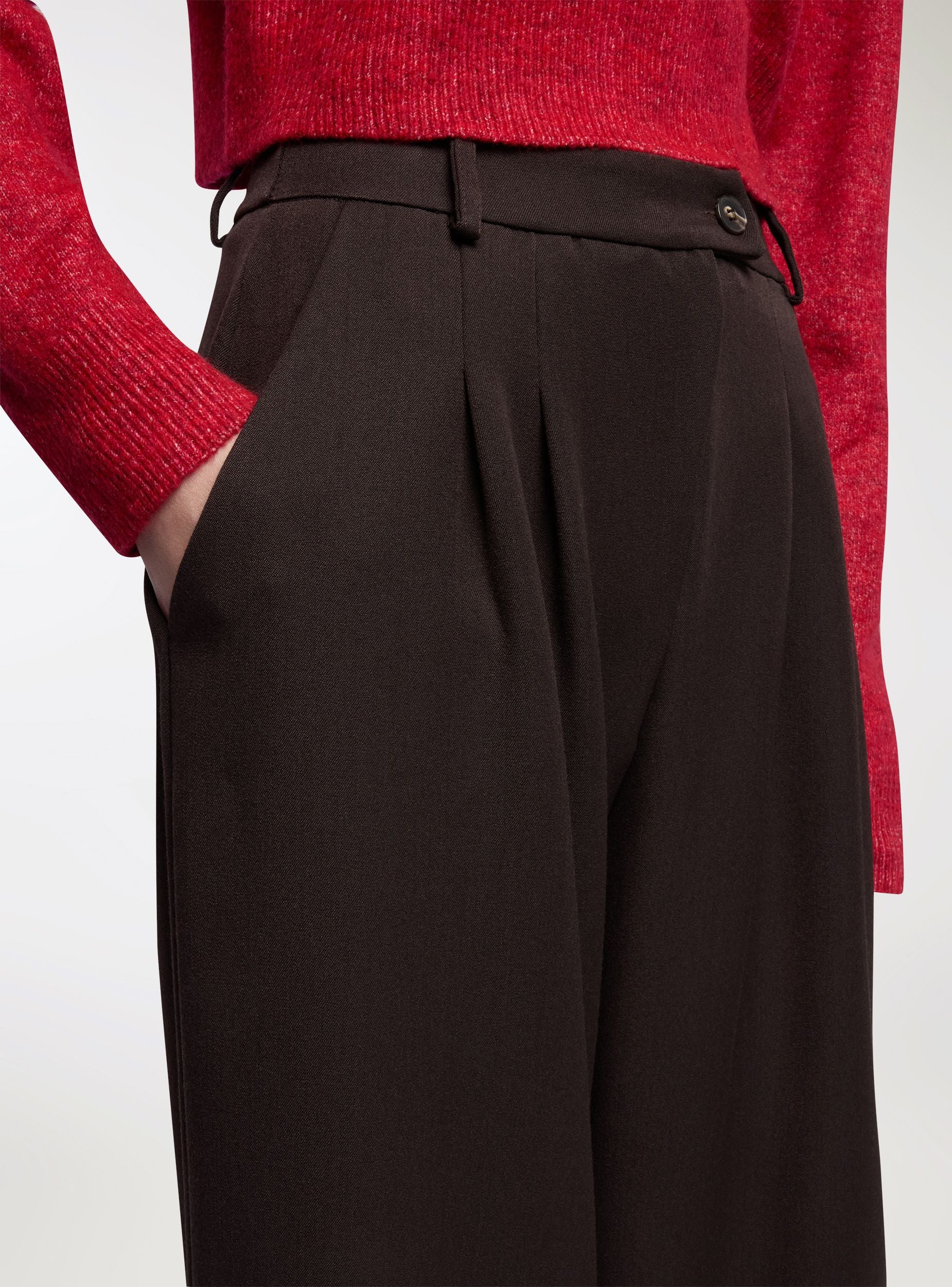 Pantaloni da donna a tinta unita con taglio wide leg e lunghezza alla caviglia, perfetti per outfit da ufficio o occasioni eleganti. Vita media con passanti e chiusura con bottone e zip. Presenza di pieghe frontali che donano movimento e volume. Tasche alla francese laterali e linea regolare che si abbina a camicie, blazer o top aderenti per un look equilibrato e raffinato.Dettagli