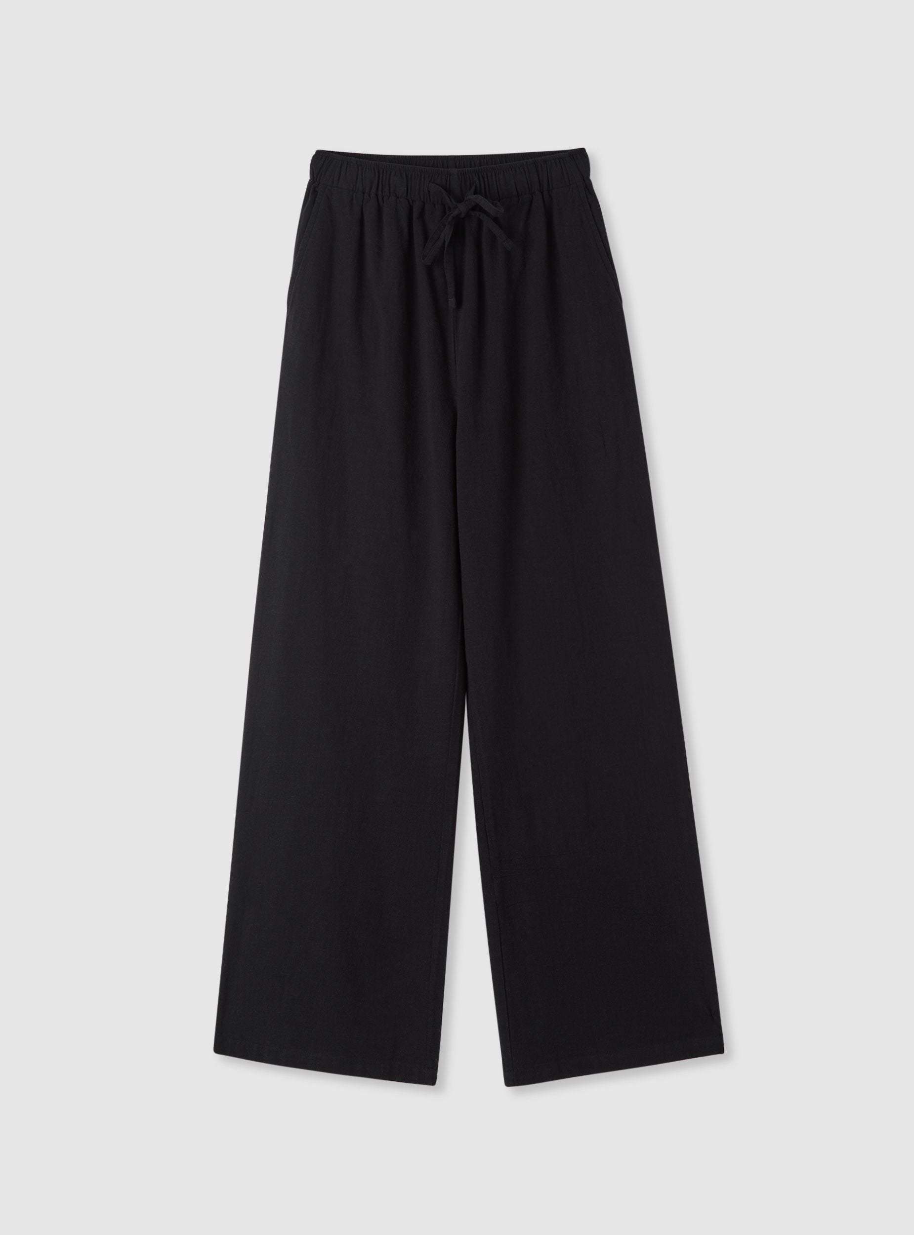 Pantaloni lunghi da donna in tessuto cotone a tinta unita, perfetti per il tempo libero e look casual. Modello wide leg con vestibilità confortevole e vita elasticizzata regolabile tramite coulisse. Presentano tasche laterali a filetto e linea morbida che cade dritta fino alla caviglia. Facili da abbinare a maglietta e sandali o a una camicia leggera per outfit rilassati dalla silhouette ariosa.Dettagli