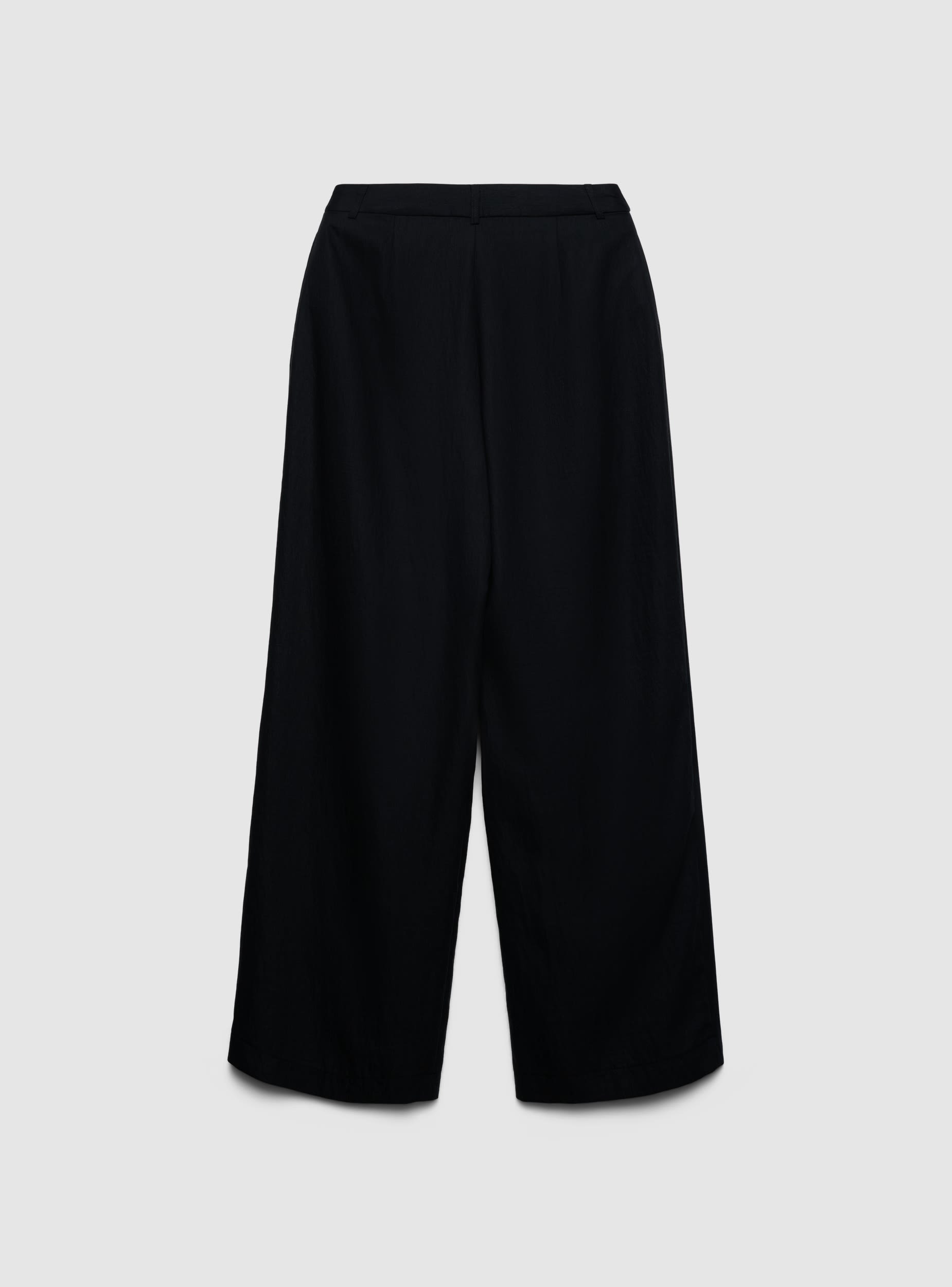 Pantaloni lunghi da donna a tinta unita con gamba wide leg e pinces frontali. Vita con passanti e chiusura con zip. Ideali per ufficio o tempo libero, si abbinano a camicie e blazer per look formali o a top e sandali per outfit quotidiani. Tessuto con effetto stropicciato che dona movimento e carattere al modello.Dettagli