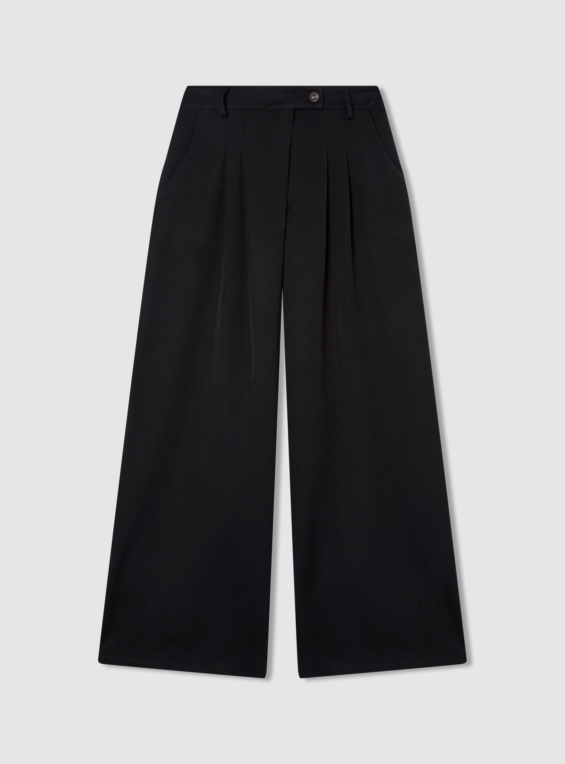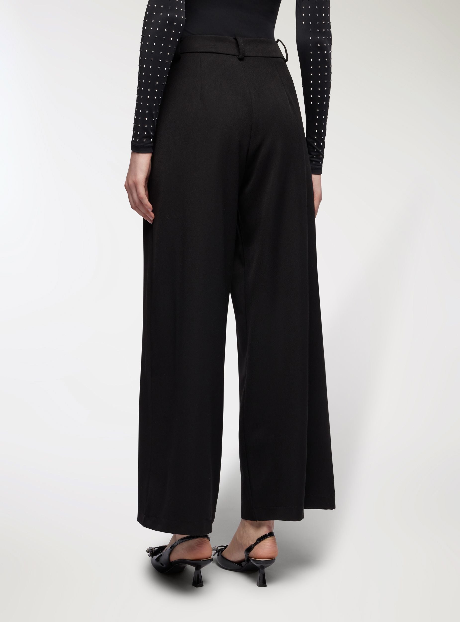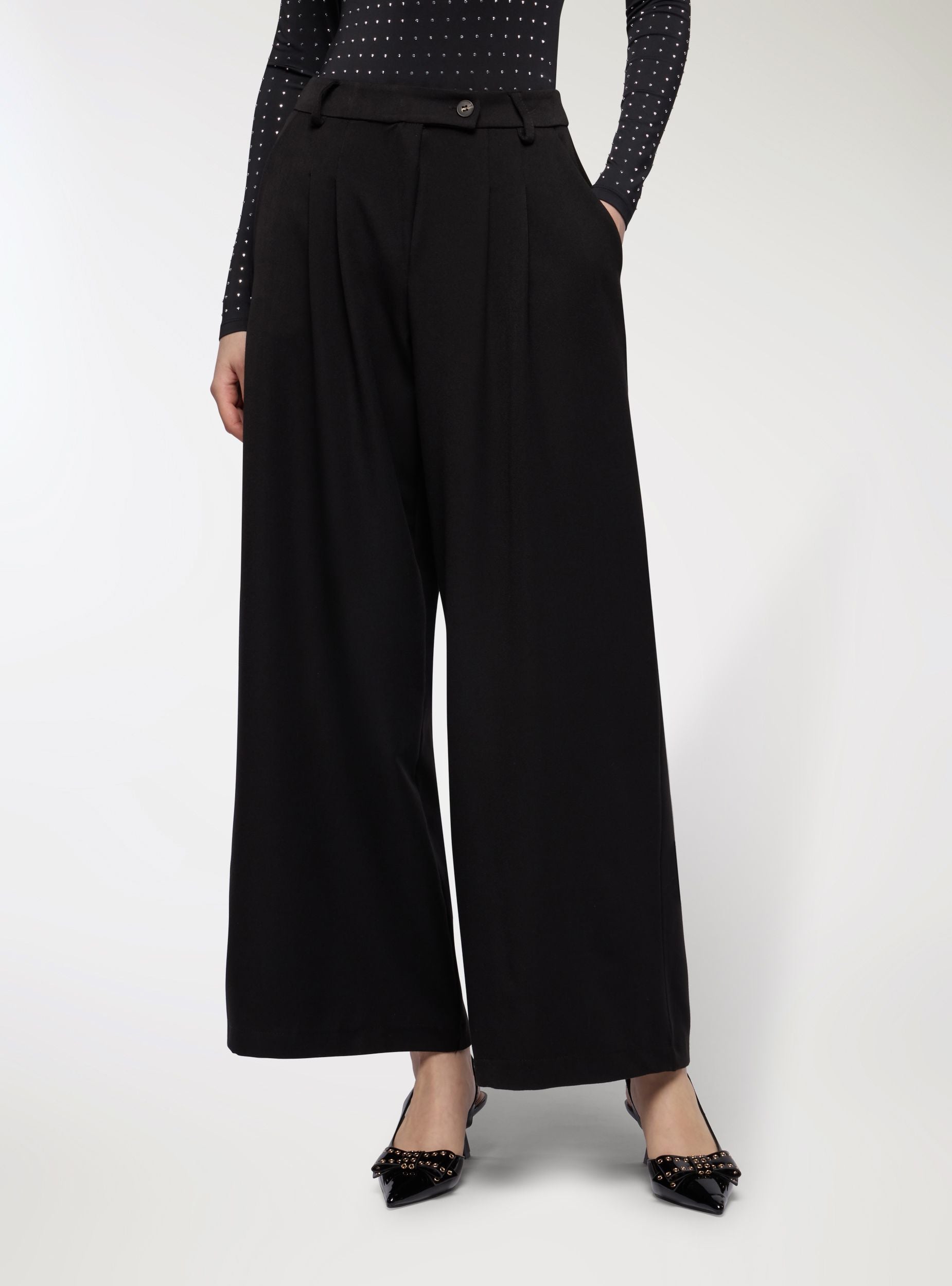 Pantaloni da donna a tinta unita con taglio wide leg e lunghezza alla caviglia, perfetti per outfit da ufficio o occasioni eleganti. Vita media con passanti e chiusura con bottone e zip. Presenza di pieghe frontali che donano movimento e volume. Tasche alla francese laterali e linea regolare che si abbina a camicie, blazer o top aderenti per un look equilibrato e raffinato.Dettagli
