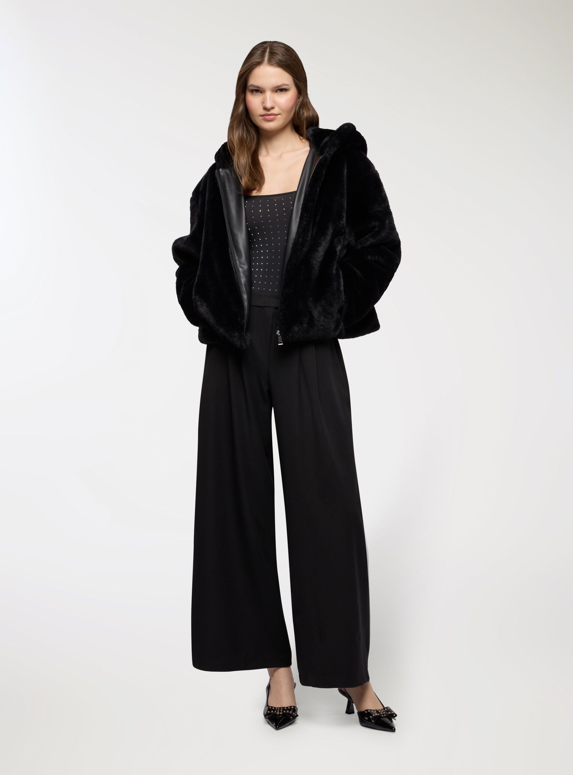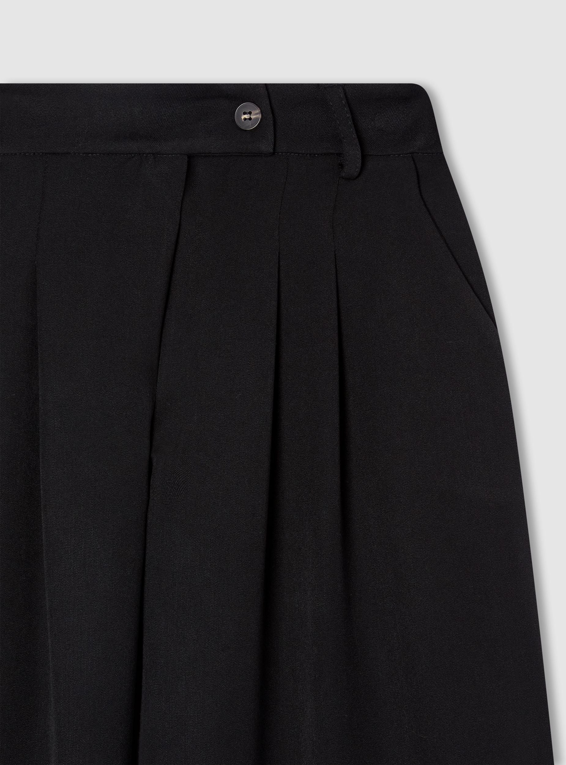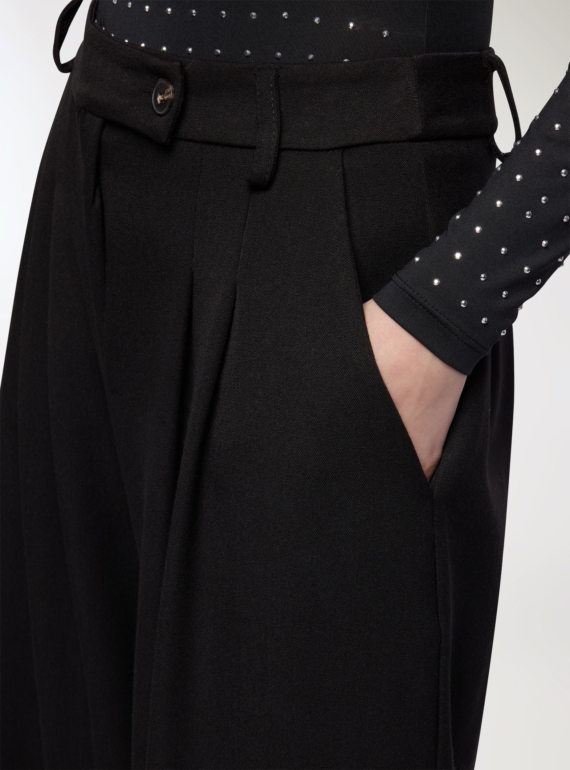 Pantaloni da donna a tinta unita con taglio wide leg e lunghezza alla caviglia, perfetti per outfit da ufficio o occasioni eleganti. Vita media con passanti e chiusura con bottone e zip. Presenza di pieghe frontali che donano movimento e volume. Tasche alla francese laterali e linea regolare che si abbina a camicie, blazer o top aderenti per un look equilibrato e raffinato.Dettagli