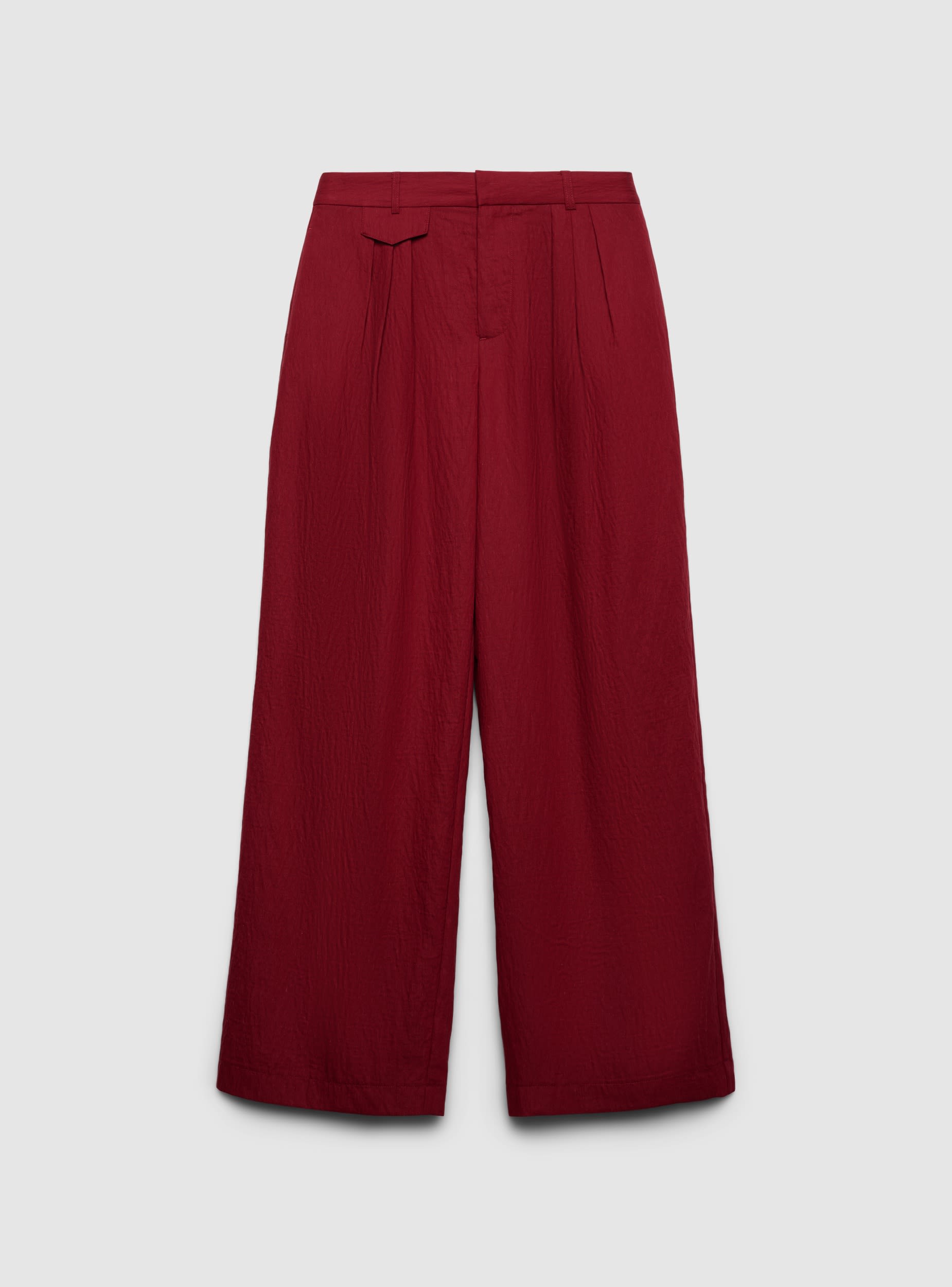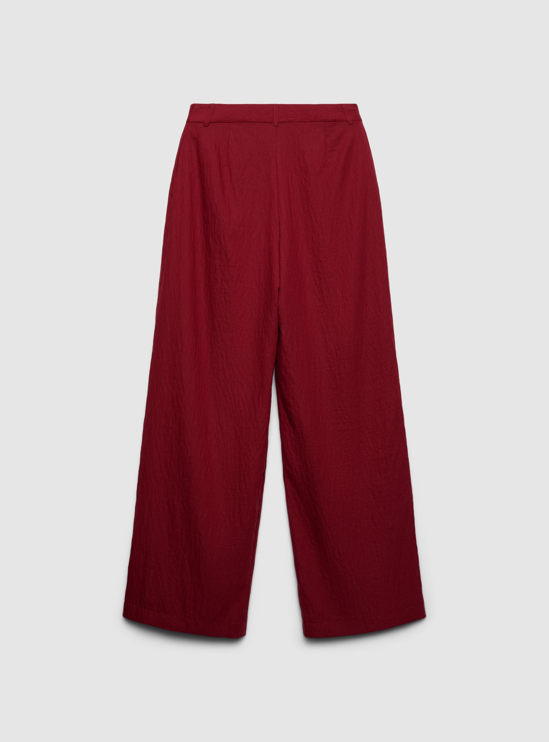 Pantaloni lunghi da donna a tinta unita con gamba wide leg e pinces frontali. Vita con passanti e chiusura con zip. Ideali per ufficio o tempo libero, si abbinano a camicie e blazer per look formali o a top e sandali per outfit quotidiani. Tessuto con effetto stropicciato che dona movimento e carattere al modello.Dettagli