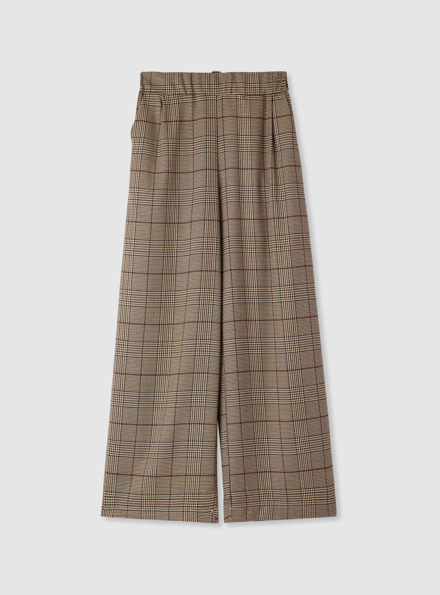 Pantaloni lunghi da donna a quadri con vestibilità ampia e gamba larga. Modello a vita media con elastico sul retro per maggiore comfort. Tasche laterali pratiche e piega sul fronte che valorizza il taglio morbido. Ideali per l’ufficio o per look casual chic con camicie e magliette tinta unita, si abbinano bene a blazer e mocassini.Dettagli
