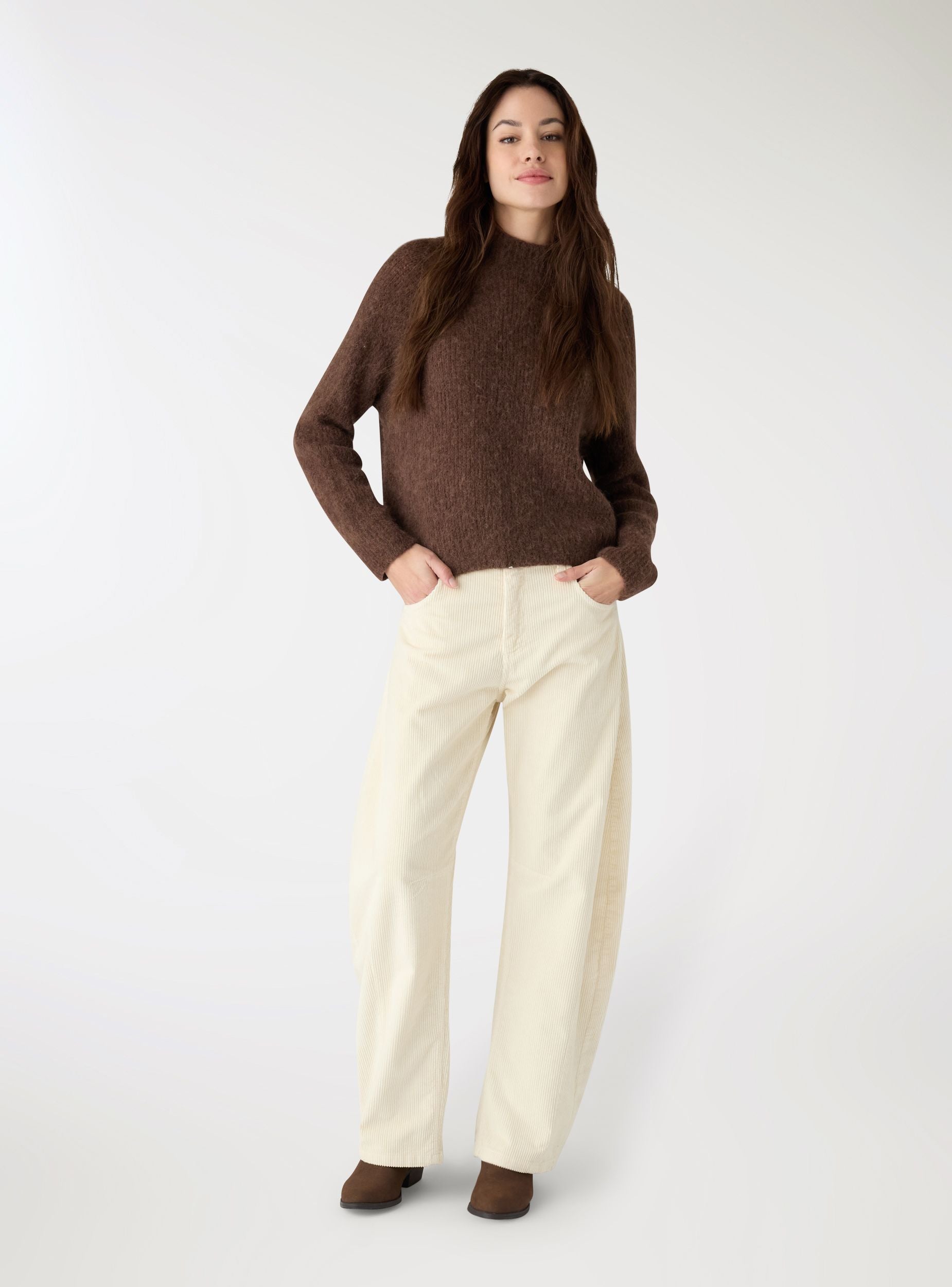 Pantaloni lunghi da donna in effetto velluto a tinta unita, con linea barrel morbida e gamba dritta che scende alla caviglia. Chiusura con bottone e zip, passanti in vita e 5 tasche per un look casual curato. Ideali con maglietta o camicia per l’ufficio informale, perfetti anche con stivaletti o sneakers nel tempo libero.Dettagli