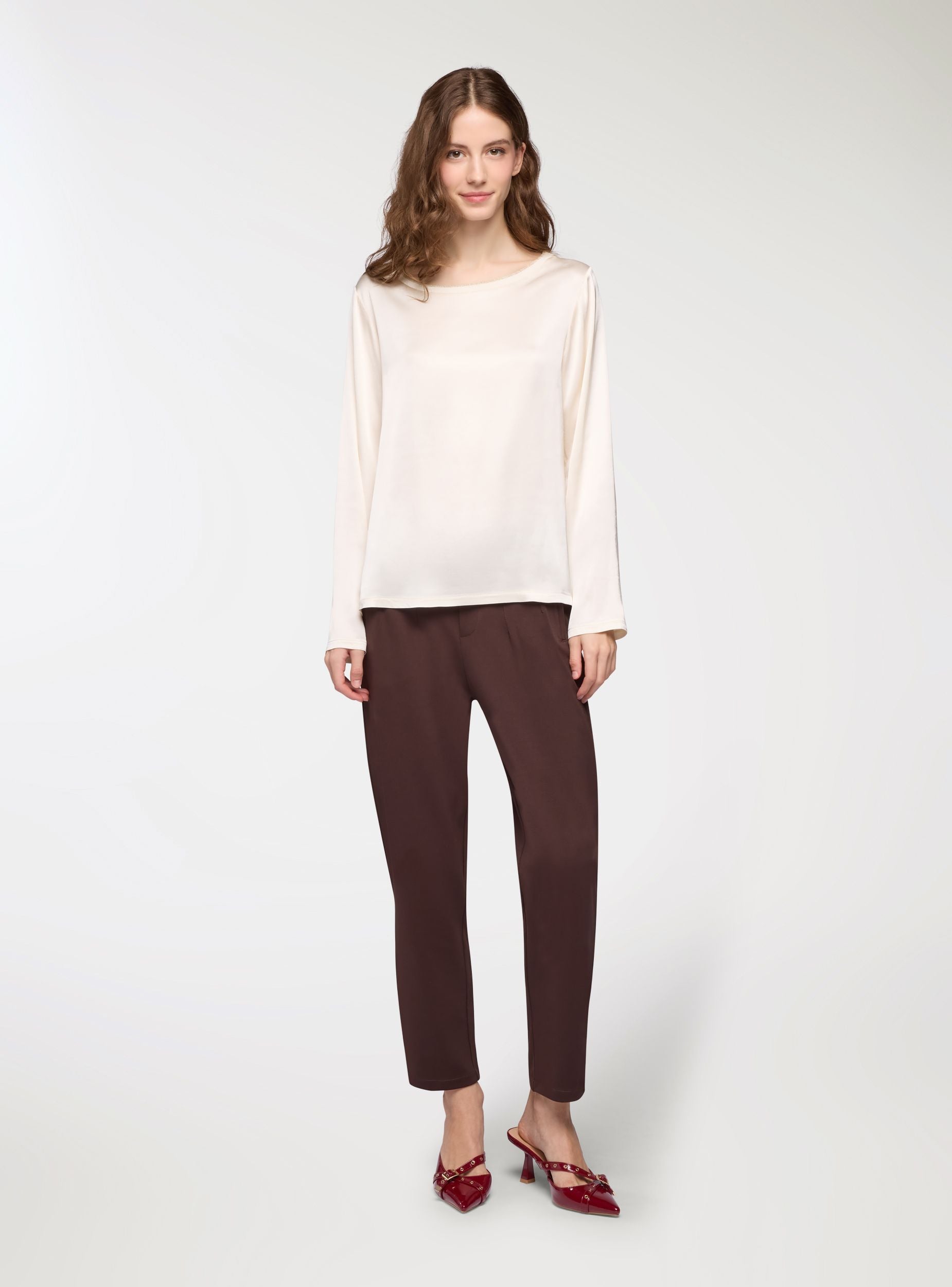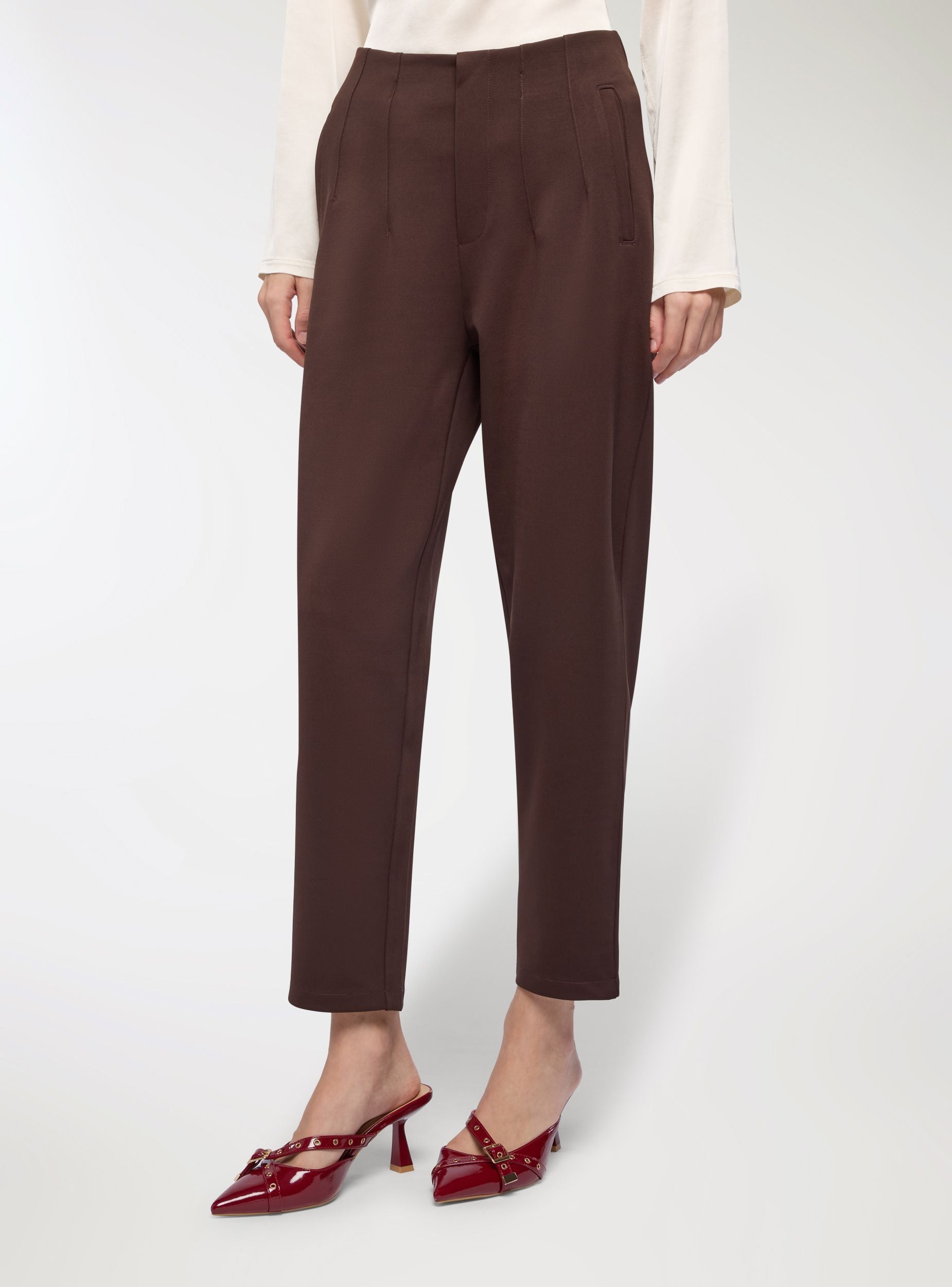 Pantaloni da donna modello chino, ideali per l’ufficio e il tempo libero. Tessuto morbido a tinta unita. Vita elasticizzata senza chiusura per massimo comfort e linea pulita, con pieghe sul davanti che slanciano la figura. Tasche laterali a filetto funzionali. Facili da abbinare a camicie e blazer per un look curato, oppure a maglietta e sneakers per un outfit casual. Lunghezza alla caviglia e vestibilità regular.Dettagli