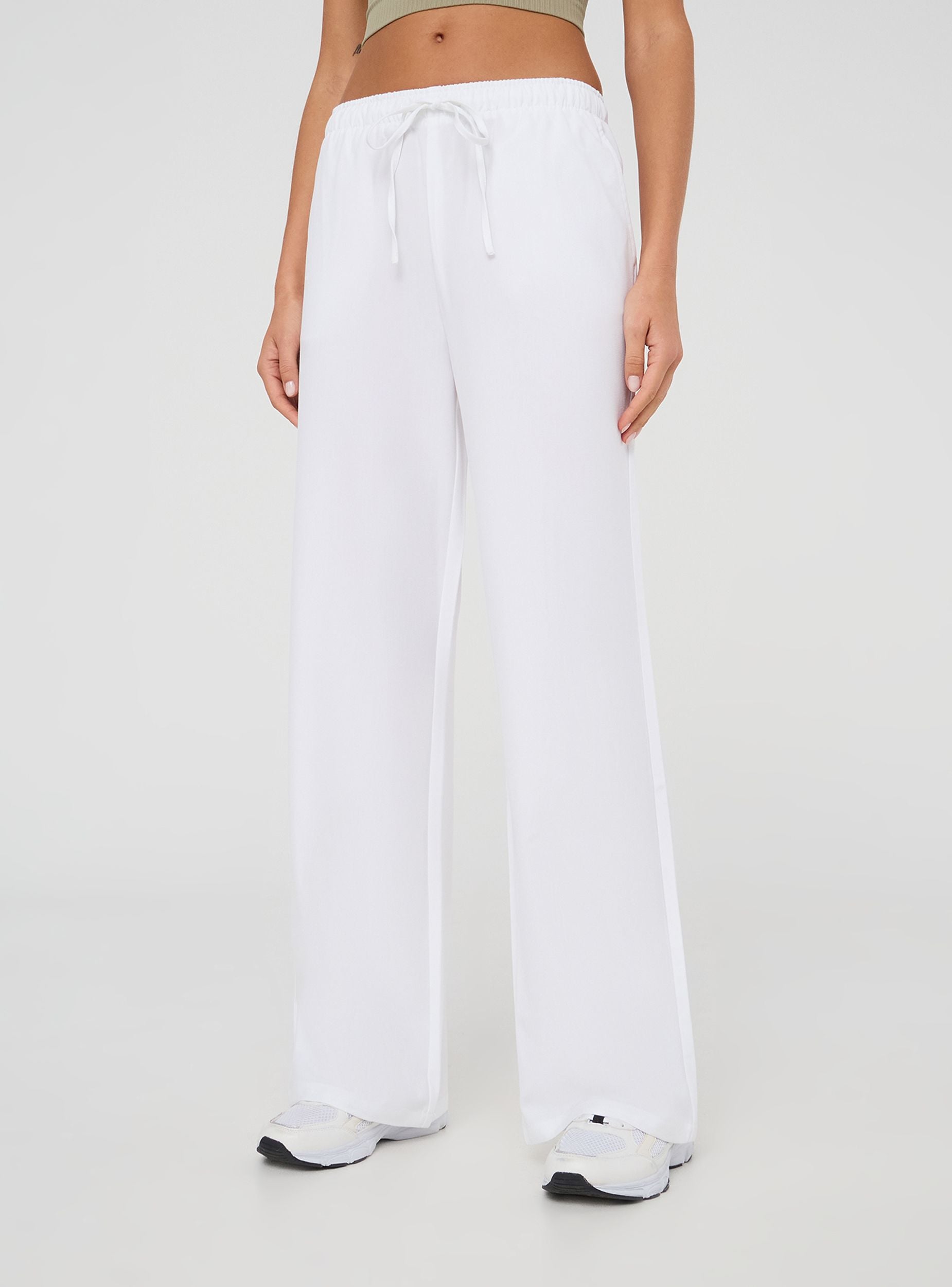 Pantaloni da donna con design wide leg, perfetti per un look rilassato e versatile. La tinta unita li rende ideali per abbinamenti casual o sportivi. Dotati di comoda coulisse regolabile in vita e pratiche tasche laterali, sono la scelta ideale per momenti di relax o passeggiate in città, con sneakers o sandali per un outfit sempre alla moda.Dettagli