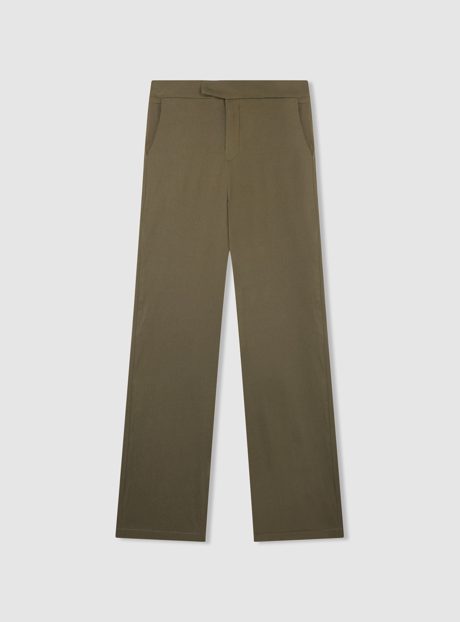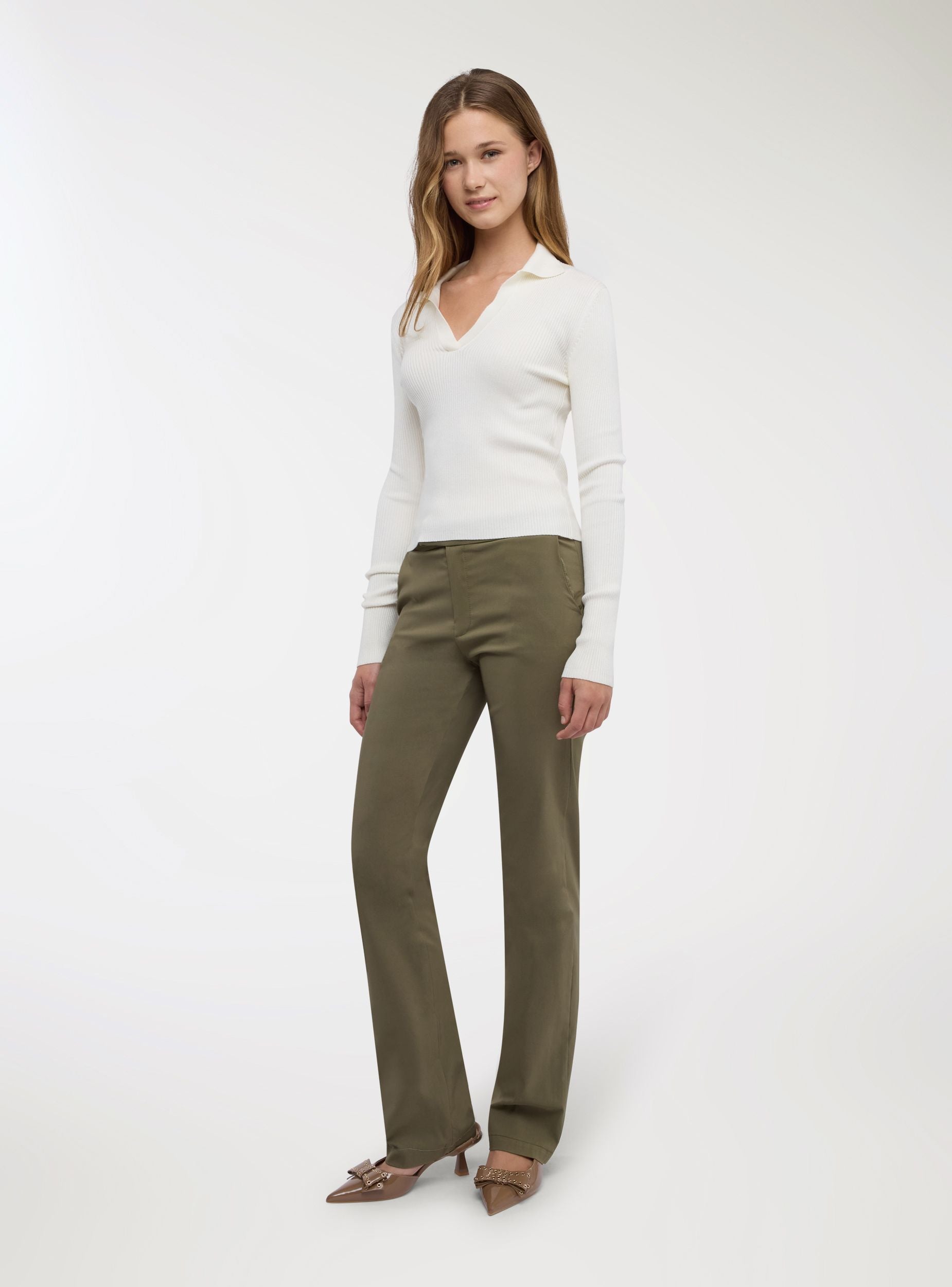Pantaloni lunghi da donna a tinta unita dal taglio dritto, ideali per look da ufficio o tempo libero. Vita alta con cinturino strutturato e chiusura frontale nascosta, linea pulita e gamba regolare. Le tasche laterali alla francese aggiungono praticità, perfetti con camicie, blazer o maglie aderenti per outfit ordinati e versatili.Dettagli