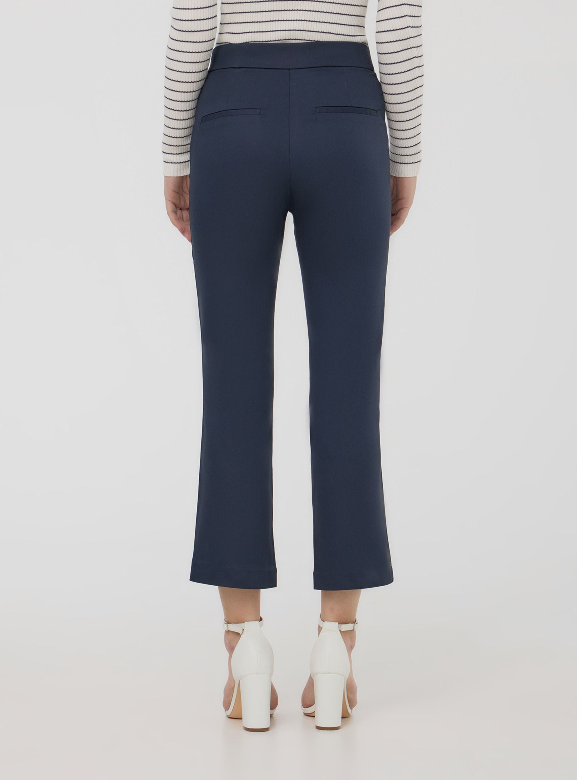 Pantaloni da donna a tinta unita con vestibilità a zampa e lunghezza crop, ideali per un look moderno e raffinato. Dotati di chiusura con gancio, bottone e zip, presentano un elastico interno in vita per maggiore comfort. Perfetti per essere abbinati a camicie morbide e sandali per un outfit casual-chic, o a top strutturati e tacchi per occasioni più eleganti.Dettagli