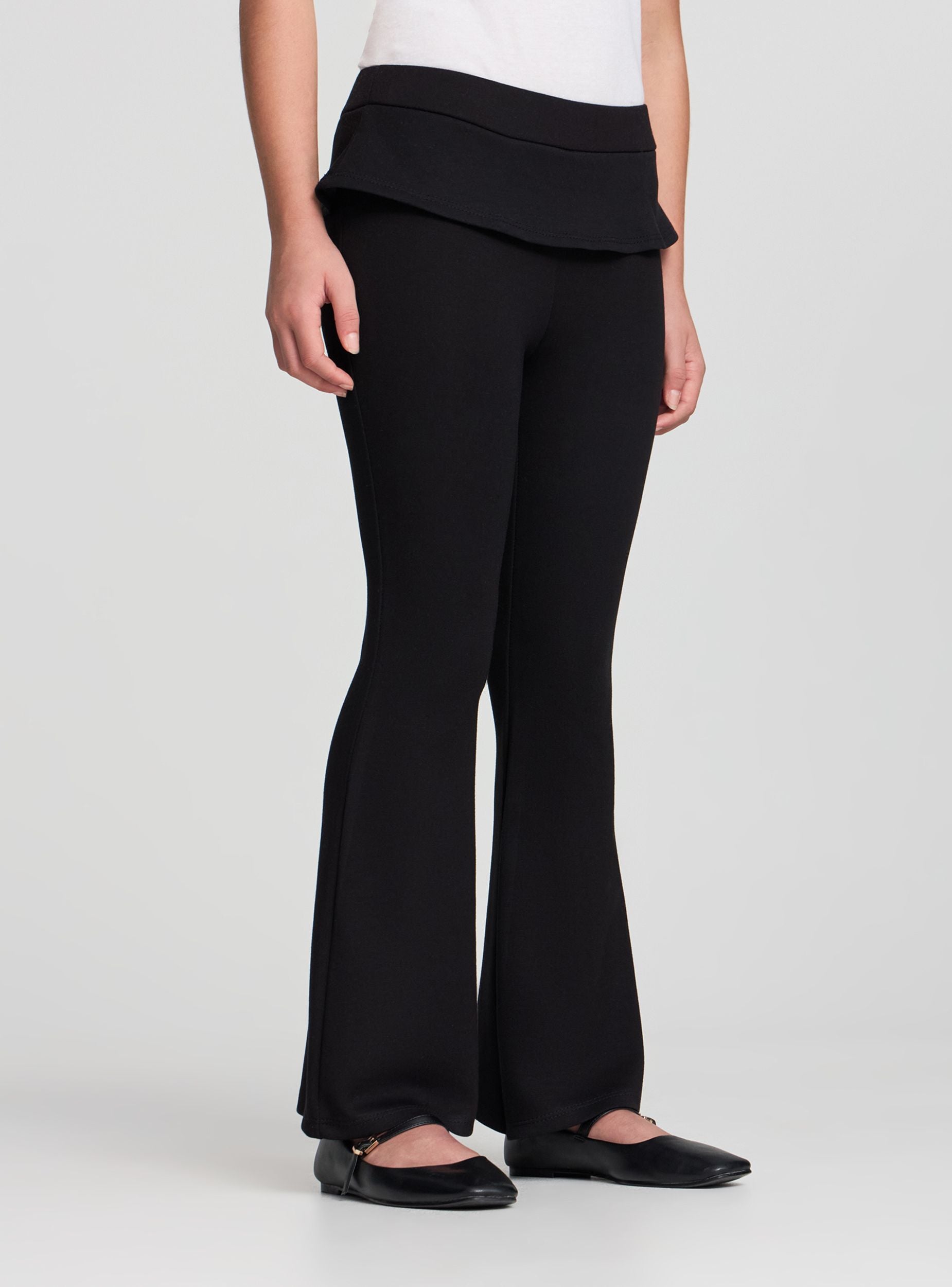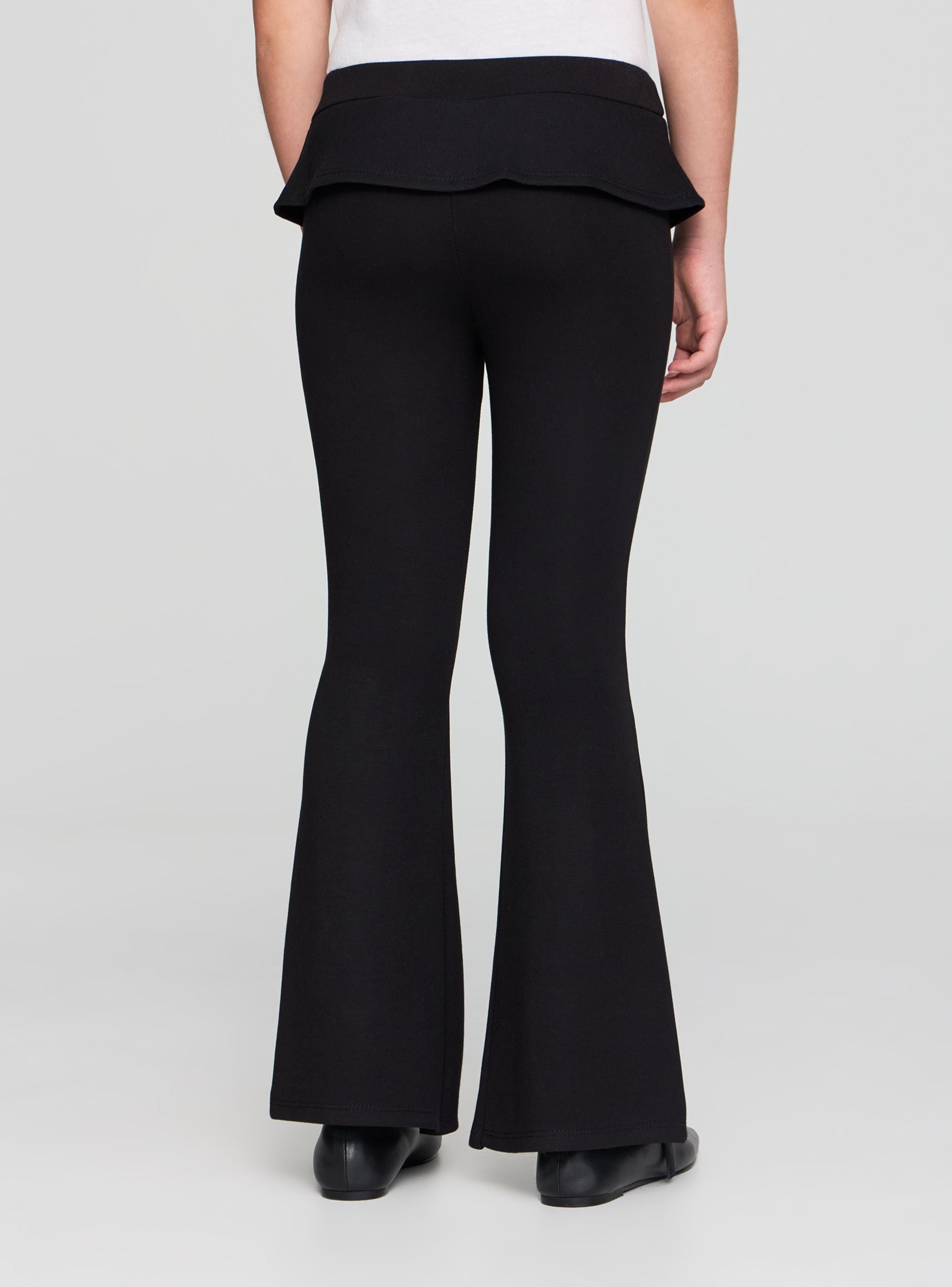 Pantaloni ginnici da bambina dal design a zampa, ideali per il tempo libero e gli outfit di tutti i giorni. Vita con elastico con delicato volant che aggiunge un tocco femminile e confortevole. Vestibilità regolare che segue il movimento e gamba che si allarga verso il fondo per un effetto slanciato. Perfetti con felpe o maglioncini e sneakers.Dettagli