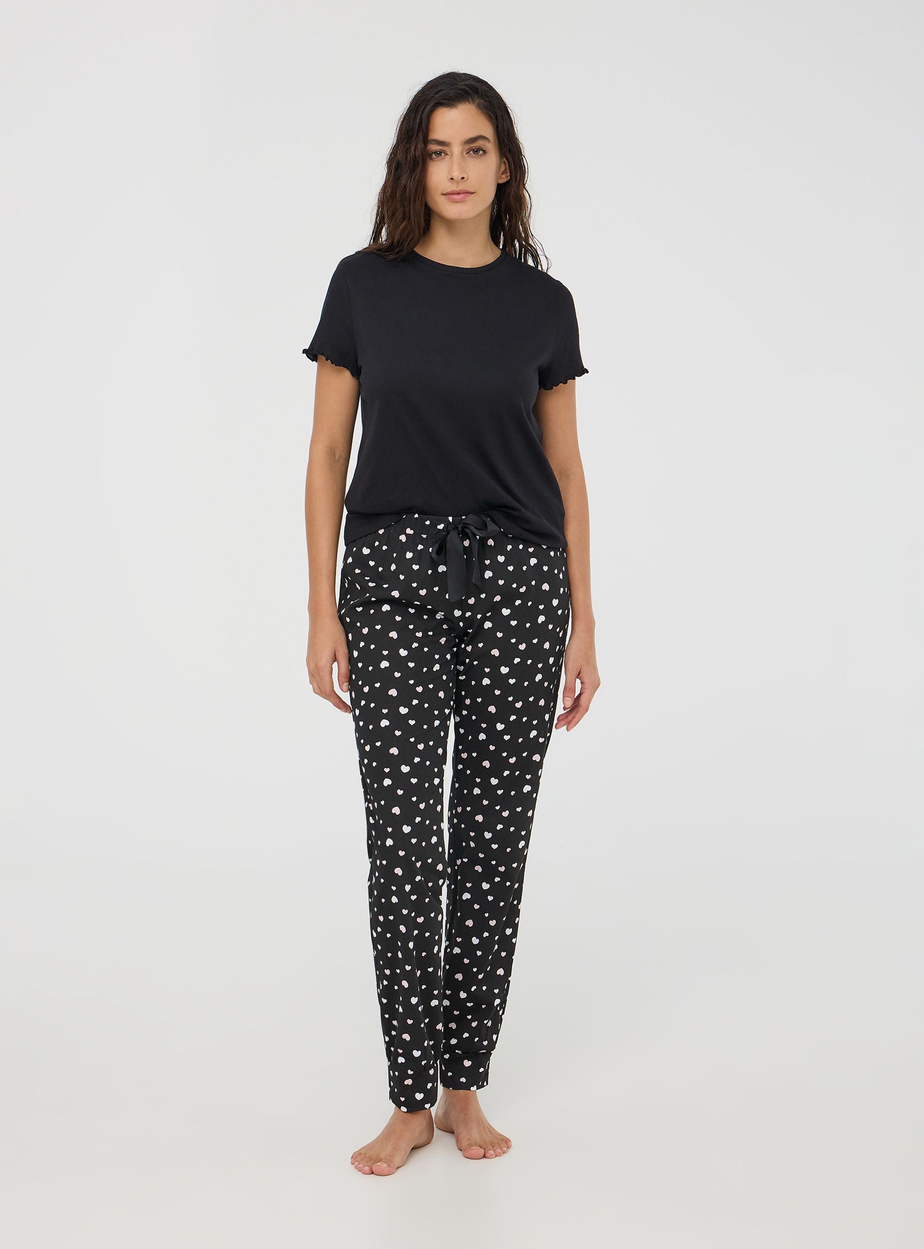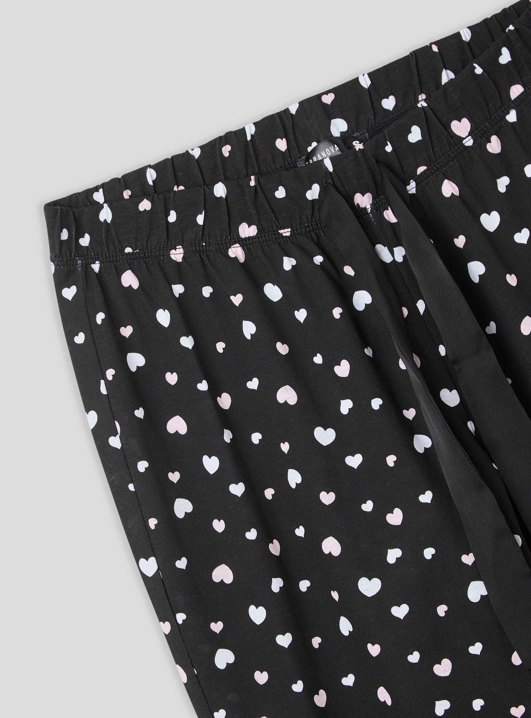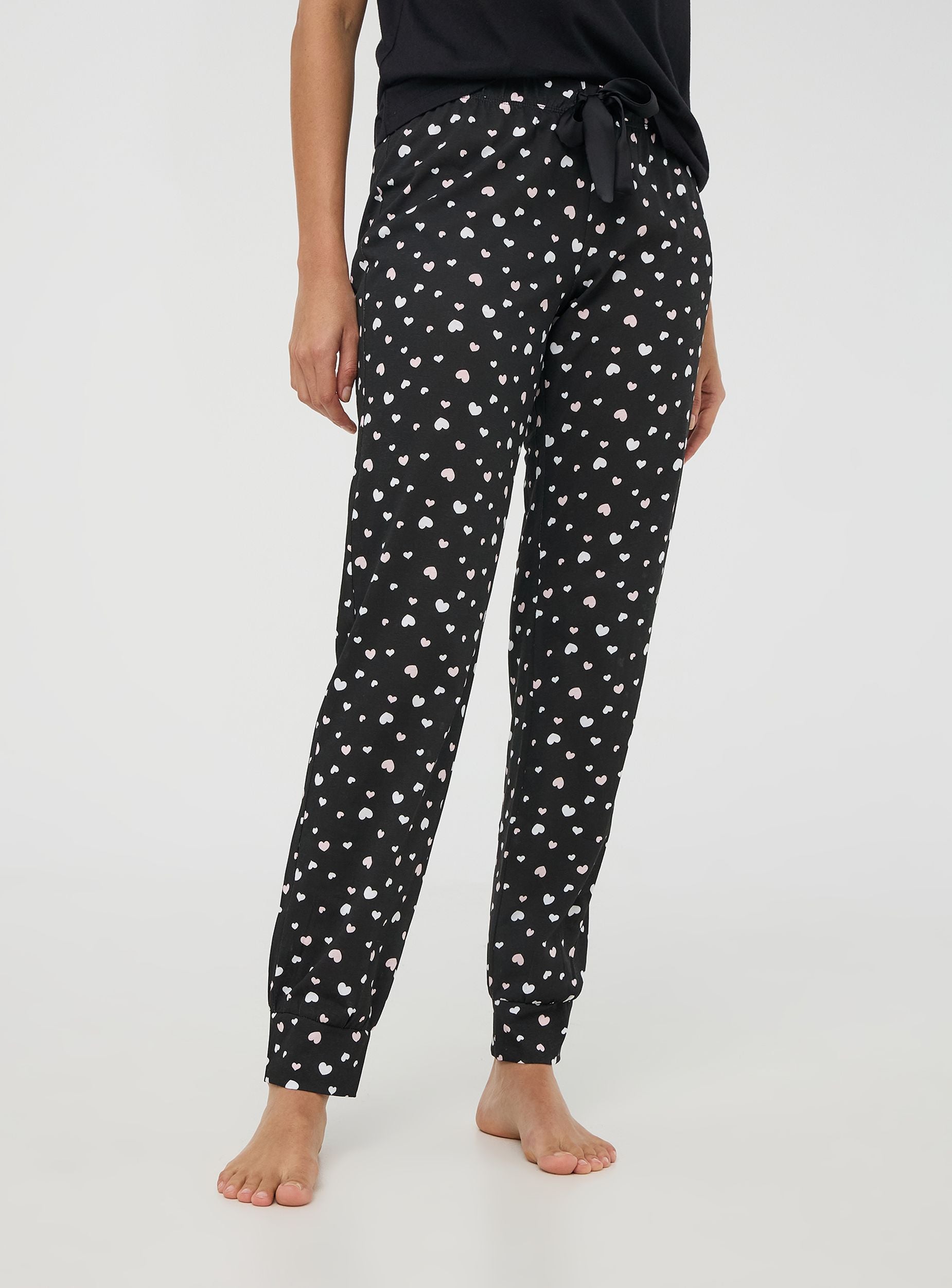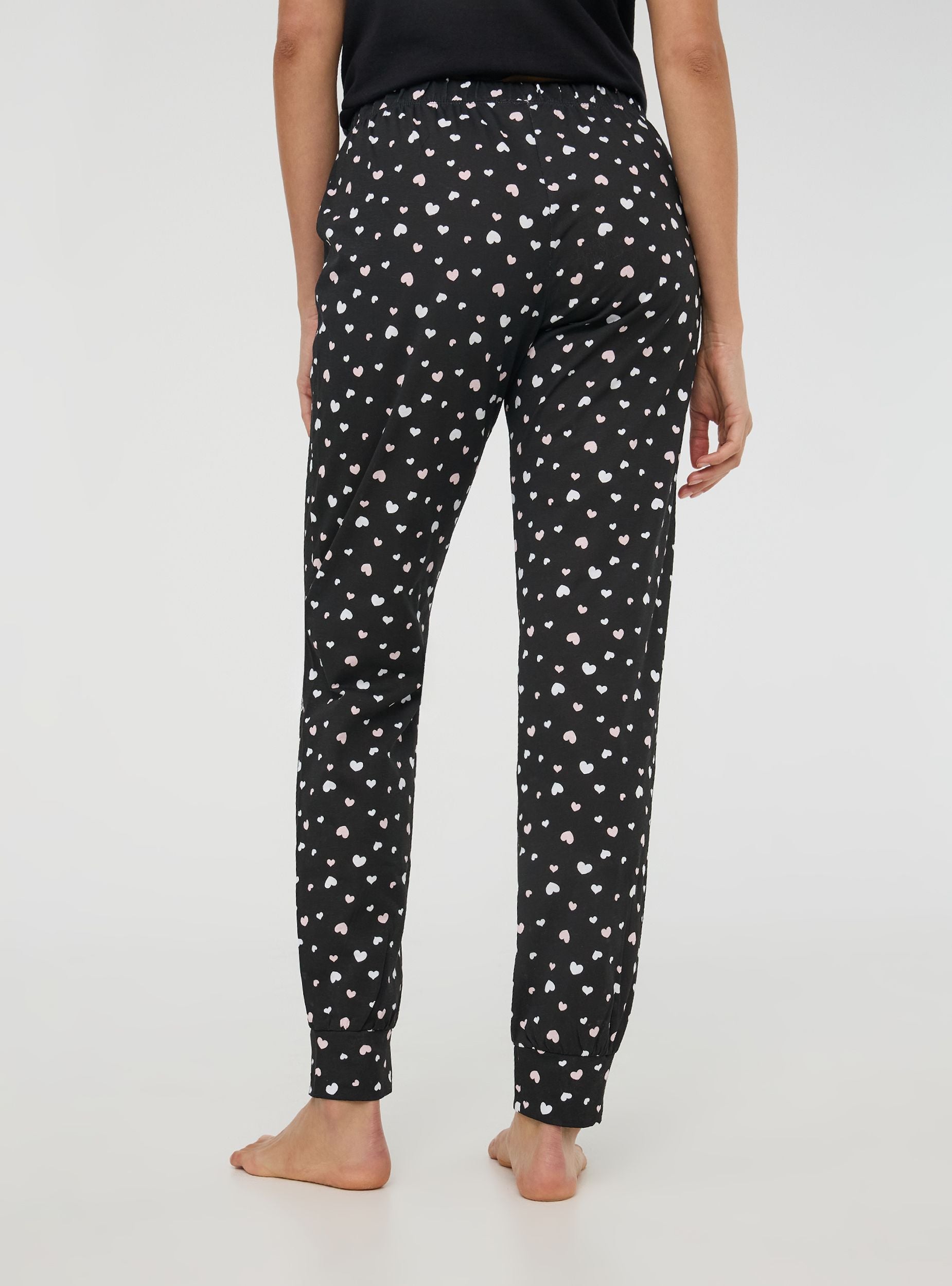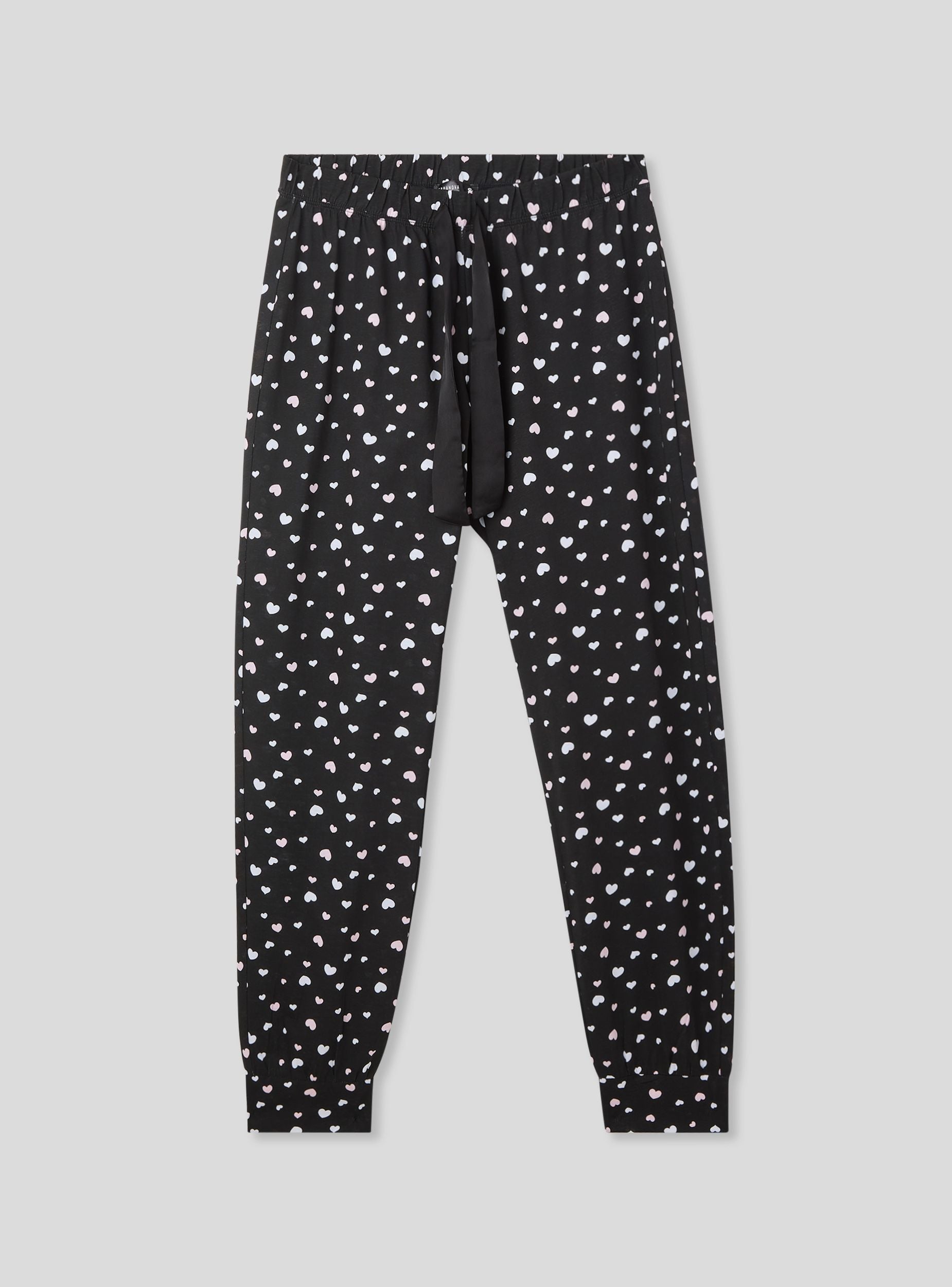 Pantaloni lunghi del pigiama da donna ideali per rilassarsi a casa o per notti confortevoli. Decorati con una romantica stampa cuori, offrono un design funzionale grazie all'elastico in vita con coulisse regolabile. I polsini alle caviglie assicurano una vestibilità perfetta, unendo stile e comodità per i tuoi momenti di relax.Dettagli