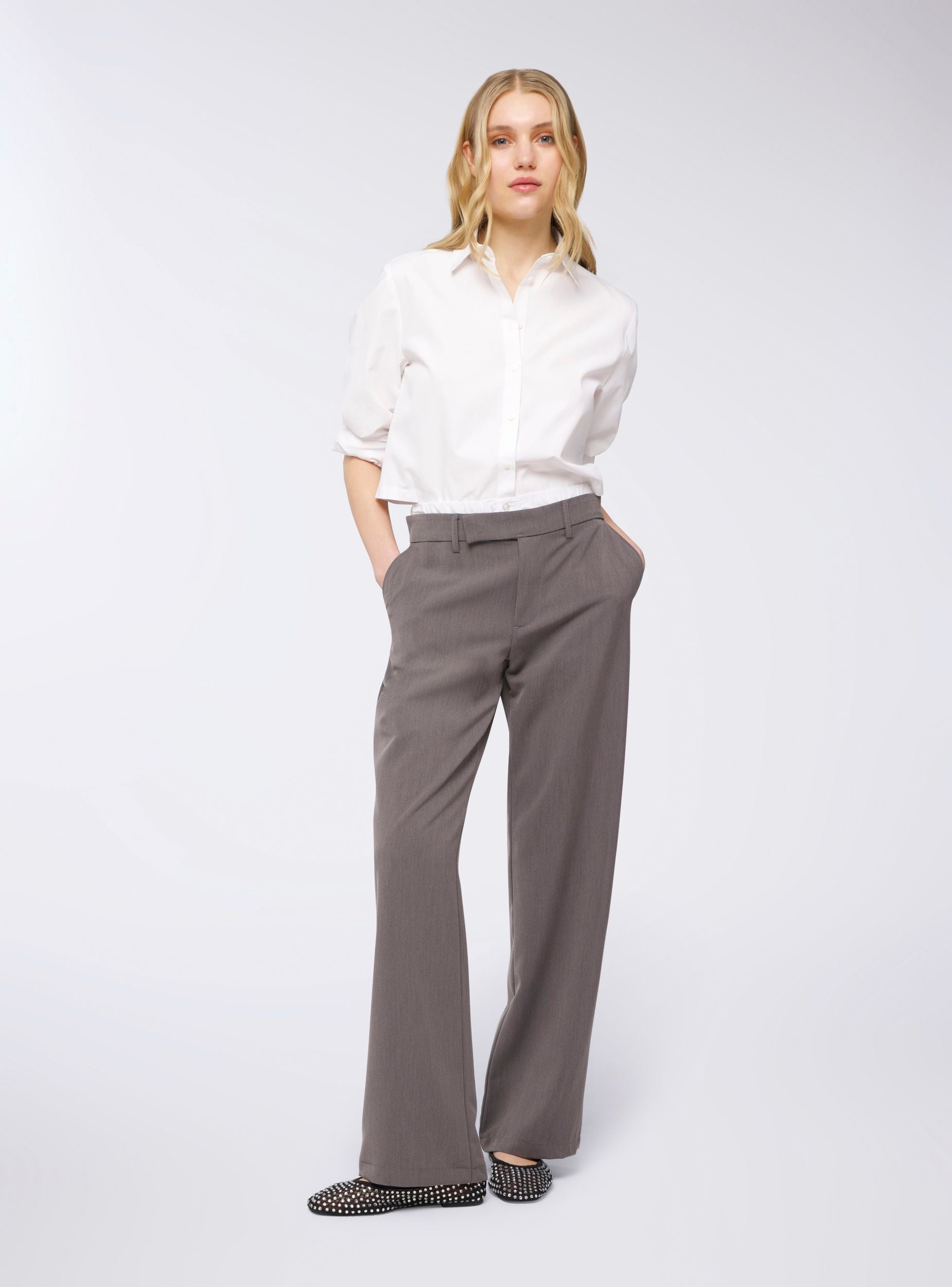 Pantaloni da donna dallo stile sofisticato e contemporaneo, caratterizzati da un taglio wide leg che slancia la figura e dona movimento al look. La fascia in vita con dettagli curati offre una vestibilità confortevole e strutturata, mentre la chiusura con zip, bottone e gancio garantisce praticità e sostegno. I passanti in vita permettono di aggiungere una cintura per un tocco personalizzato, mentre le tasche completano il design con funzionalità ed eleganza. Perfetti per creare outfit formali con una camicia e un blazer o per un look più rilassato con un top leggero e sandali.Dettagli