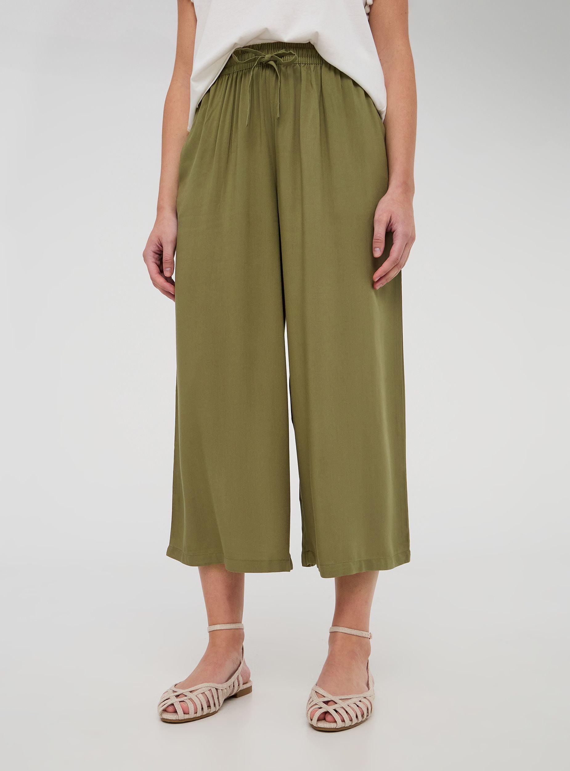 Pantaloni da donna caratterizzati da un design tinta unita con linea ampia a palazzo. La lunghezza crop dona un tocco moderno e versatile, perfetto per abbinamenti casual o eleganti. Sono dotati di tasche laterali pratiche e funzionali, oltre a una comoda coulisse in vita che permette di regolare la vestibilità in modo ottimale. L'elastico in vita assicura comfort e flessibilità durante l'uso, rendendo questi pantaloni ideali per chi cerca uno stile sofisticato senza rinunciare alla comodità.Dettagli