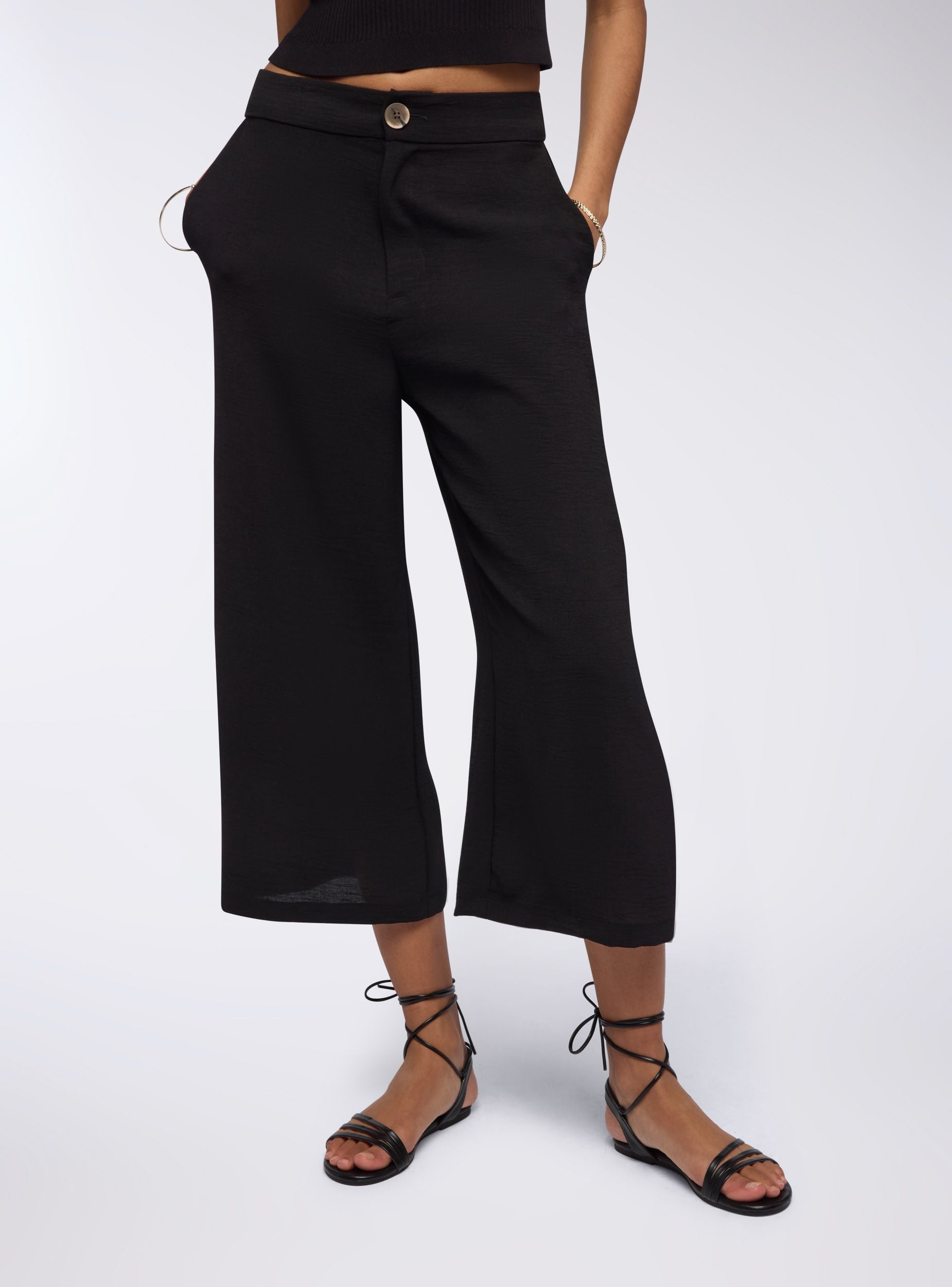 Pantaloni da donna dallo stile contemporaneo, perfetti per un look casual-chic nelle giornate estive. La vestibilità ampia palazzo assicura comfort e freschezza, ideale per abbinamenti con top aderenti o bluse leggere. Versatili per il tempo libero o per un outfit rilassato ma curato, questi pantaloni cropped sono un must per la stagione.Dettagli
