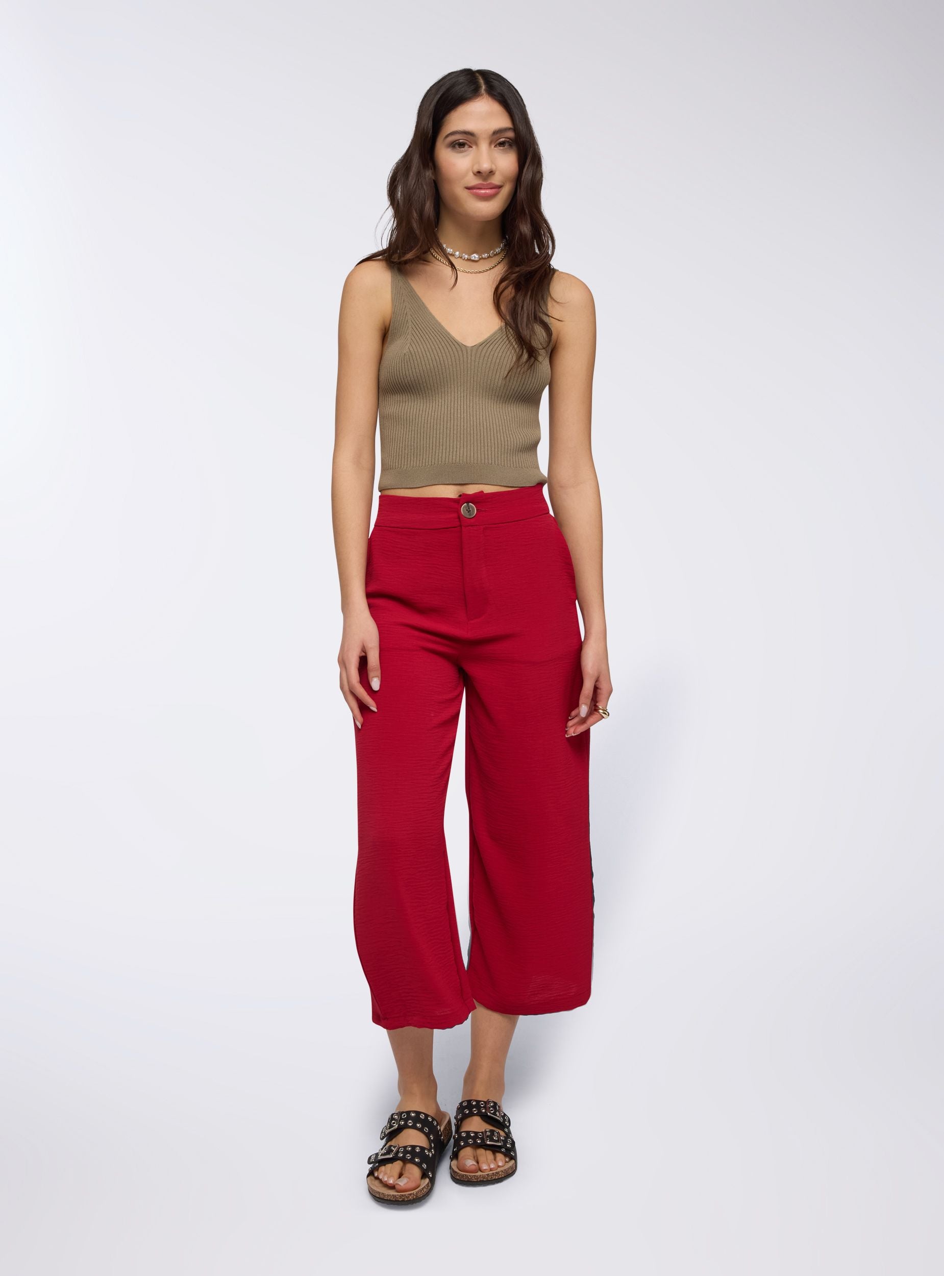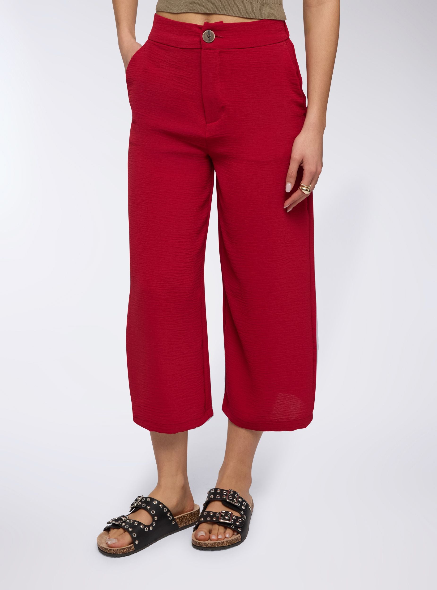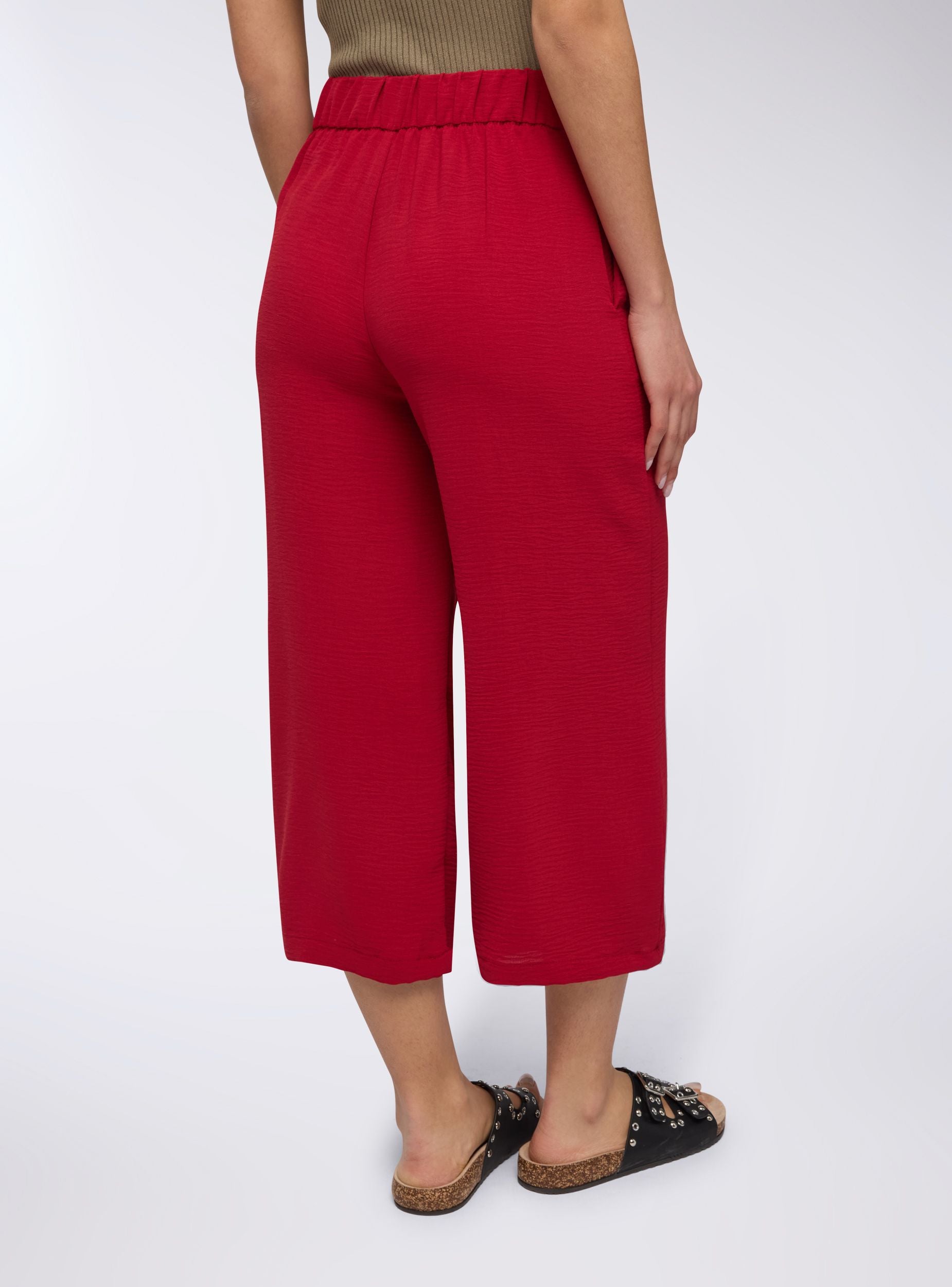 Pantaloni da donna dallo stile contemporaneo, perfetti per un look casual-chic nelle giornate estive. La vestibilità ampia palazzo assicura comfort e freschezza, ideale per abbinamenti con top aderenti o bluse leggere. Versatili per il tempo libero o per un outfit rilassato ma curato, questi pantaloni cropped sono un must per la stagione.Dettagli