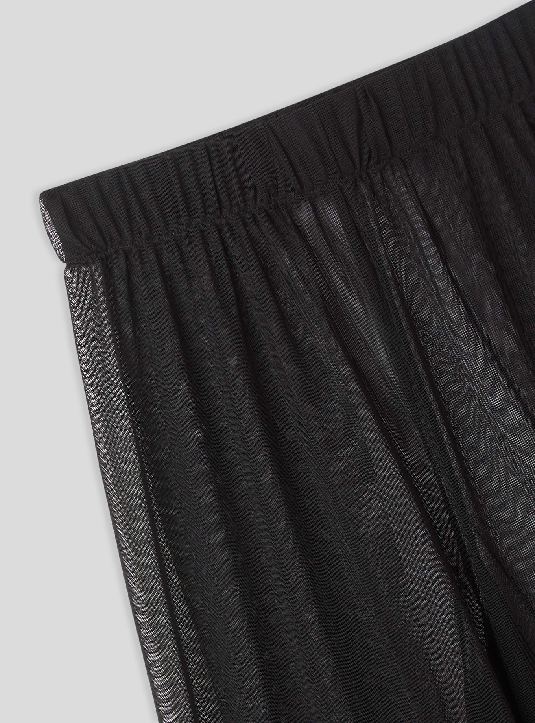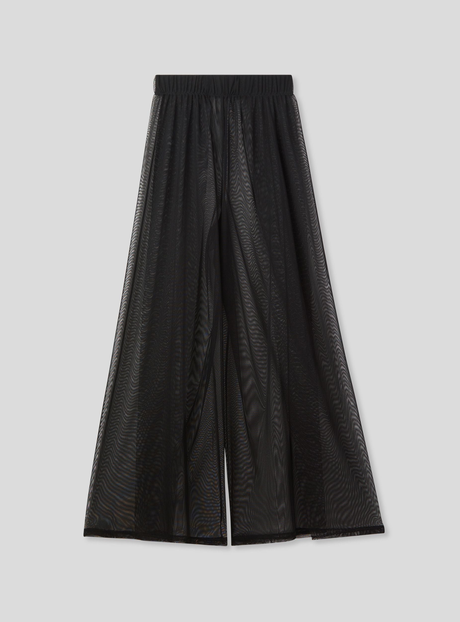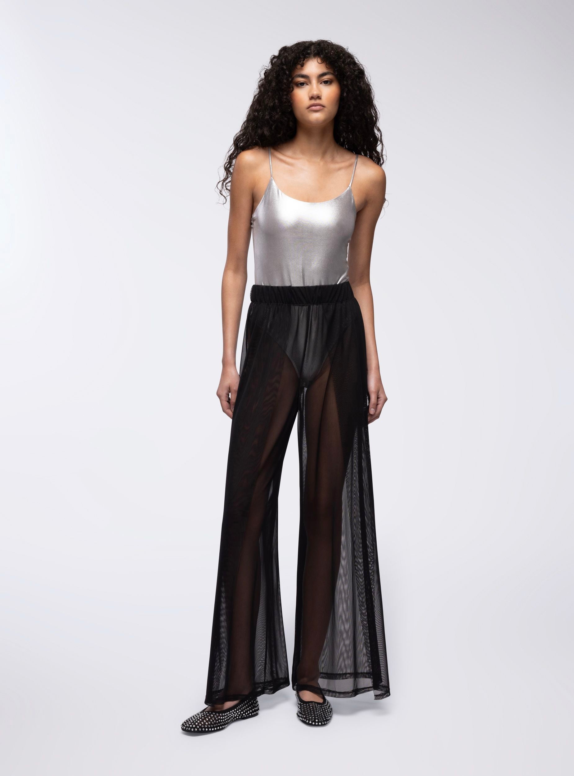 Pantaloni palazzo da donna. Un modello ampio e leggerissimo, perfetto per creare look femminili e ariosi. Questo pantalone palazzo da donna si distingue per il design effetto trasparente, ideale per essere indossato sopra shorts, body o costumi. La vita elasticizzata lo rende comodo da indossare, mentre la silhouette fluida esalta i movimenti con eleganza. Ideale per l’estate, per look da spiaggia o serate in stile boho chic.Dettagli