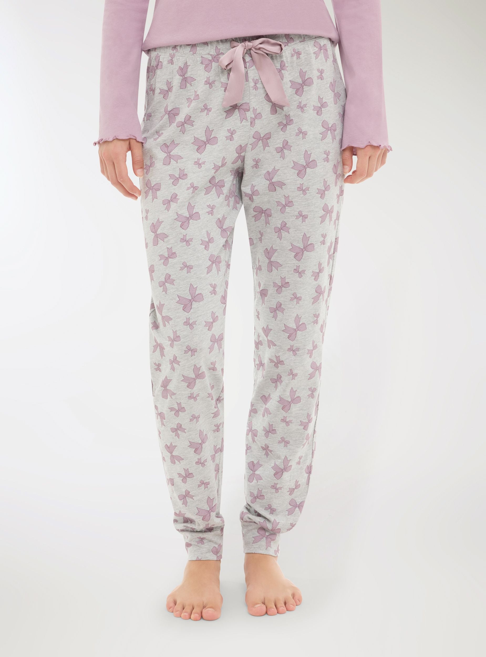 Pantaloni lunghi del pigiama da donna con fantasia con fiocchi, ideali per un look casual e rilassato. Presentano una vita con coulisse per una vestibilità regolabile e comoda. Perfetti per essere abbinati a magliette. La gamba dritta con polsino e la vestibilità regular li rendono adatti per momenti di relax.Dettagli