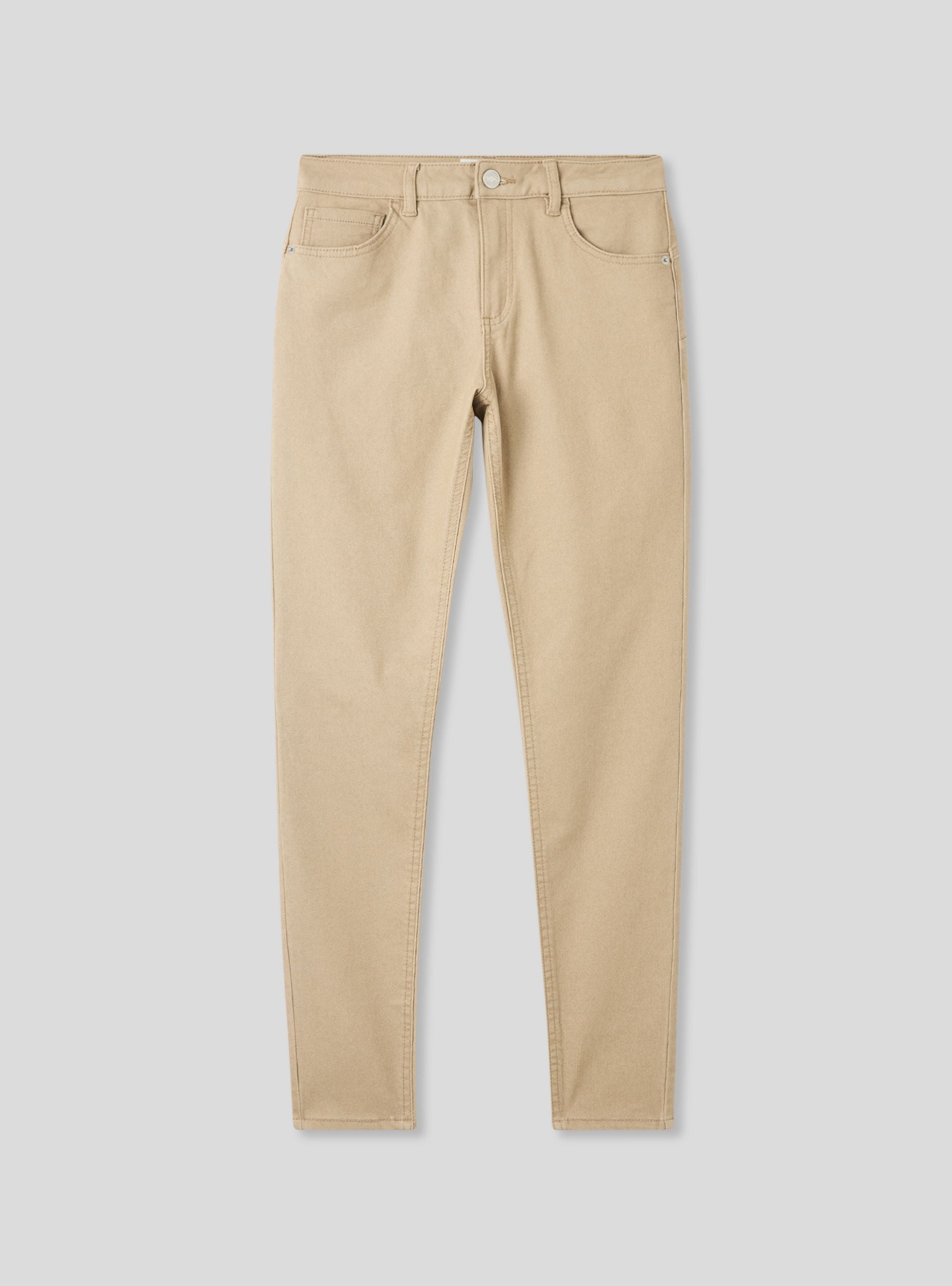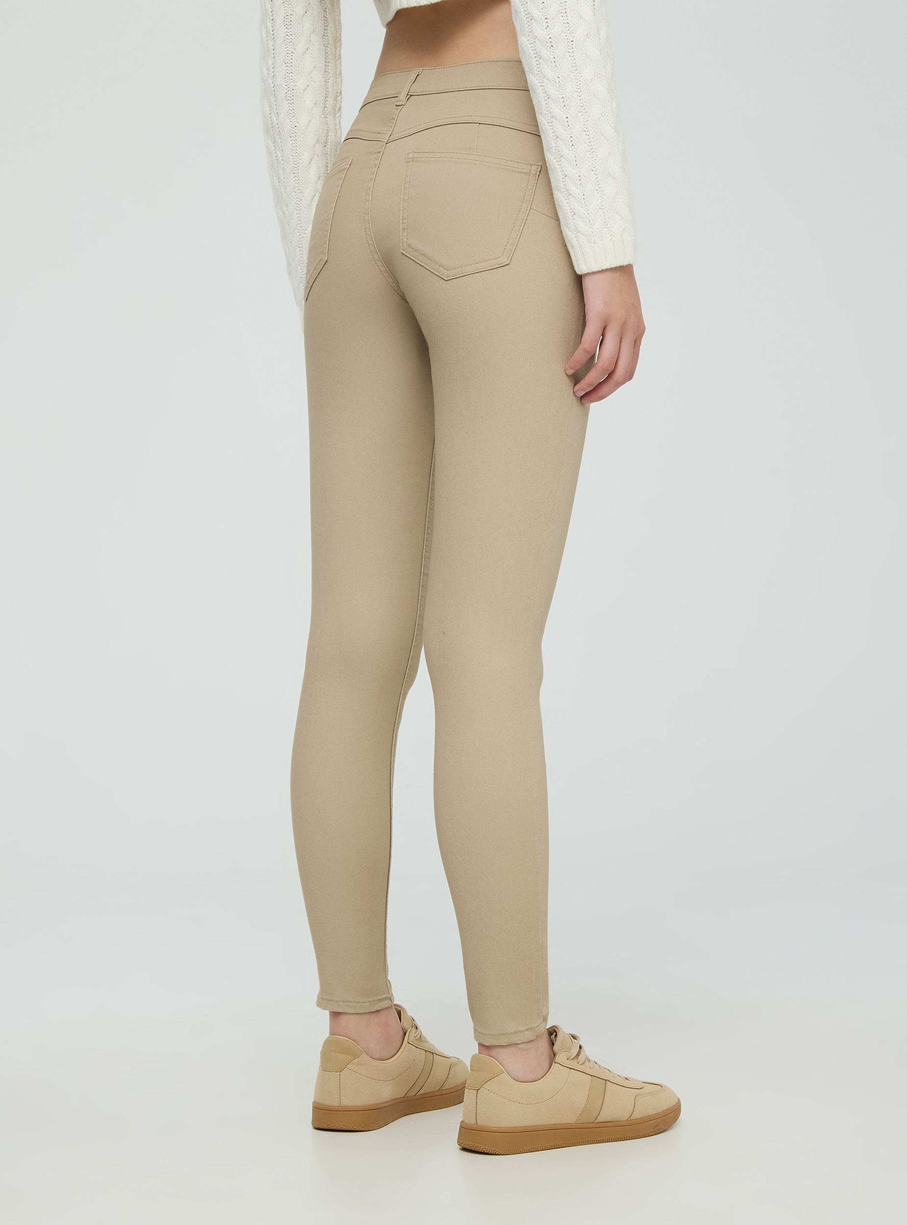 Pantaloni skinny da donna effetto push up a tinta unita. Arricchiti da una chiusura con bottone metallico e zip nascosta, presentano cinque tasche funzionali. Le cuciture e i rivetti metallici completano il design moderno. La vestibilità aderente li rende ideali per un look casual chic, perfetti per il lavoro o uscite informali.Dettagli