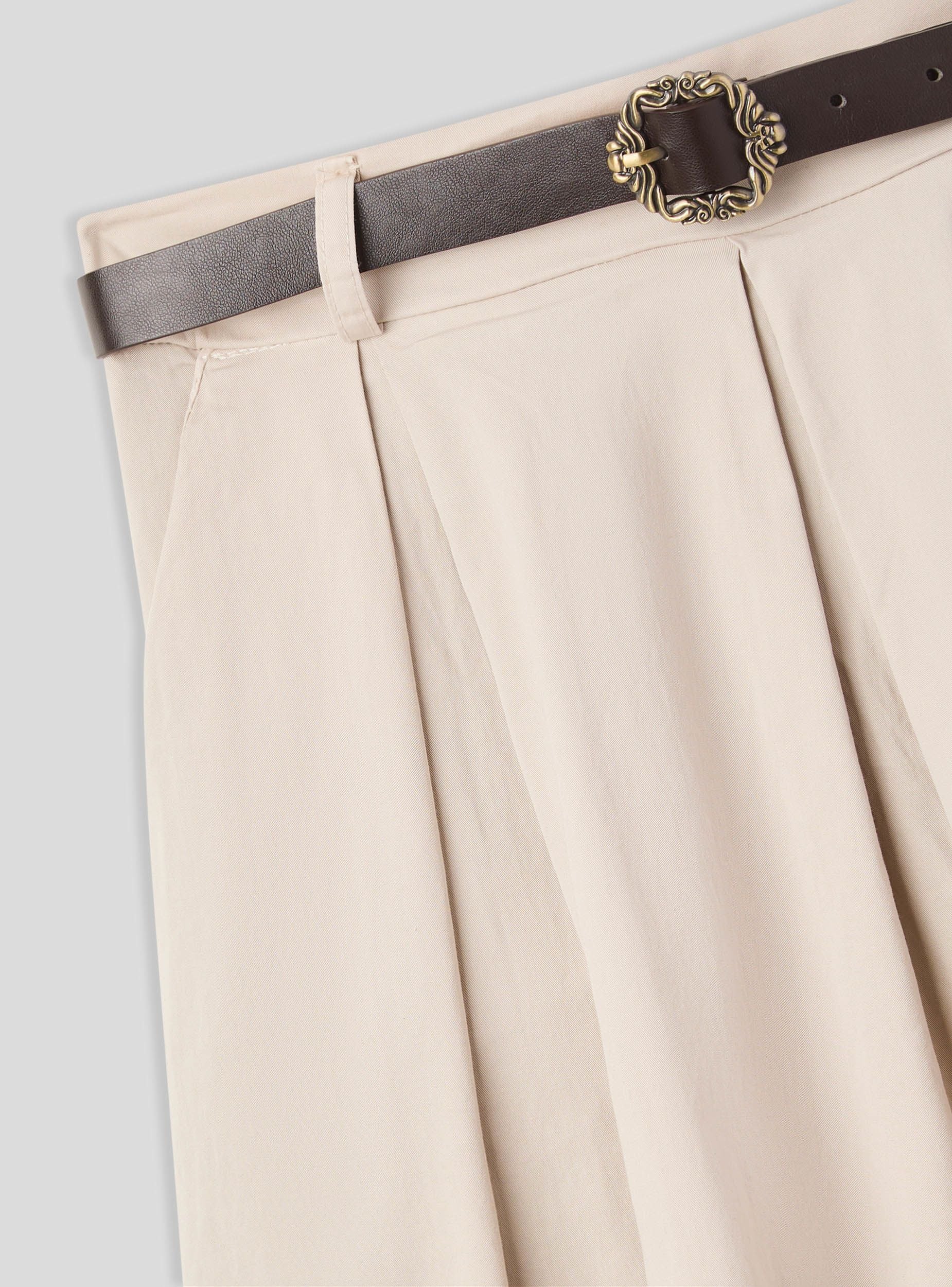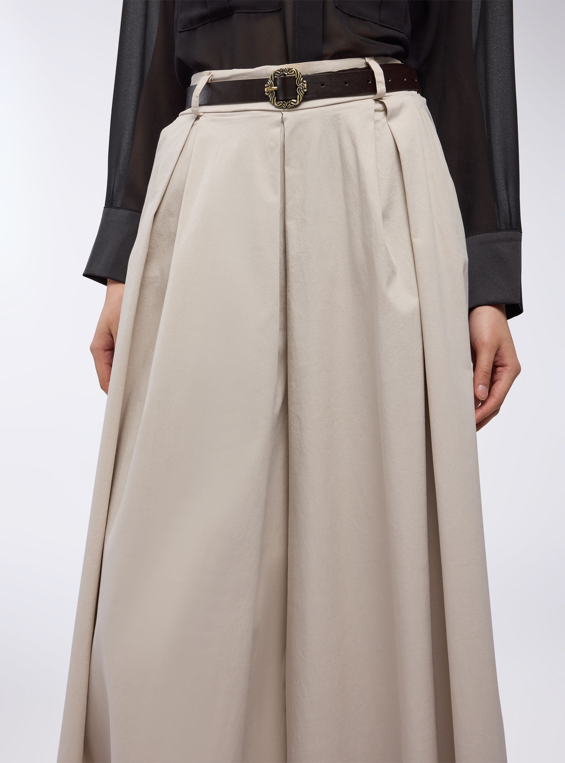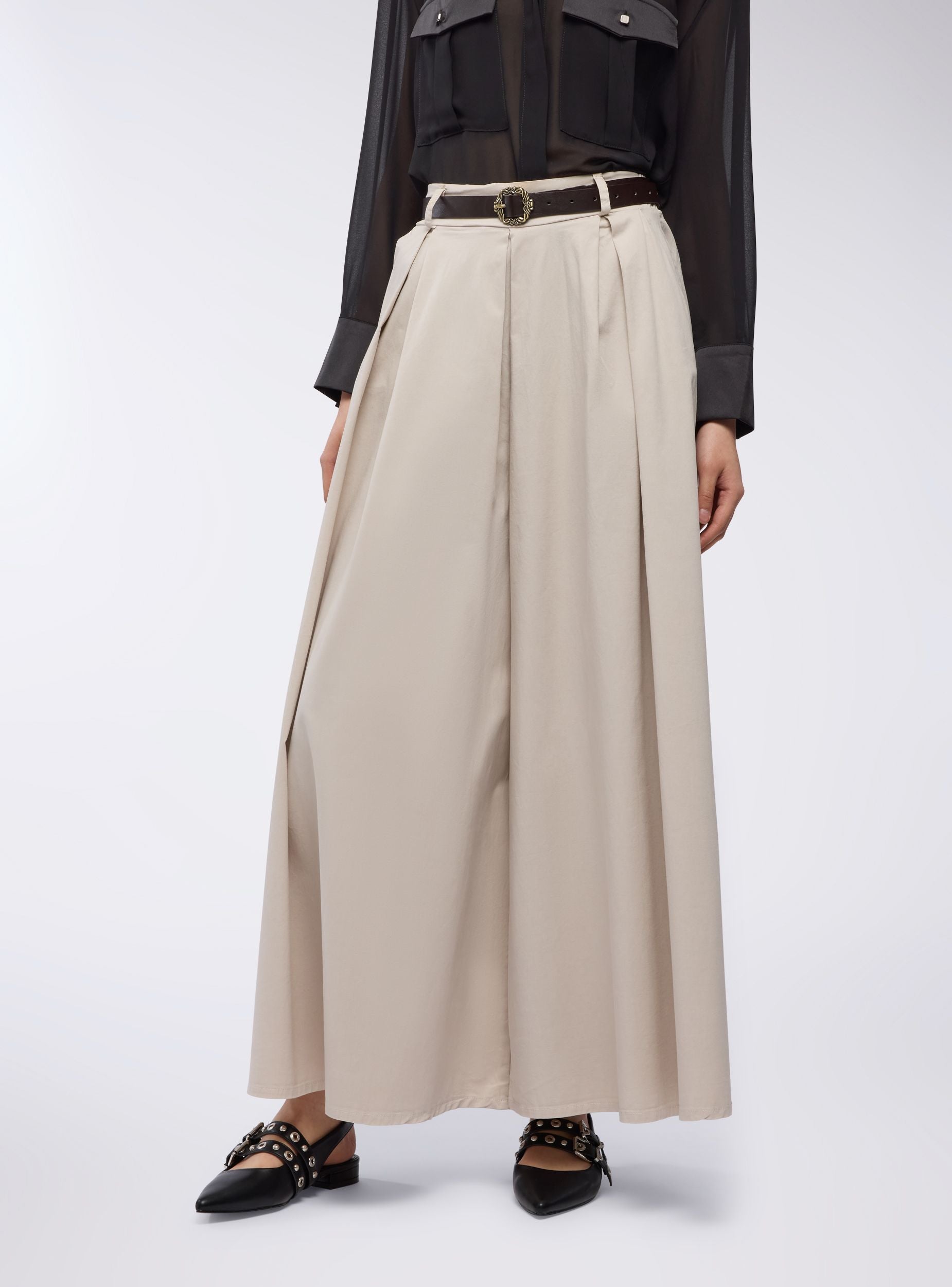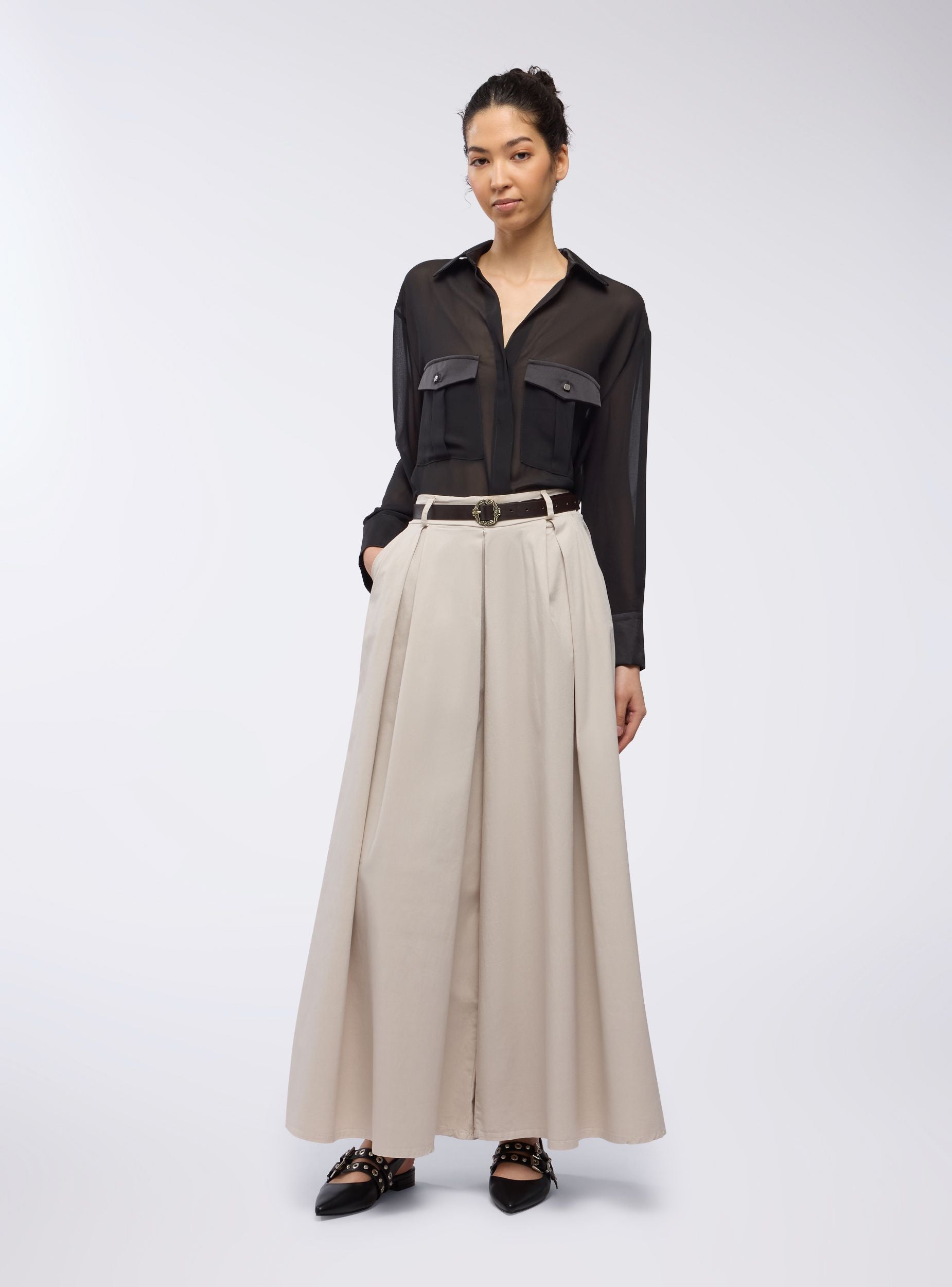 Pantaloni da donna dal taglio super wideleg con pinces marcate, pensati per chi ama uno stile deciso e di grande impatto. La linea estremamente ampia richiama l’eleganza di una gonna lunga, mantenendo però la praticità del pantalone. La vita alta è valorizzata da una cintura con fibbia decorativa che aggiunge un tocco sofisticato. Perfetti per un look ricercato da giorno o da sera, si abbinano facilmente a top aderenti o camicie fluide per creare contrasti di volume e stile.Dettagli