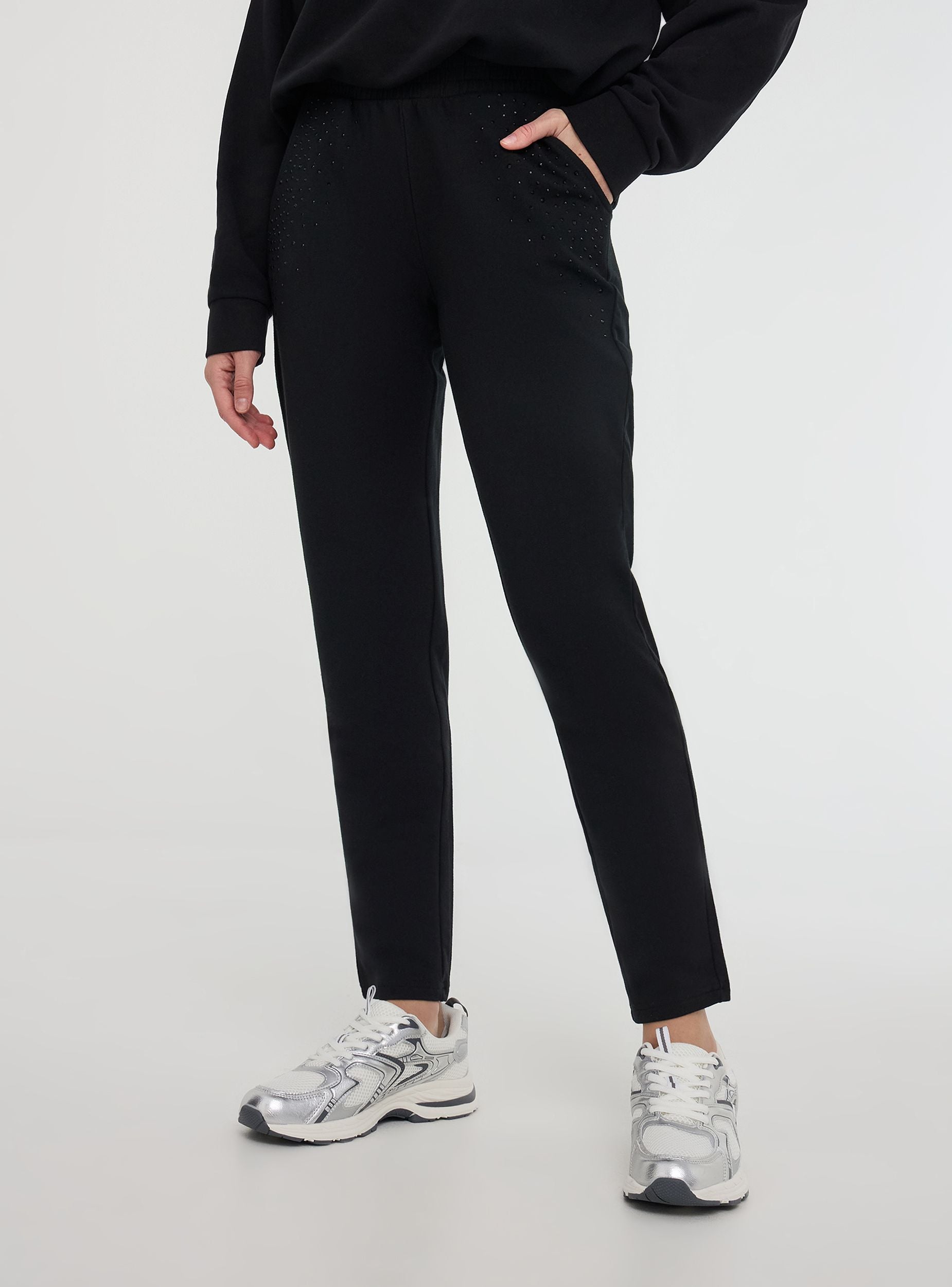 Pantaloni della tuta leggeri da donna dal taglio chino e vestibilità skinny, perfetti per un look casual ma con un tocco di eleganza. Il design a tinta unita è arricchito da dettagli di strass sulle tasche, che donano luminosità e raffinatezza. Ideali per il tempo libero o per un'uscita informale, si abbinano perfettamente con sneakers e top aderenti per un outfit moderno e dinamico.Dettagli