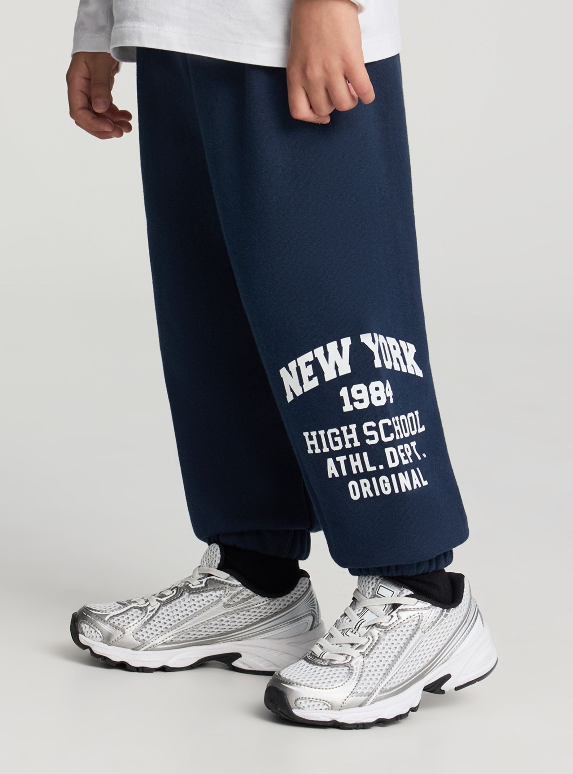 Pantaloni pesanti della tuta da bimbo ideali per il tempo libero e le attività sportive. Presentano una scritta sulla gamba e una vita elasticizzata con coulisse regolabile per un comfort ottimale. Il fondo elasticizzato assicura una vestibilità pratica e moderna, perfetta da abbinare a felpe o t-shirt per un look casual e dinamico.Dettagli