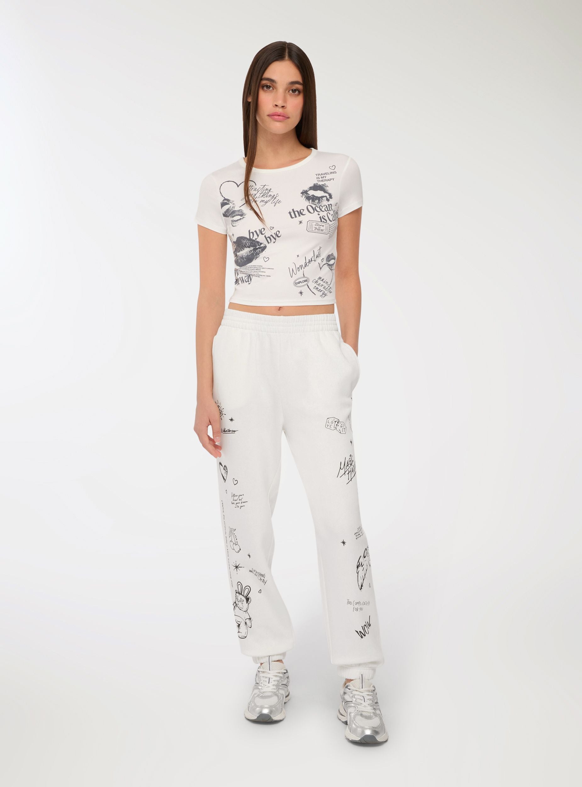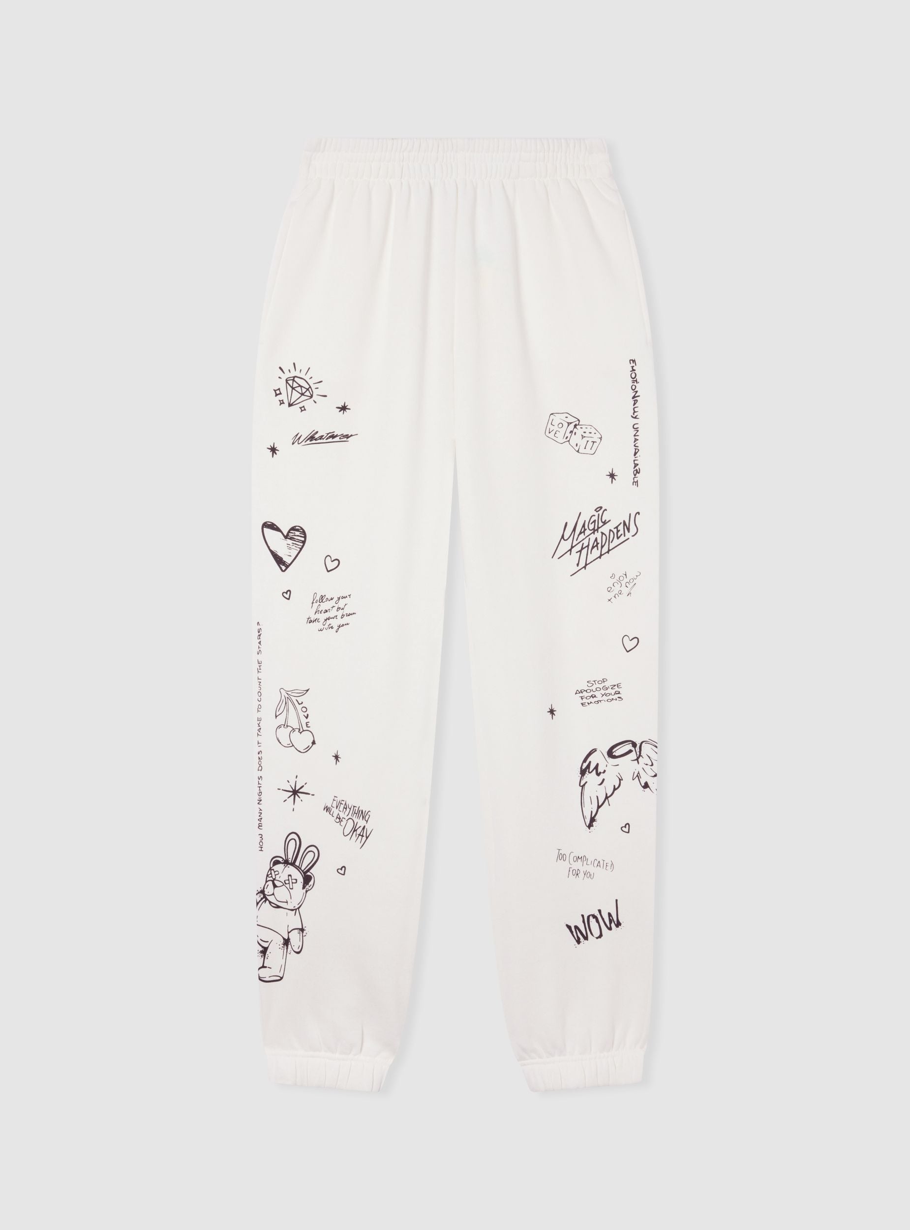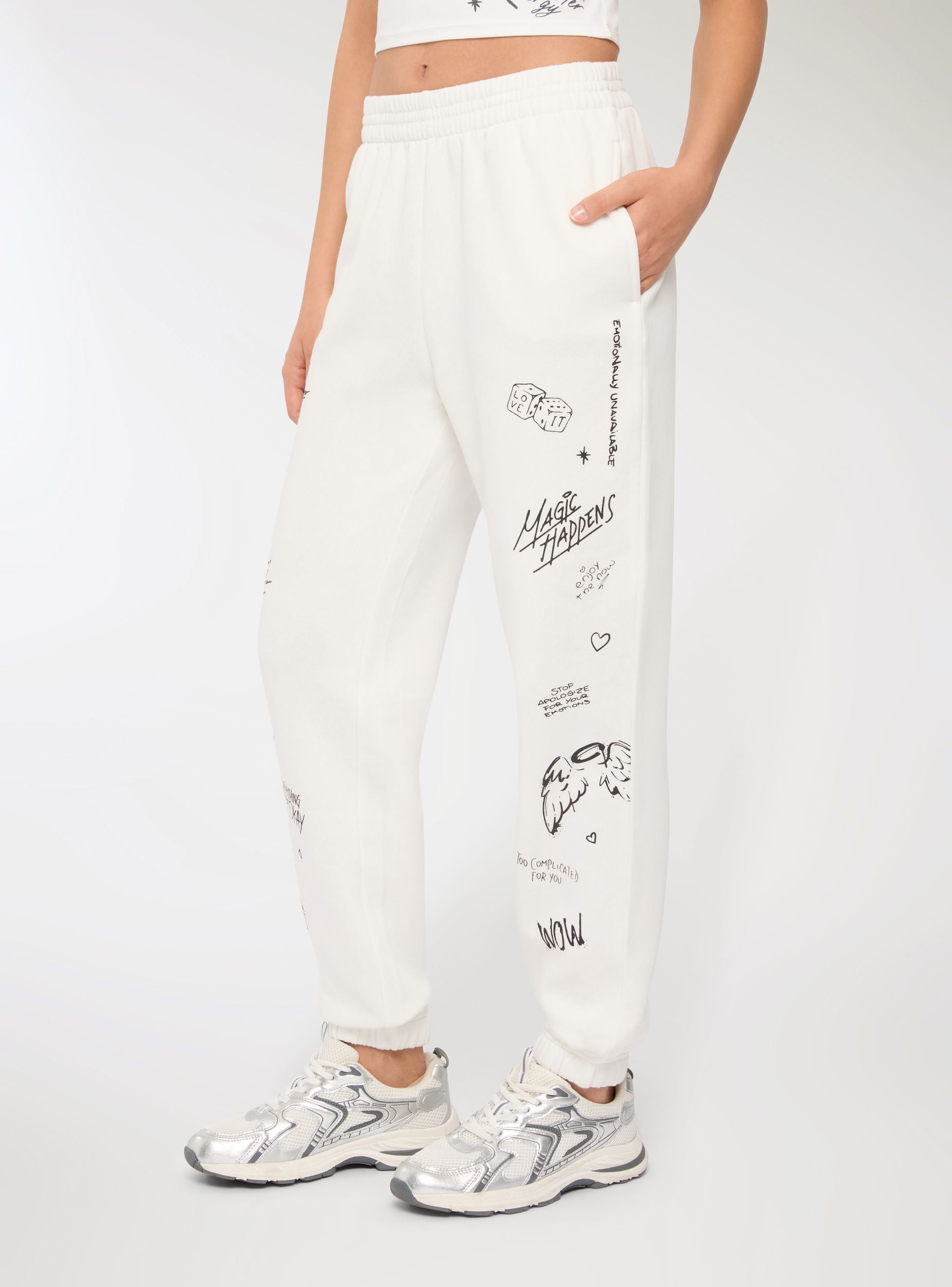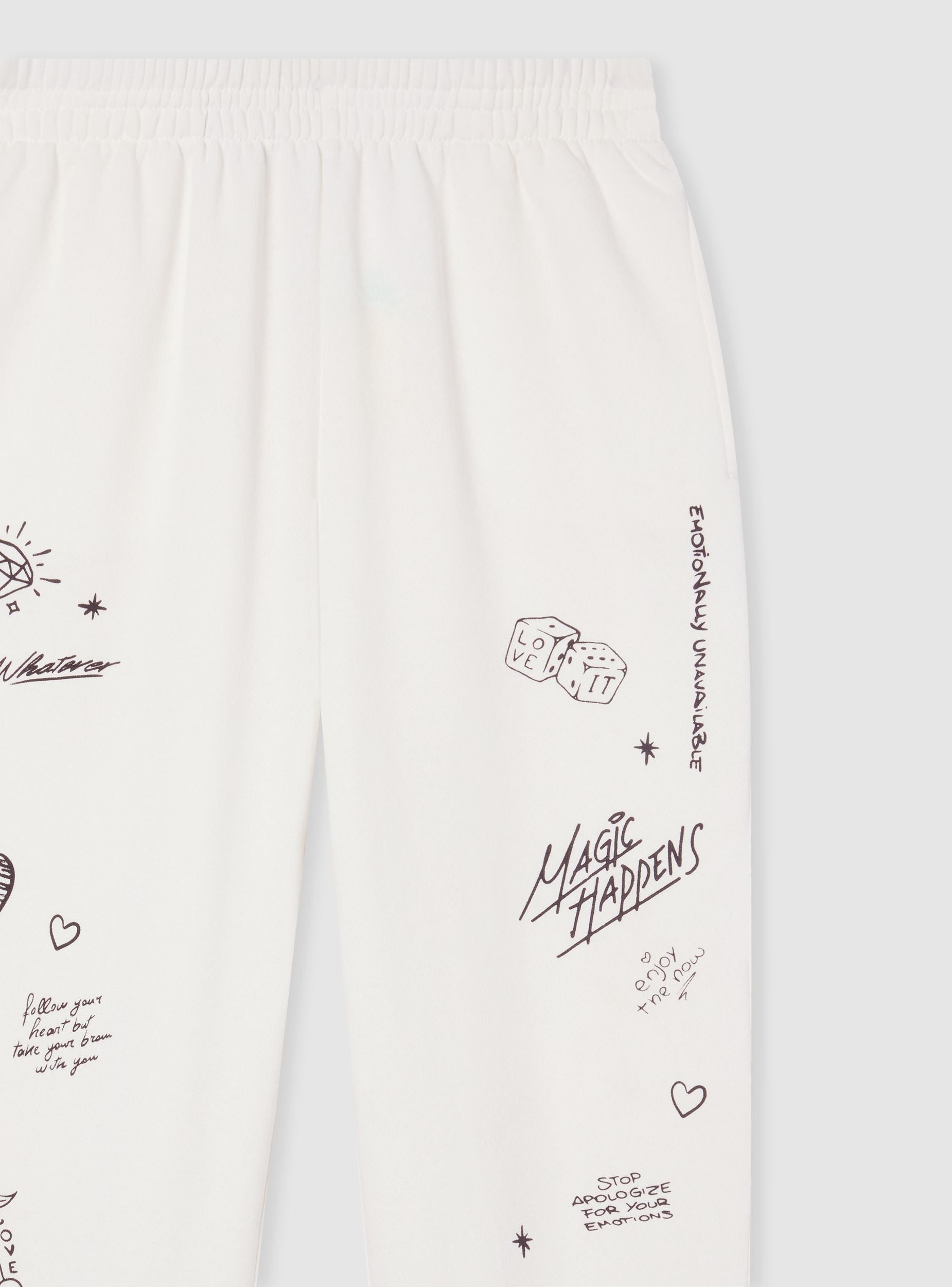 Pantaloni tuta da donna con stampe graffiti. Ideali per un look casual e rilassato, questi pantaloni presentano una vestibilità comoda e un design moderno. Perfetti per il tempo libero o per un outfit sportivo, si abbinano facilmente a t-shirt e sneakers. La vita elasticizzata con coulisse garantisce comfort e praticità, mentre i polsini alle caviglie aggiungono un tocco di stile.