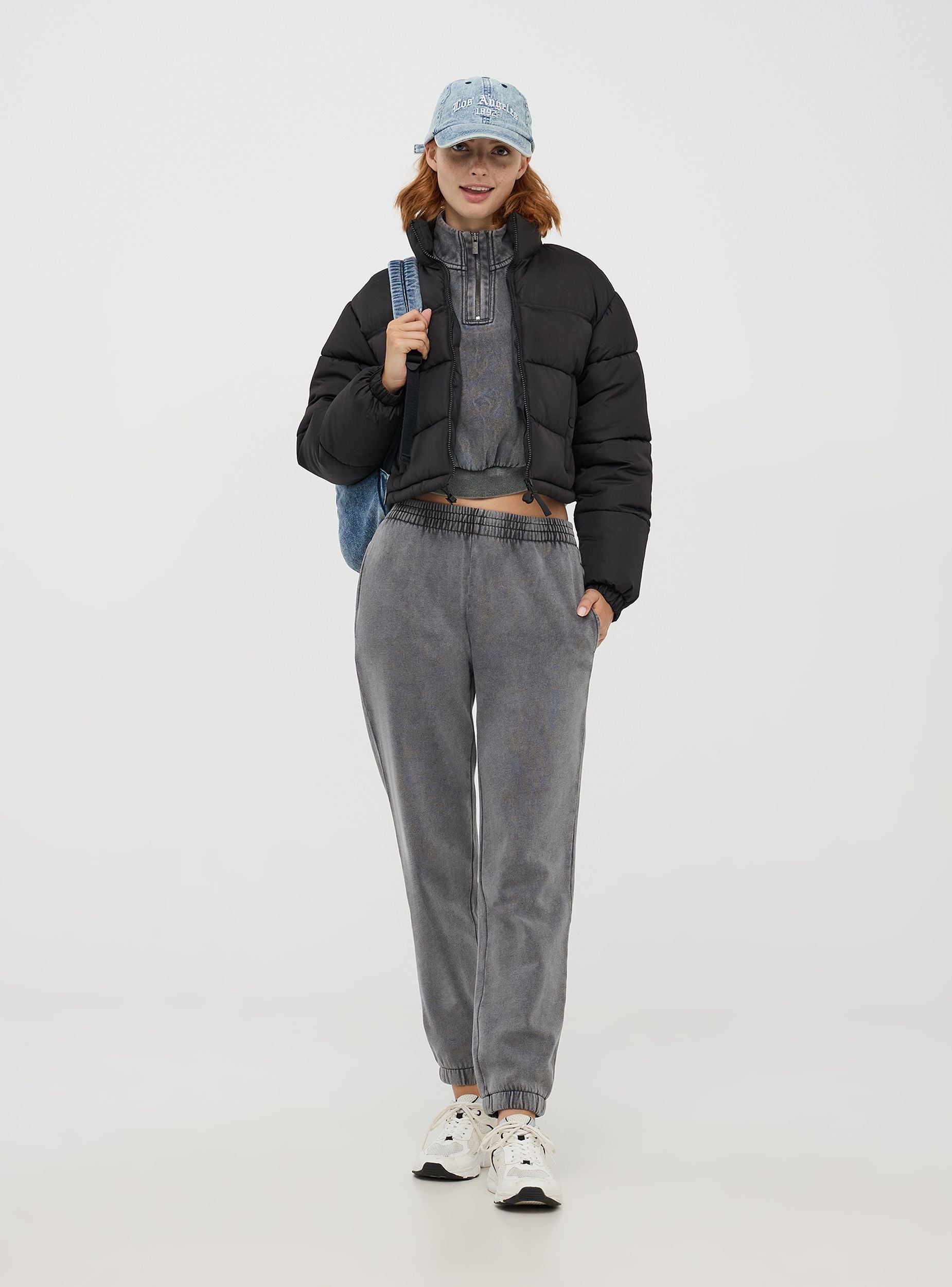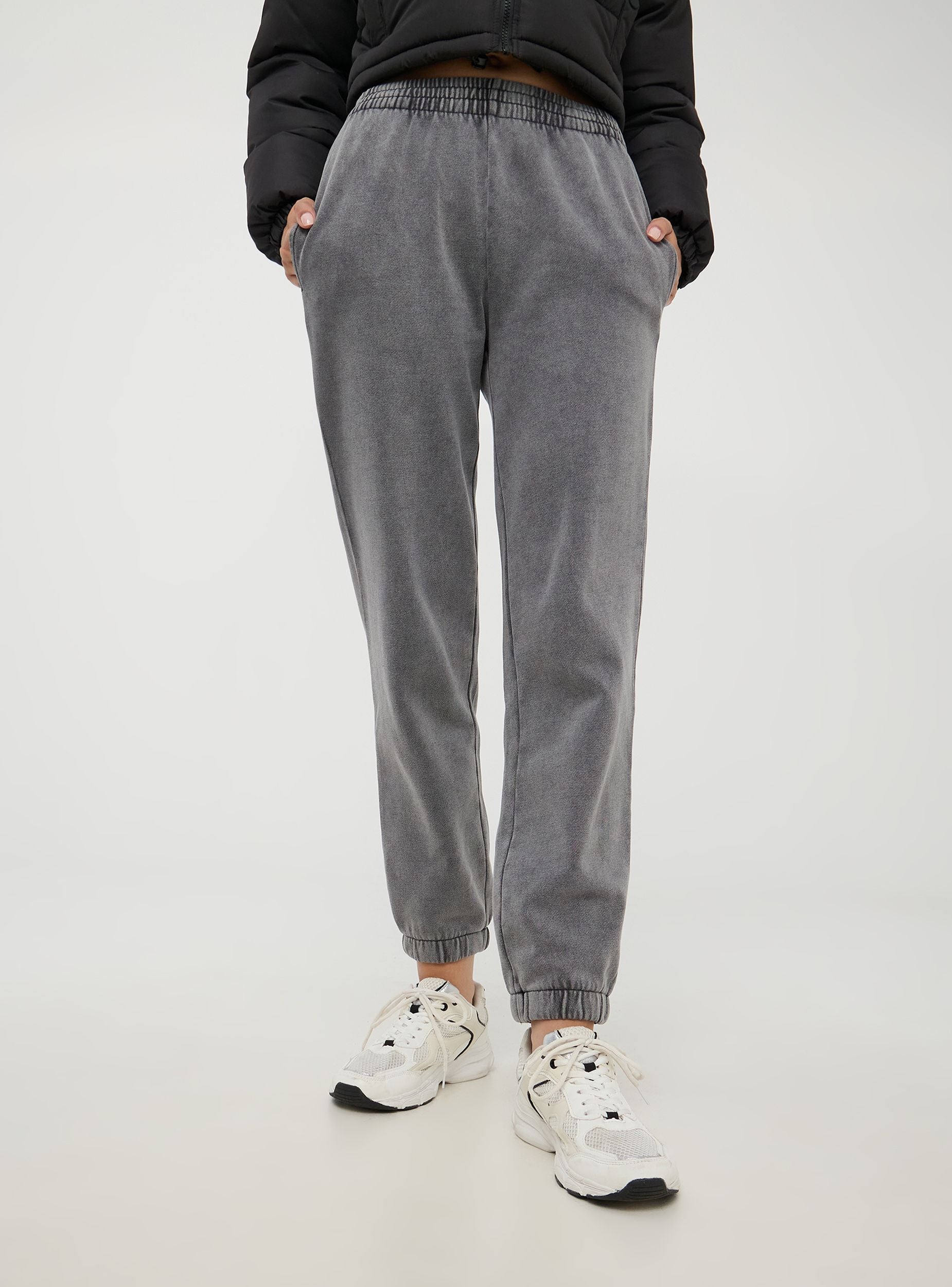 Pantaloni della tuta da donna a vita alta in tessuto pesante a tinta unita con effetto garment dyed, con tasche laterali. Presentano una vestibilità comoda con elastico in vita e alle caviglie, garantendo massimo comfort durante l'uso. La tinta unita rende questi pantaloni versatili e facili da abbinare con diversi outfit. Ideali per attività sportive, giornate casual o momenti di relax in casa, questi pantaloni della tuta sono perfetti per mantenere uno stile comodo e alla moda in ogni occasione.