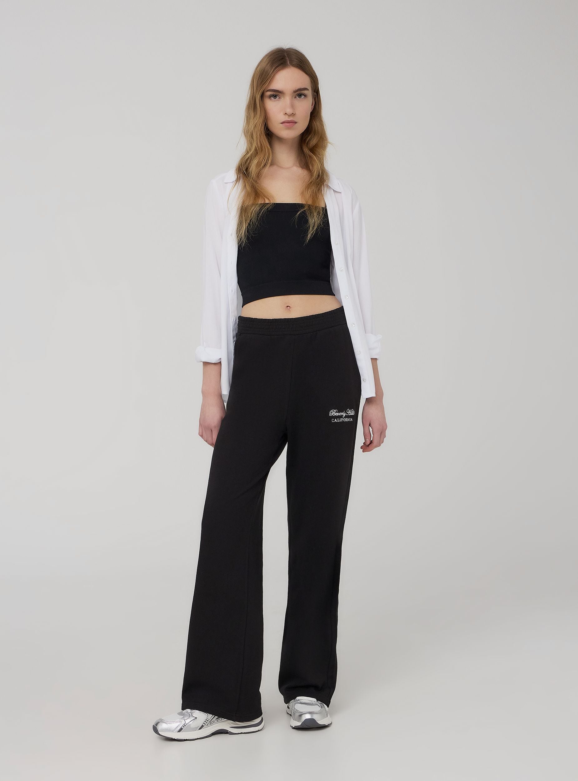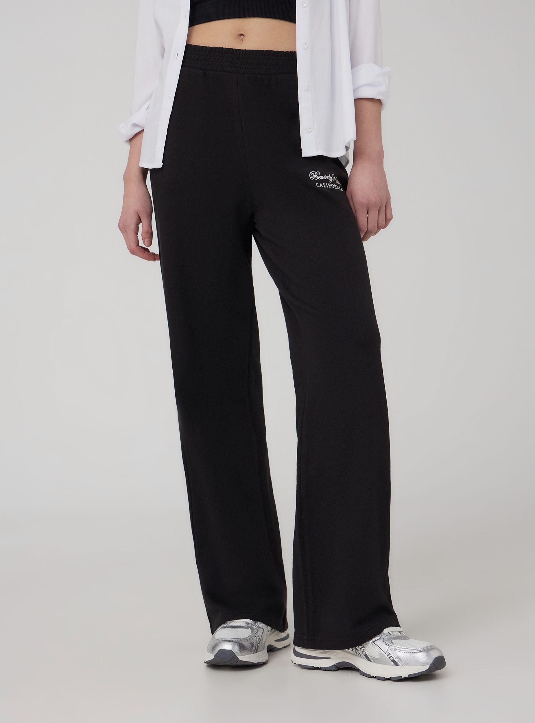 Pantaloni leggeri della tuta da donna dal taglio wide leg, perfetti per un look casual e confortevole. Il design a tinta unita si distingue per un ricamo ispirato allo stile college americano, che aggiunge un tocco sportivo e trendy. Dotati di pratiche tasche e di un elastico in vita che garantisce una vestibilità ottimale, sono ideali da abbinare a felpe oversize e sneakers per il tempo libero o a un crop top per un outfit più dinamico. Versatili e alla moda, accompagnano con stile ogni momento della giornata.Dettagli