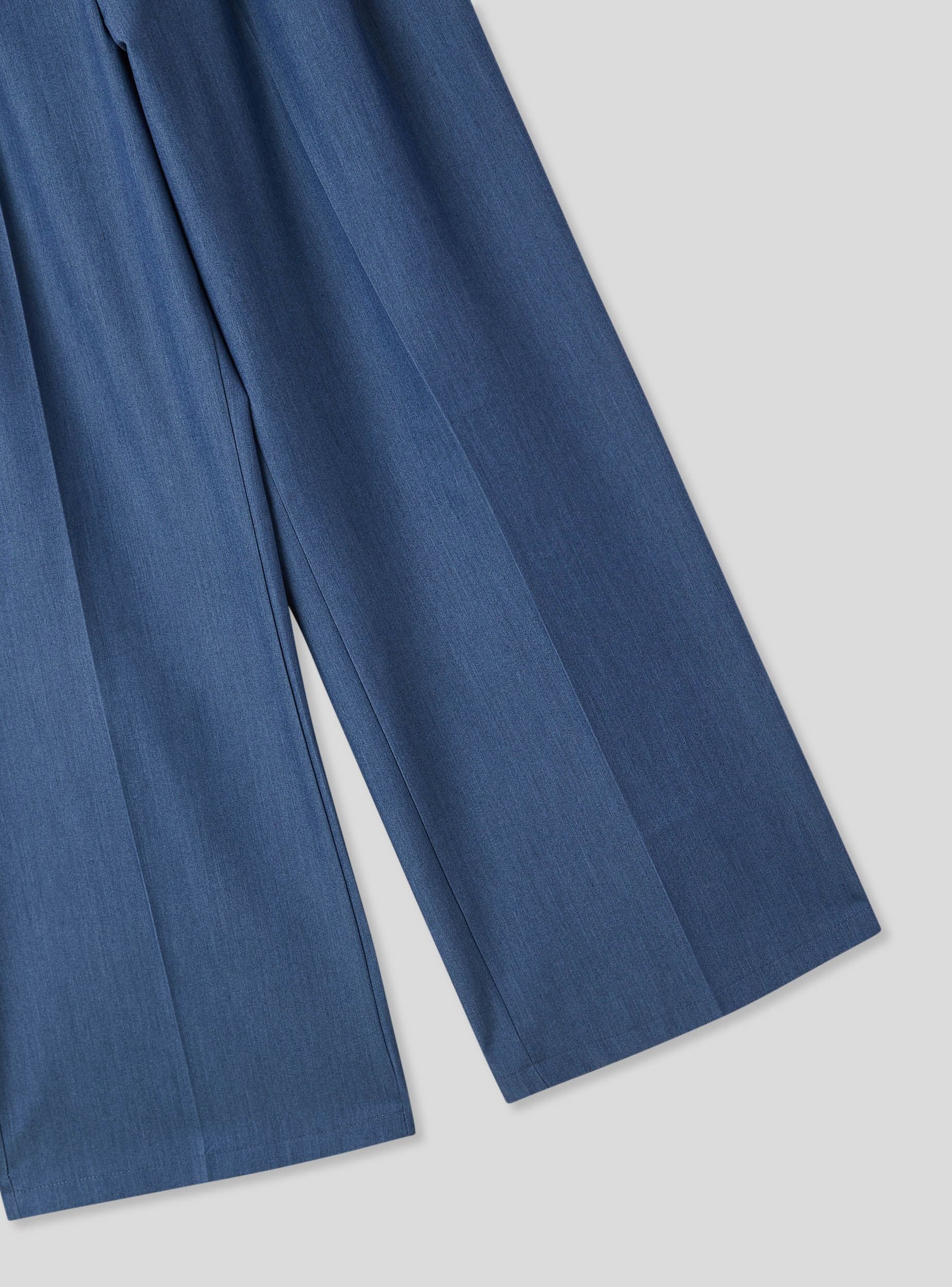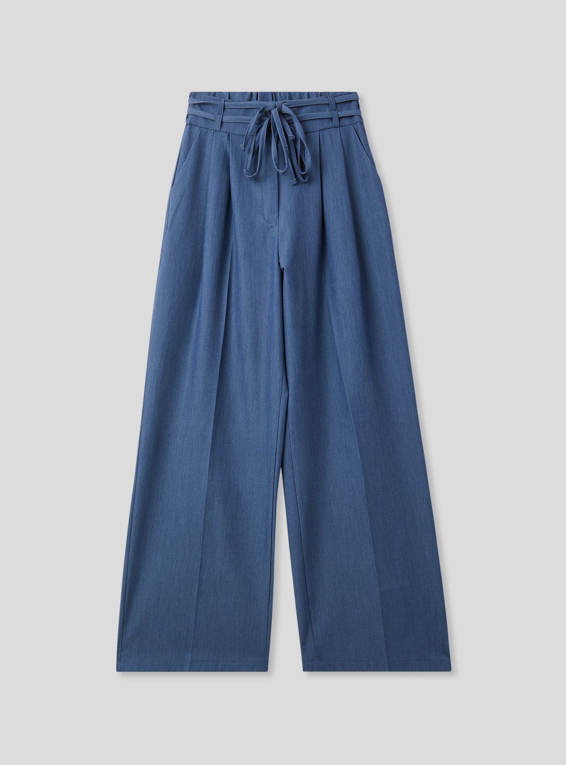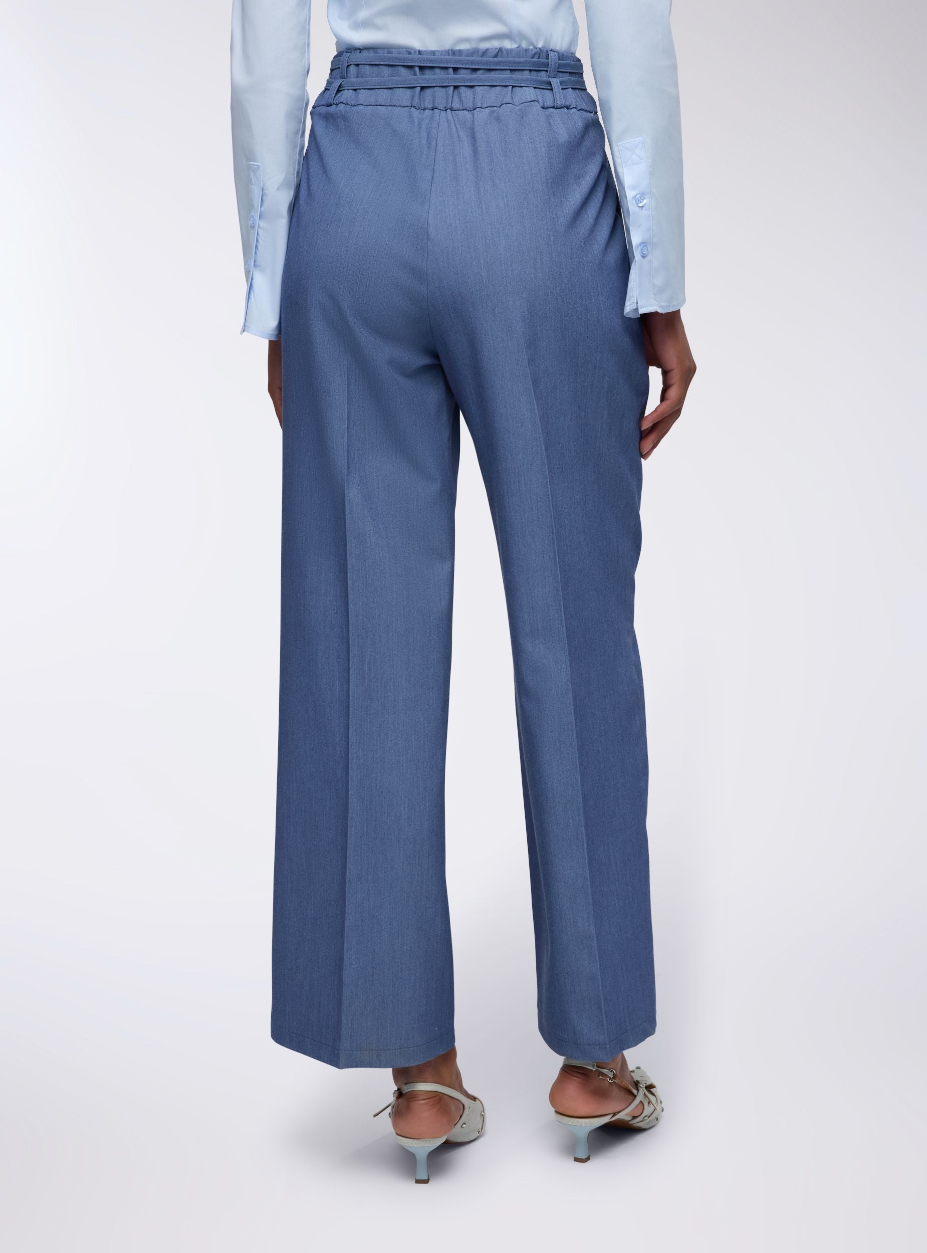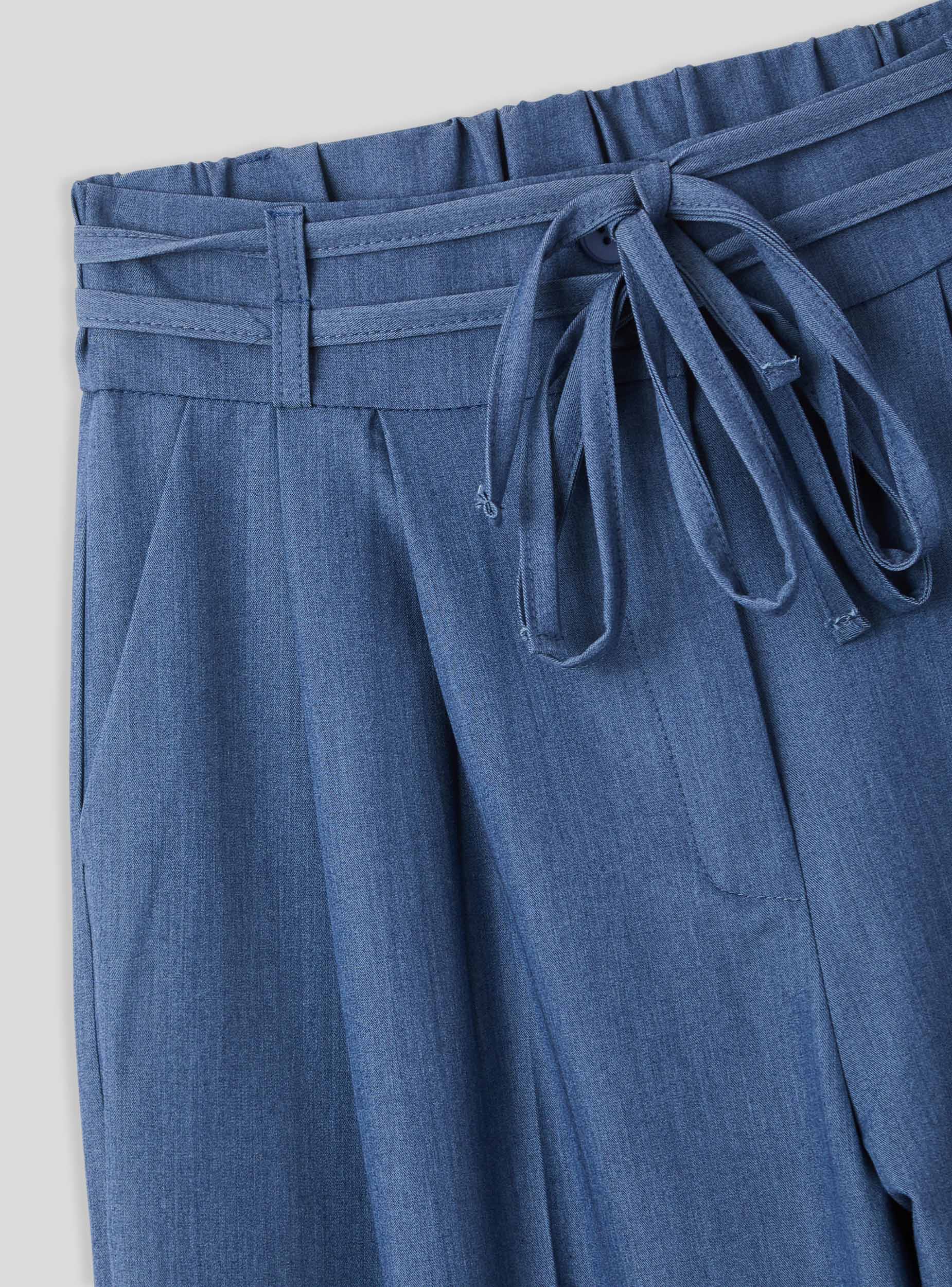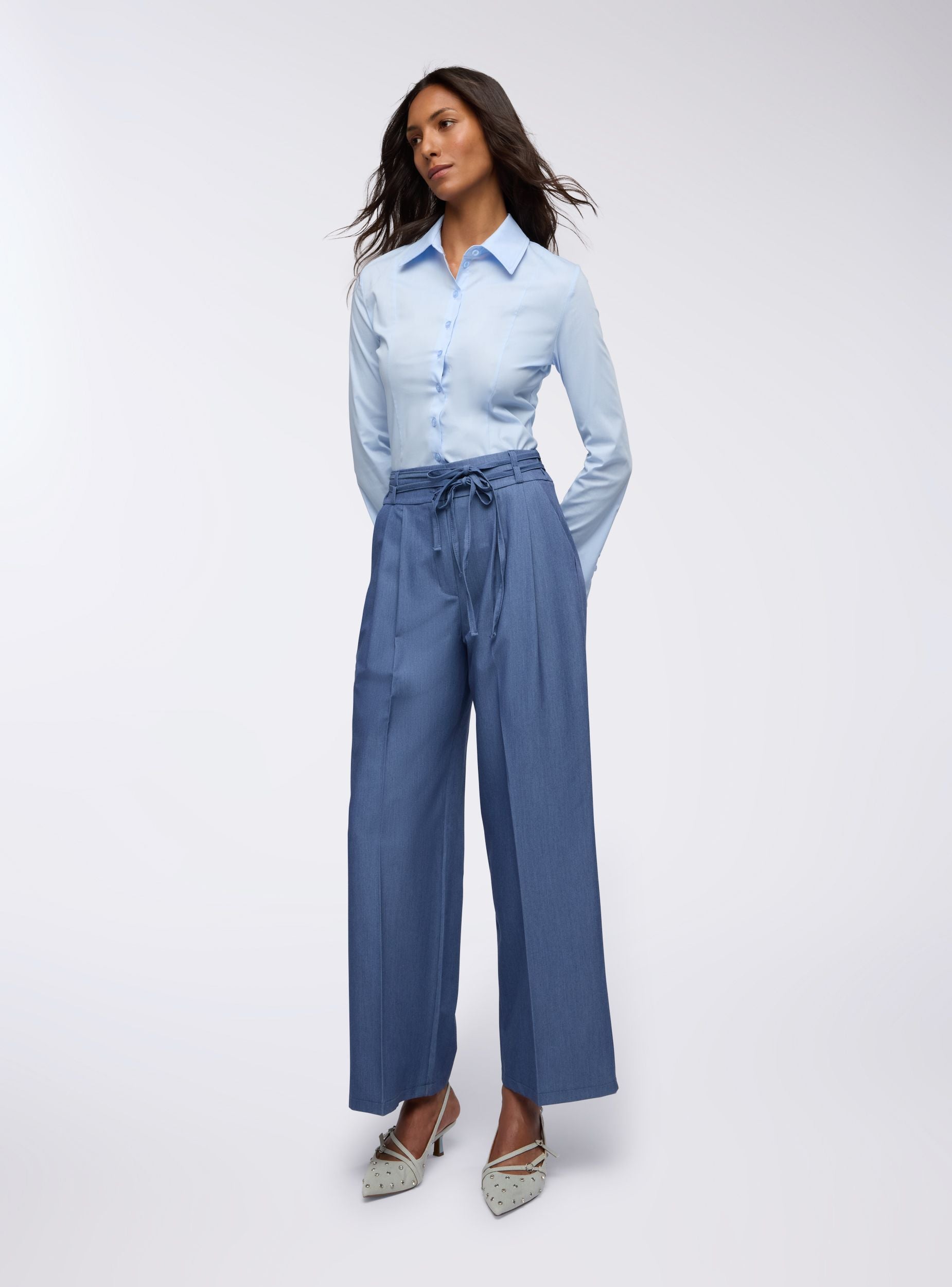 Pantaloni da donna dallo stile ampio e moderno, perfetti per creare outfit comodi ma di tendenza. Il taglio wide leg e la piega centrale conferiscono un tocco sartoriale, mentre il dettaglio del laccetto in vita aggiunge un elemento casual e pratico. Realizzati in tessuto effetto jeans. Ideali per essere indossati con una camicia morbida o un top aderente, questi pantaloni si adattano facilmente a look da giorno o da ufficio con un tocco contemporaneo.Dettagli
