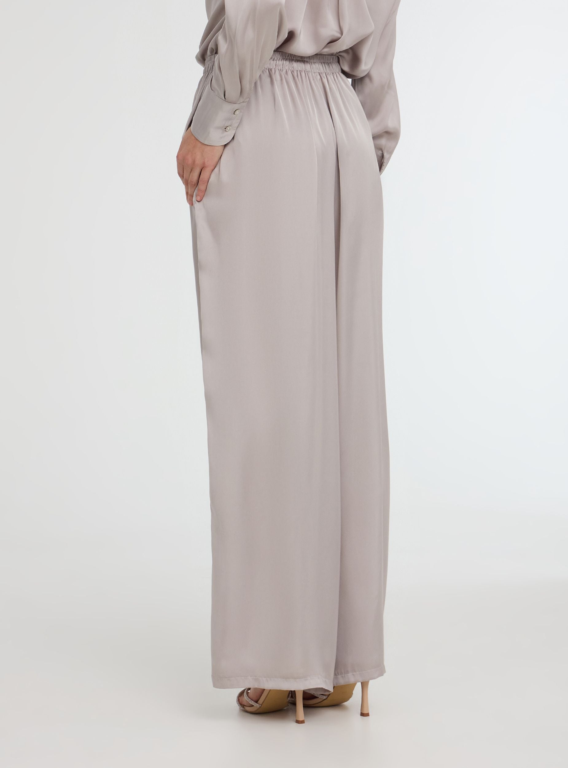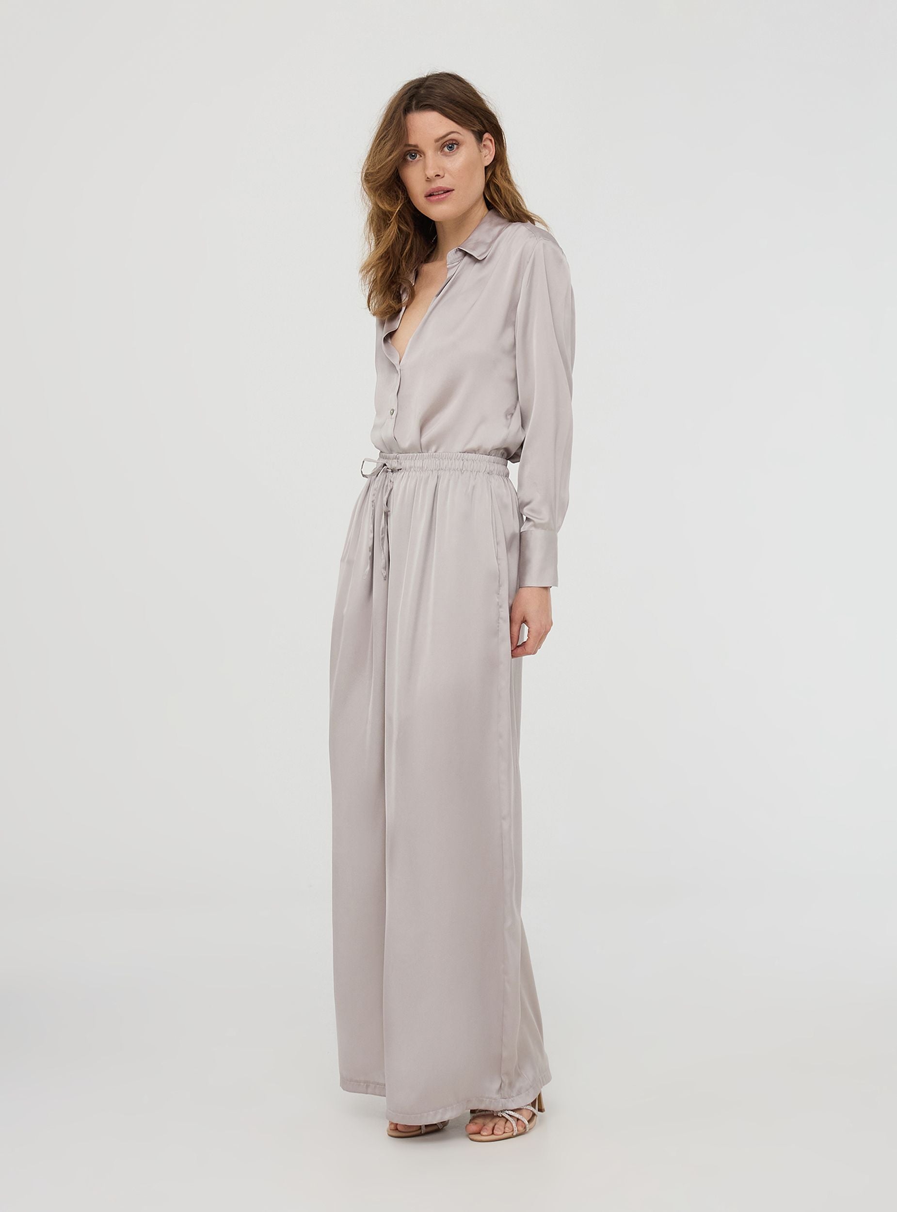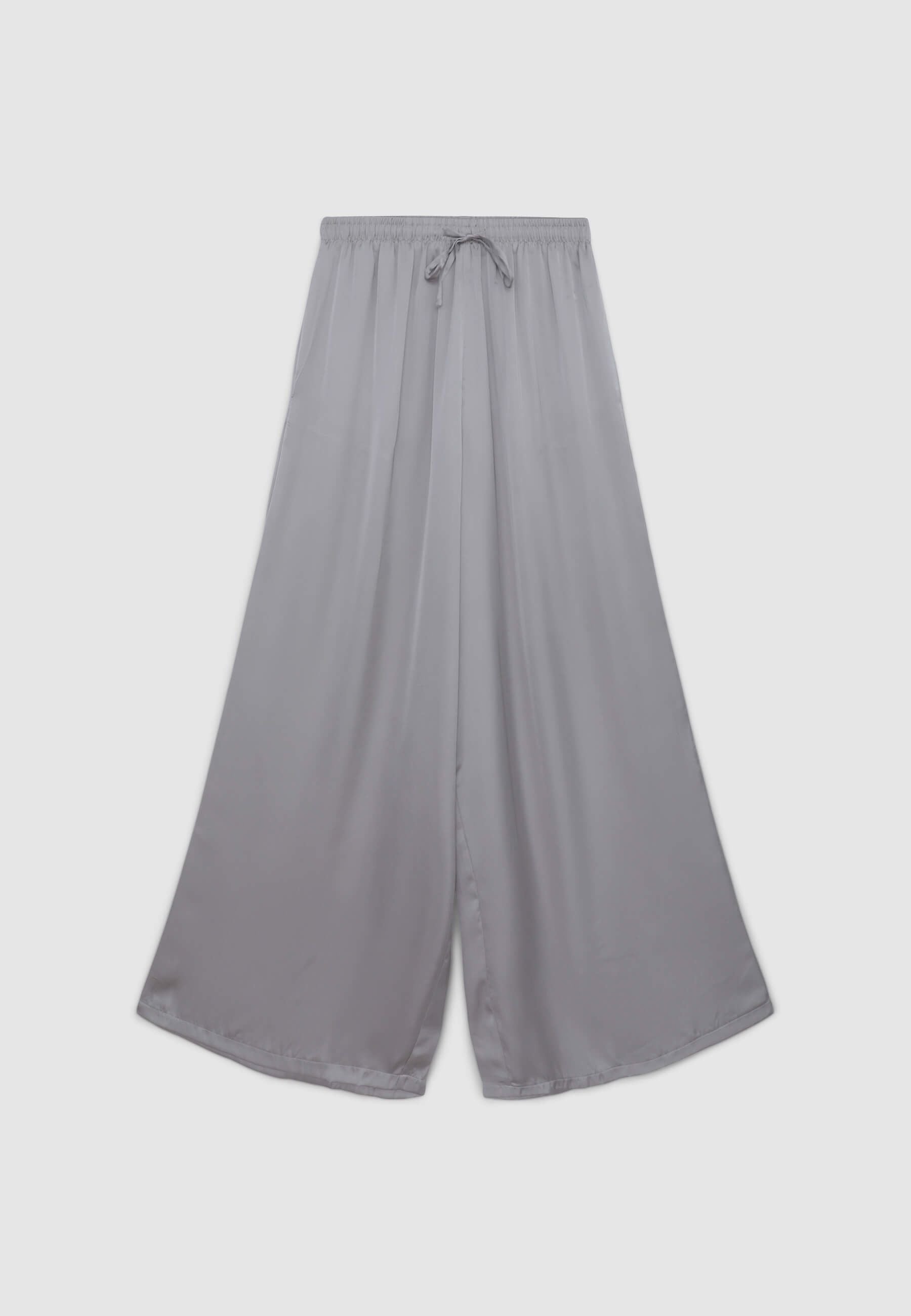 Pantaloni da donna a tinta unita con vestibilità wide leg, caratterizzati da una raffinata finitura effetto raso. La coulisse in vita e le tasche laterali garantiscono comfort e praticità. Perfetti per un look elegante, abbinati a camicie in coordinato e sandali, oppure per outfit casual-chic con top minimal e accessori luminosi. Ideali per serate e occasioni speciali.Dettagli