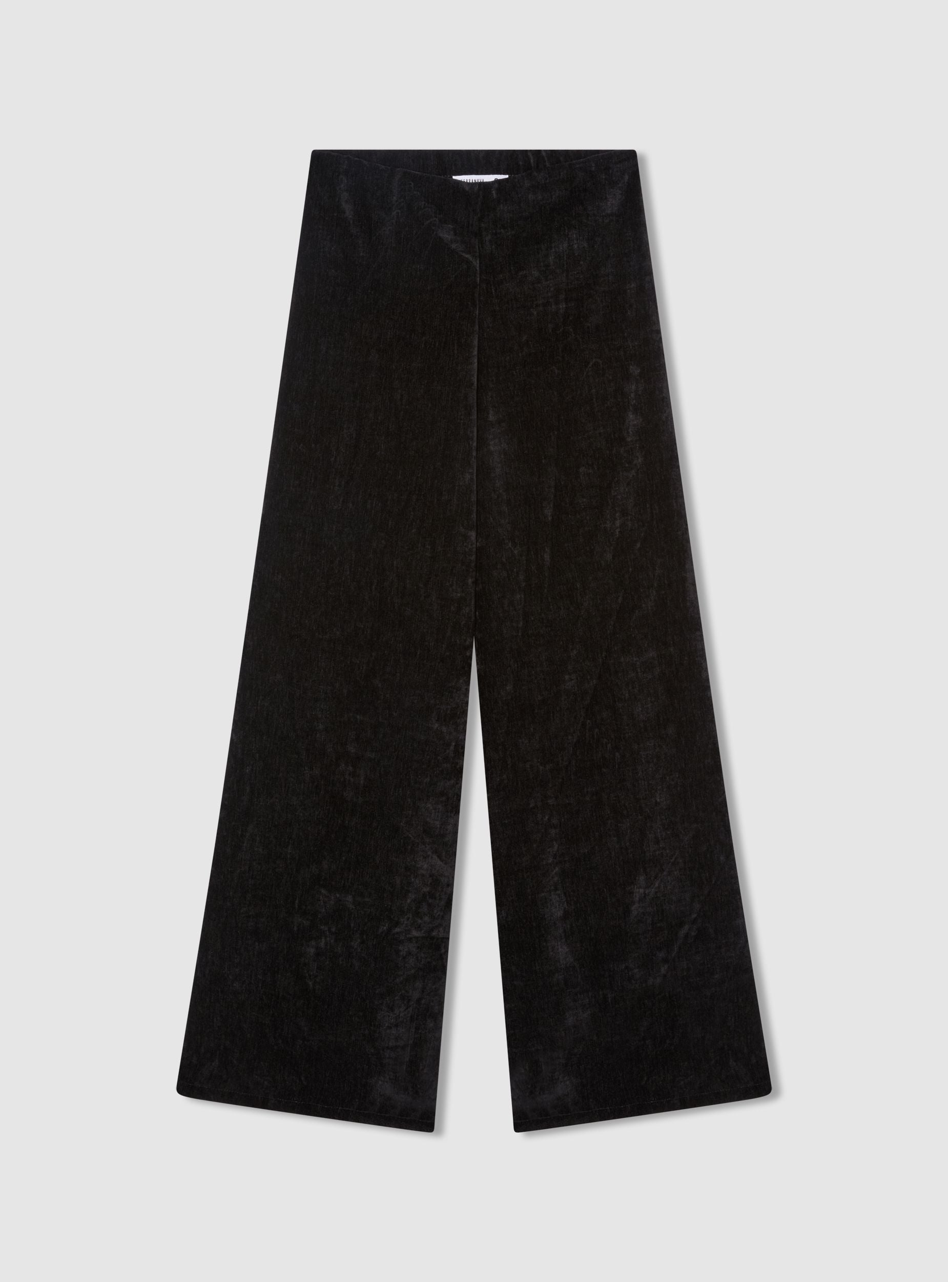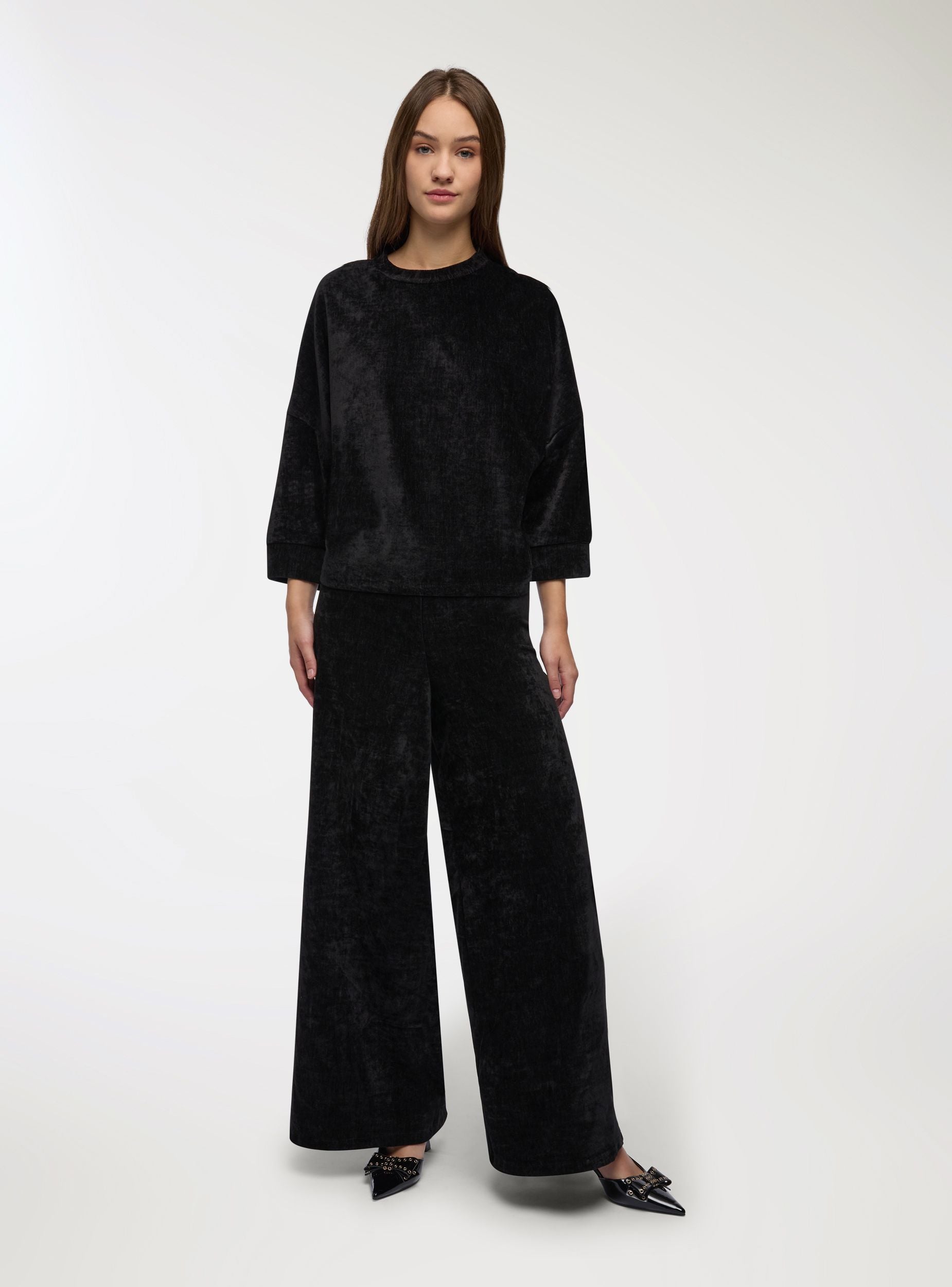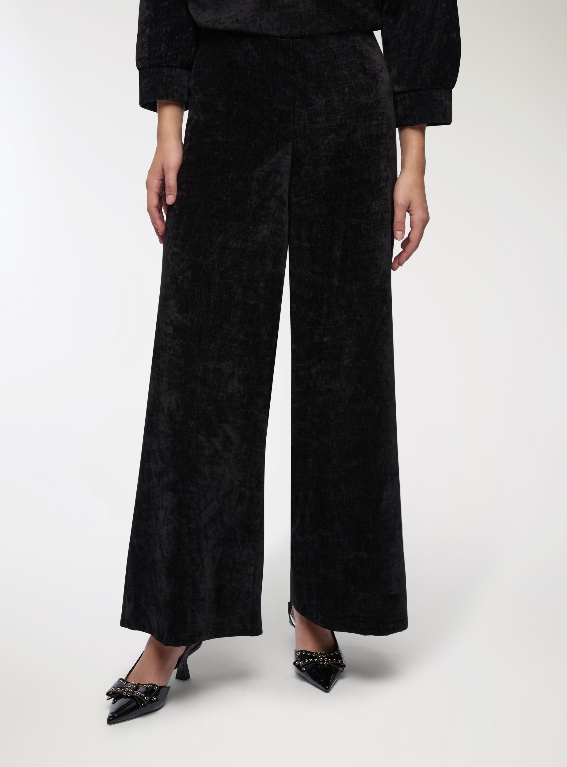 Pantaloni da donna a tinta unita con linea wide leg e lunghezza alla caviglia. Vita elasticizzata senza chiusura per un comfort quotidiano e vestibilità fluida. Il design minimal li rende versatili per ufficio o serate, abbinati a camicie, top aderenti o maglie morbide. Tessuto morbido con finitura vellutata che aggiunge un tocco elegante.Dettagli