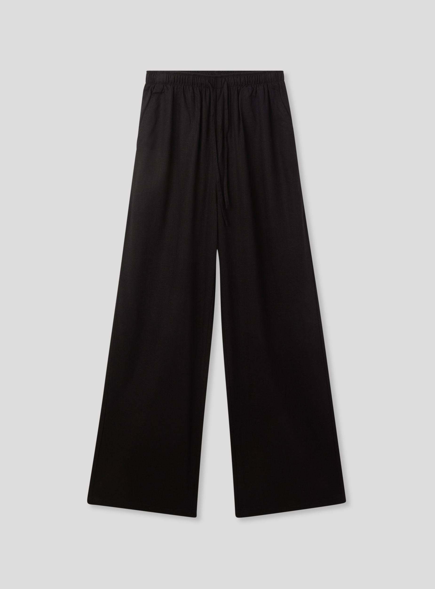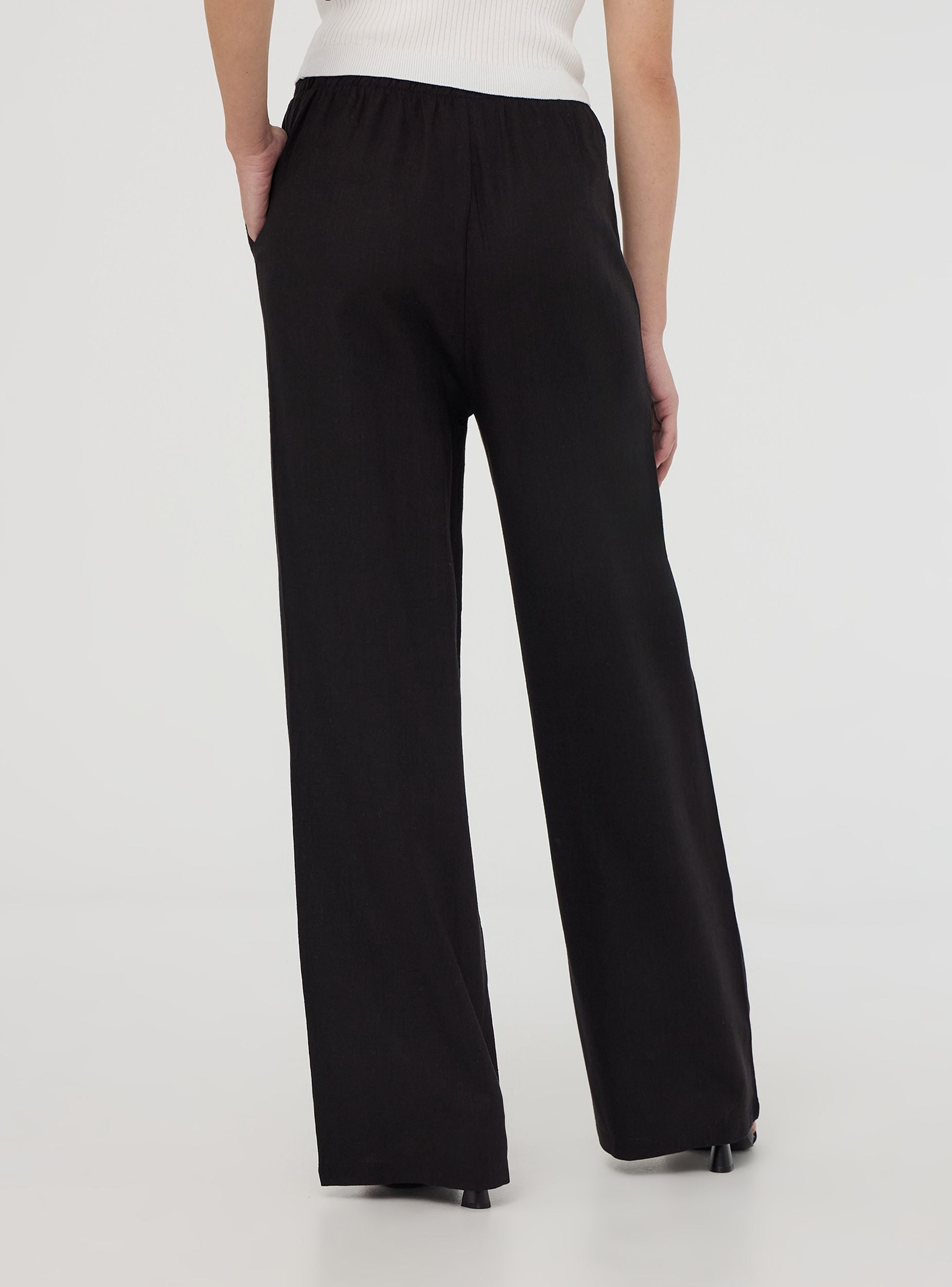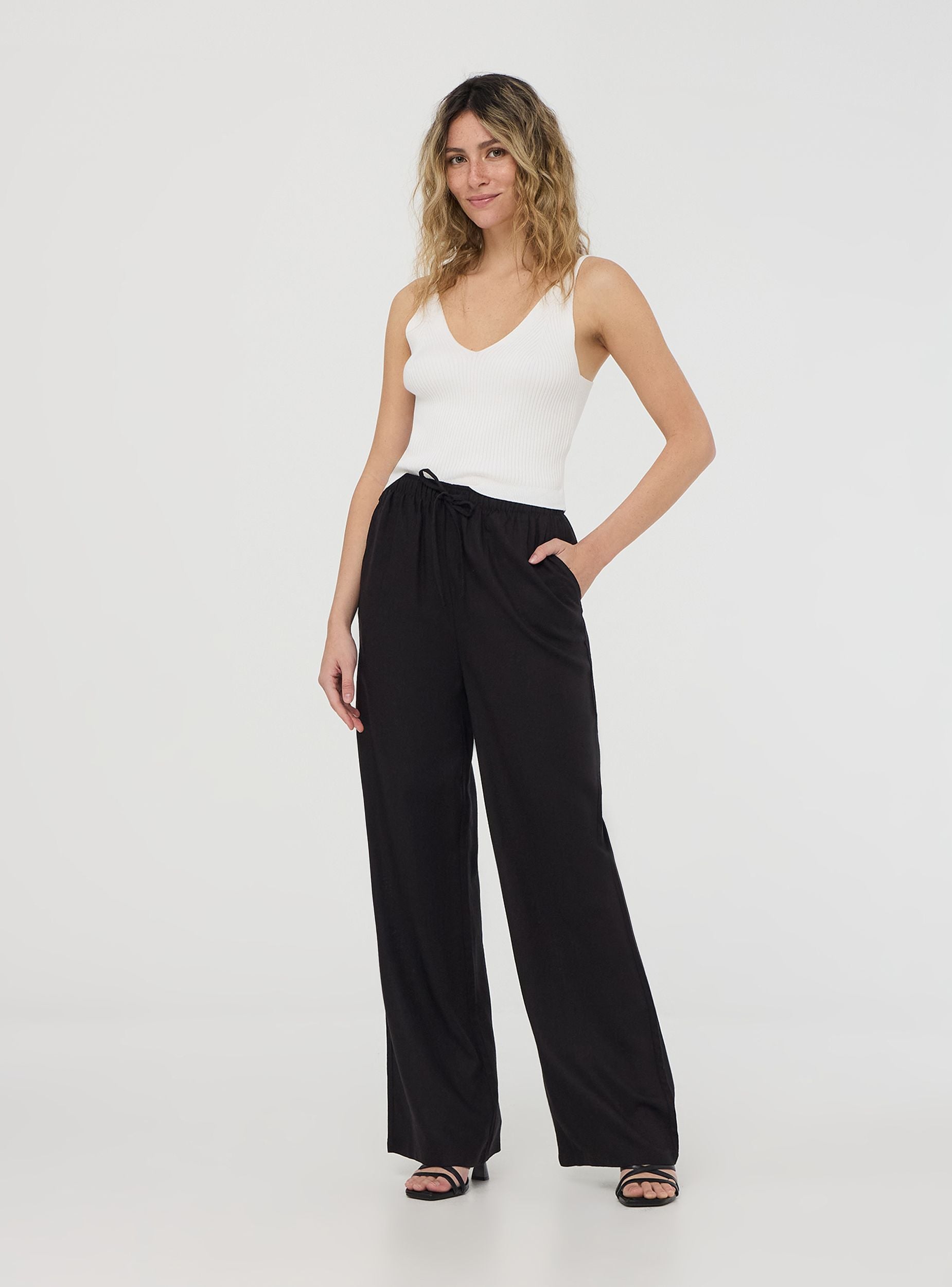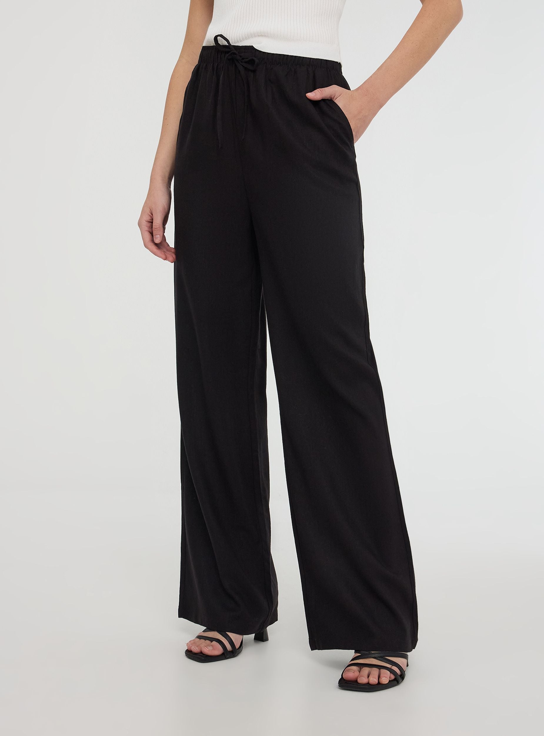 Pantaloni da donna a tinta unita con vestibilità wide leg, perfetti per un look fresco e rilassato. Dotati di coulisse in vita e tasche laterali, offrono praticità e stile. Il tessuto in misto lino li rende ideali per giornate calde, abbinati a top leggeri e sandali per un outfit casual o a bluse morbide per un’occasione più sofisticata.Dettagli