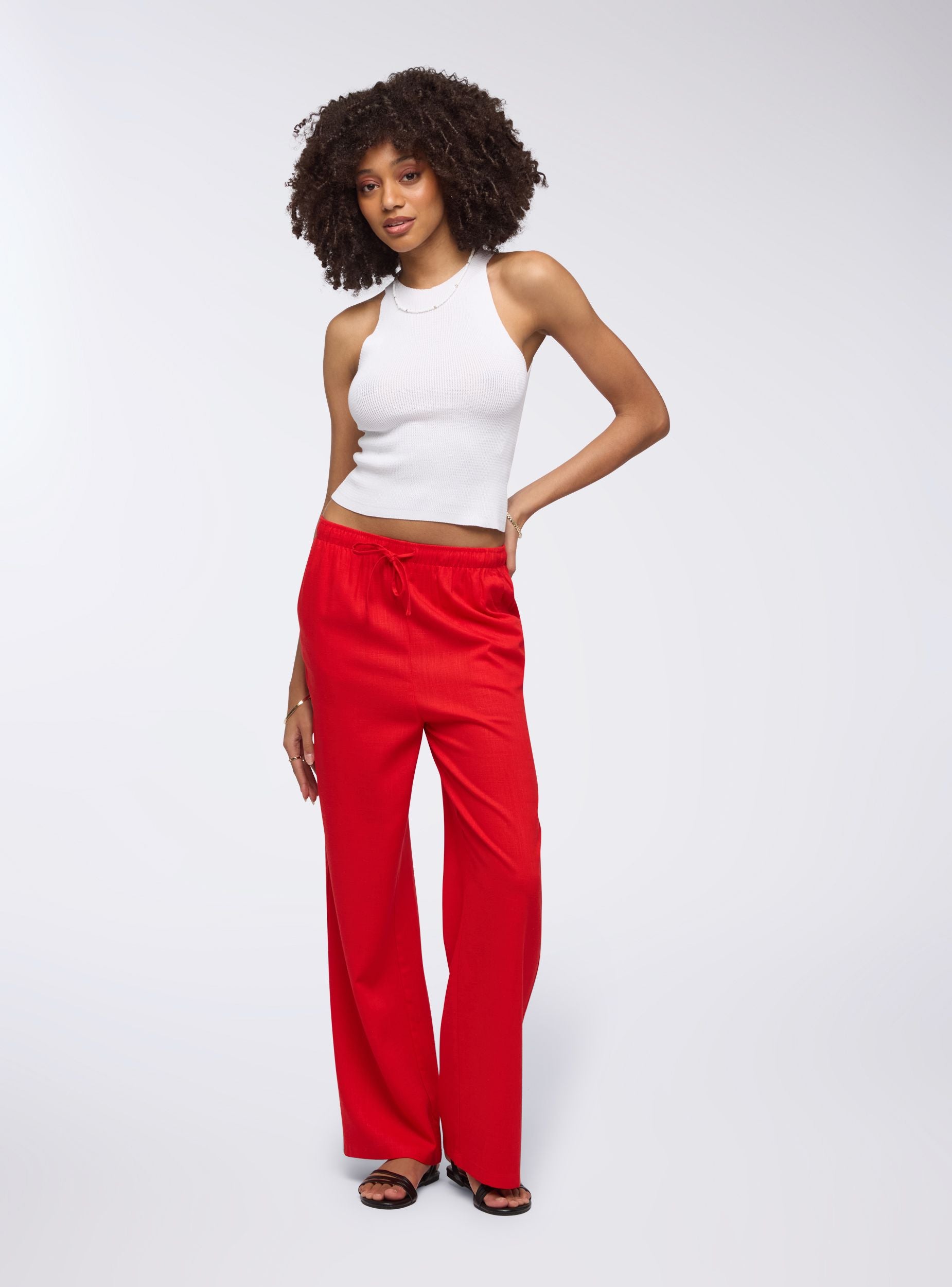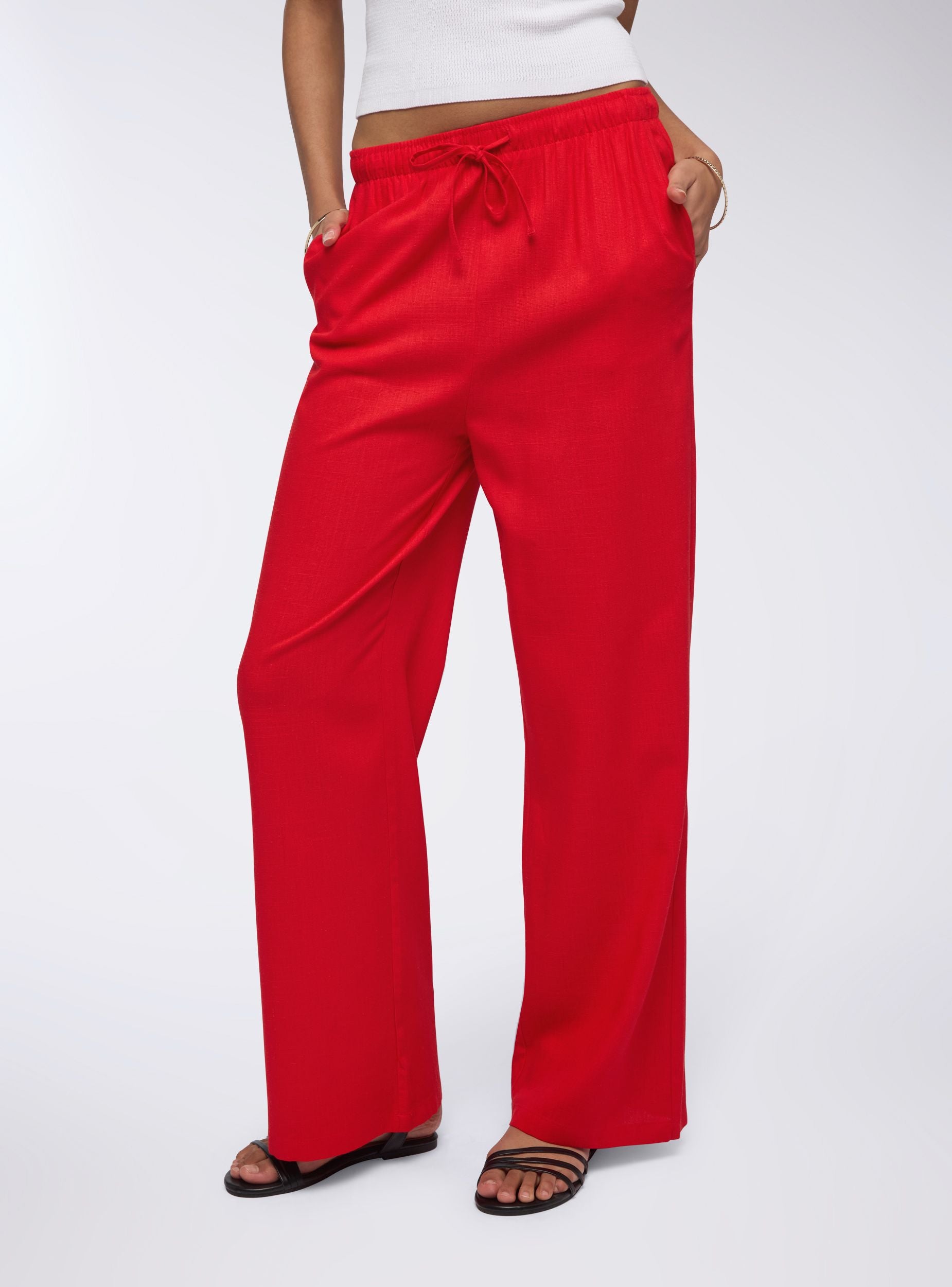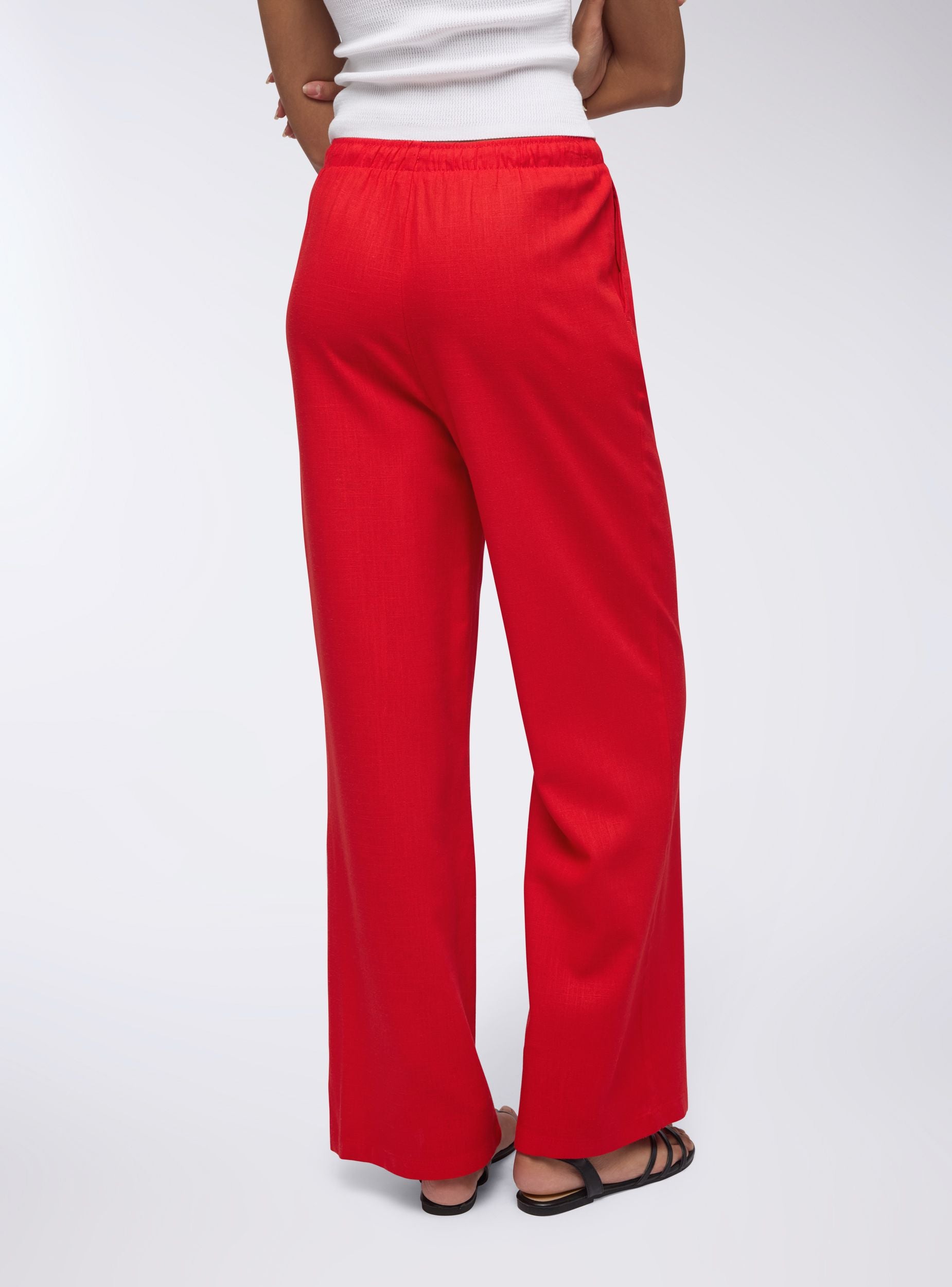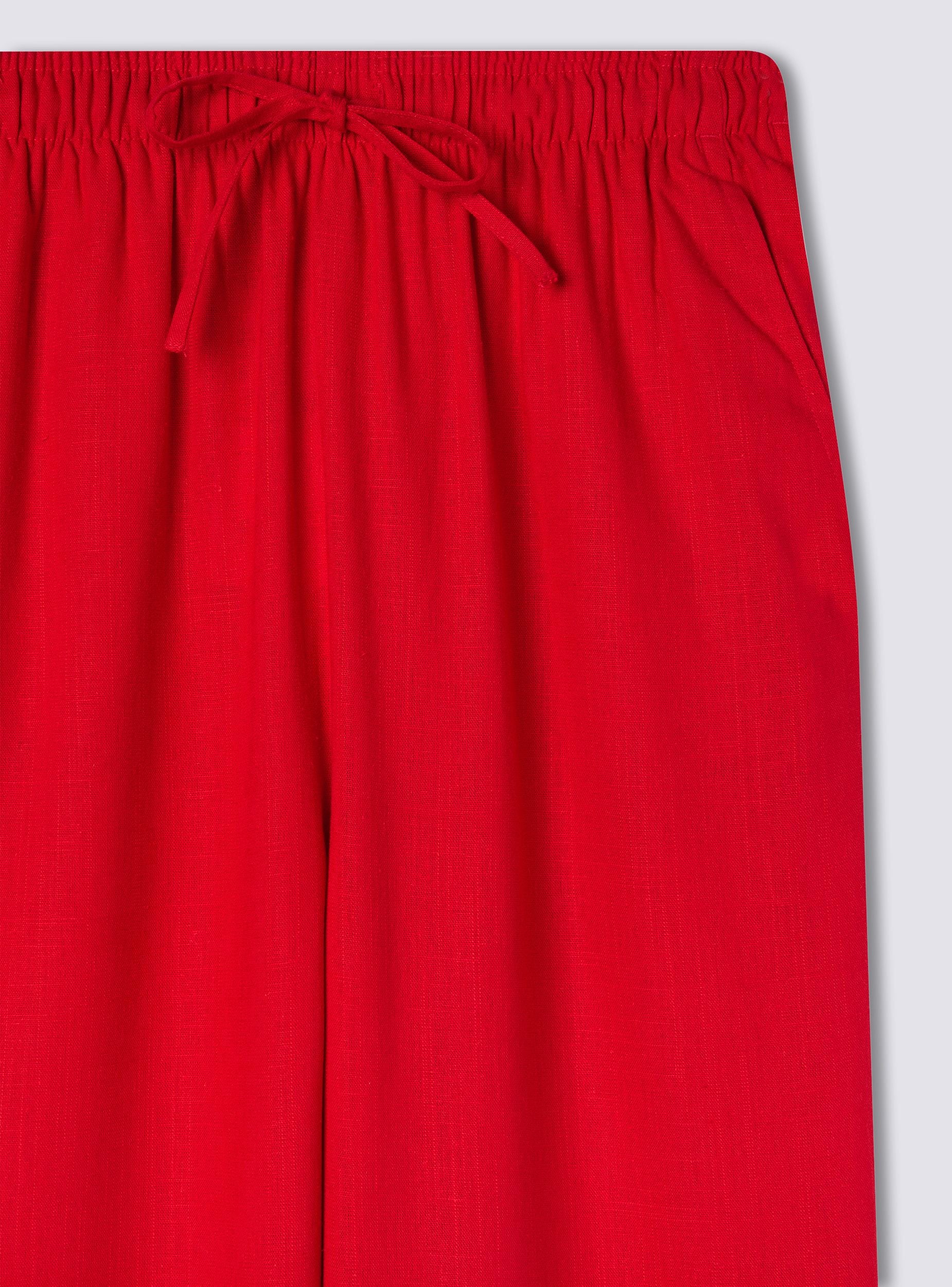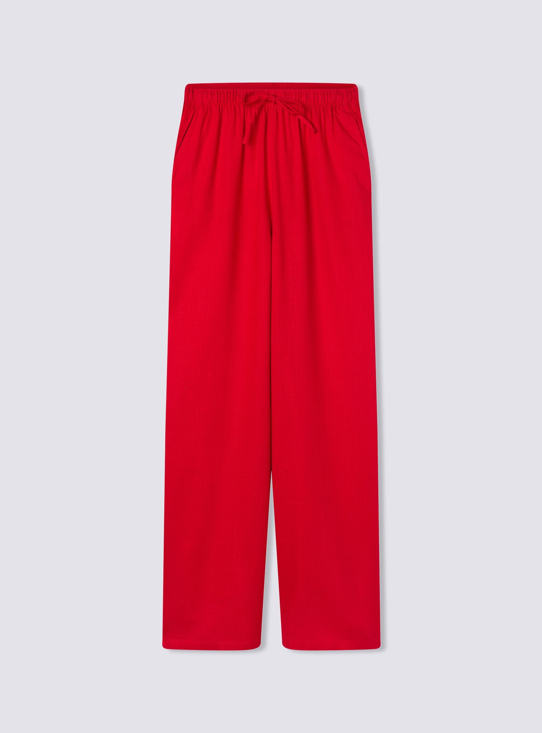 Pantaloni da donna a tinta unita con vestibilità wide leg, perfetti per un look fresco e rilassato. Dotati di coulisse in vita e tasche laterali, offrono praticità e stile. Il tessuto in misto lino li rende ideali per giornate calde, abbinati a top leggeri e sandali per un outfit casual o a bluse morbide per un’occasione più sofisticata.Dettagli