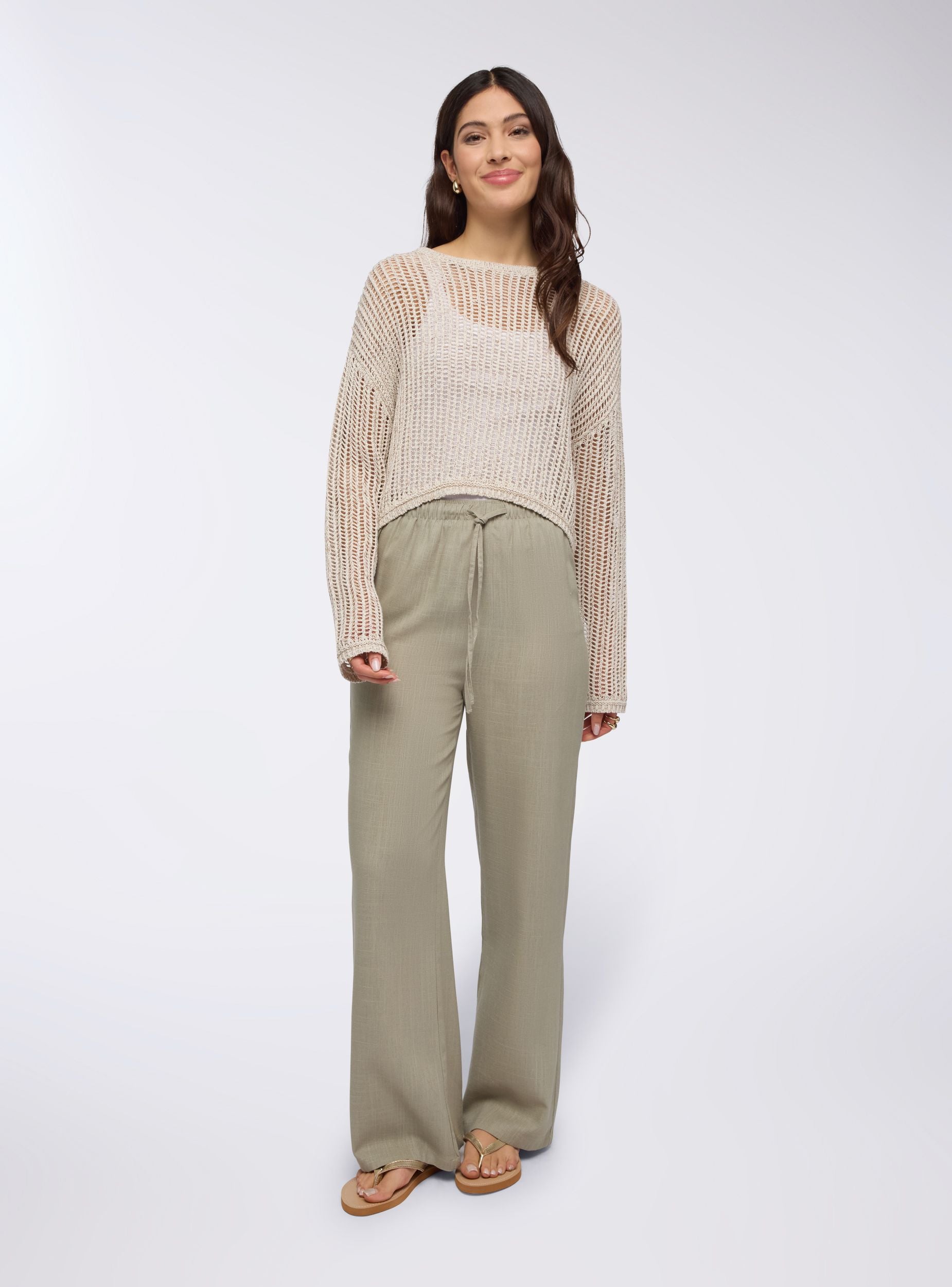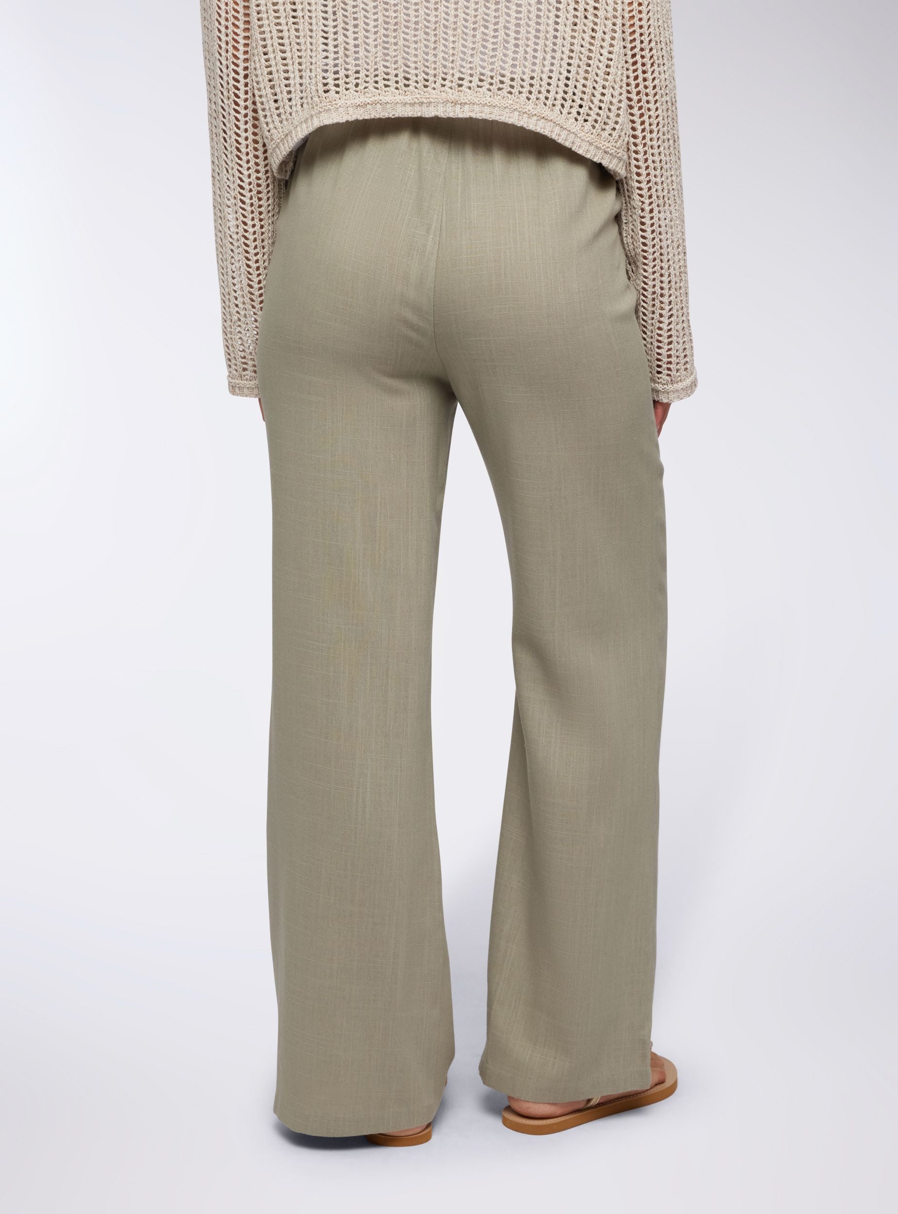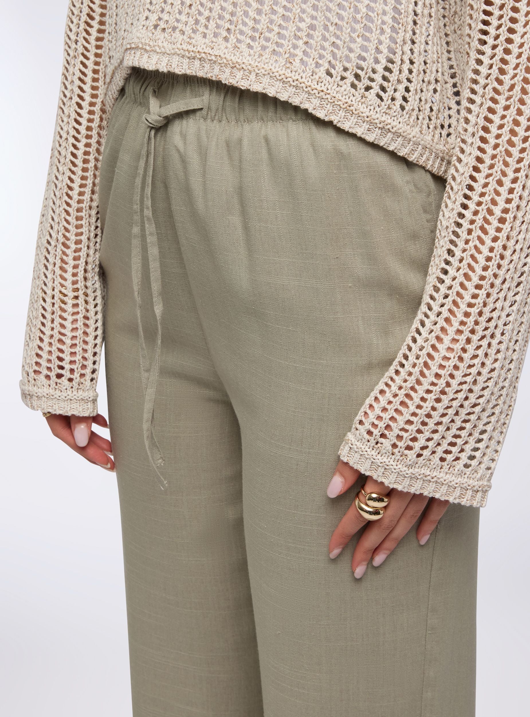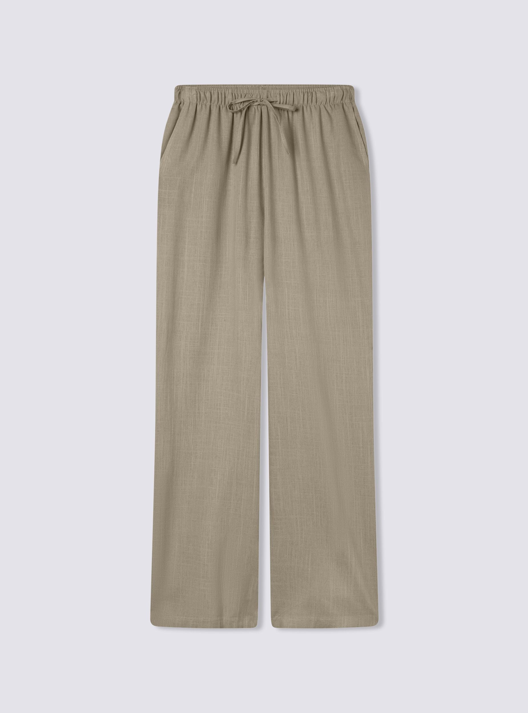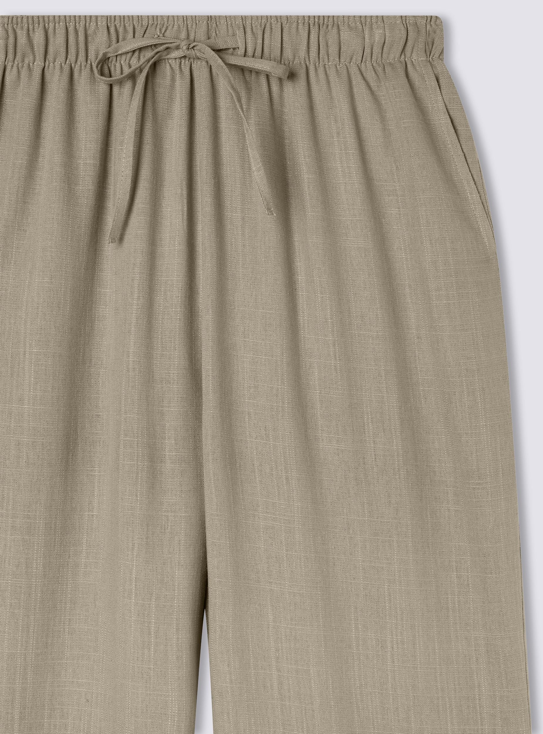 Pantaloni da donna a tinta unita con vestibilità wide leg, perfetti per un look fresco e rilassato. Dotati di coulisse in vita e tasche laterali, offrono praticità e stile. Il tessuto in misto lino li rende ideali per giornate calde, abbinati a top leggeri e sandali per un outfit casual o a bluse morbide per un’occasione più sofisticata.Dettagli