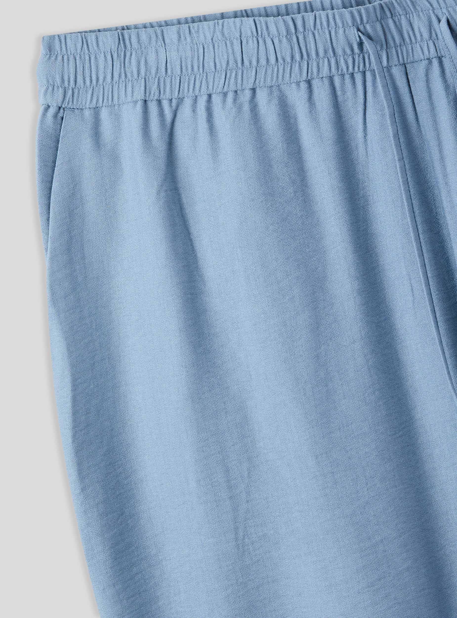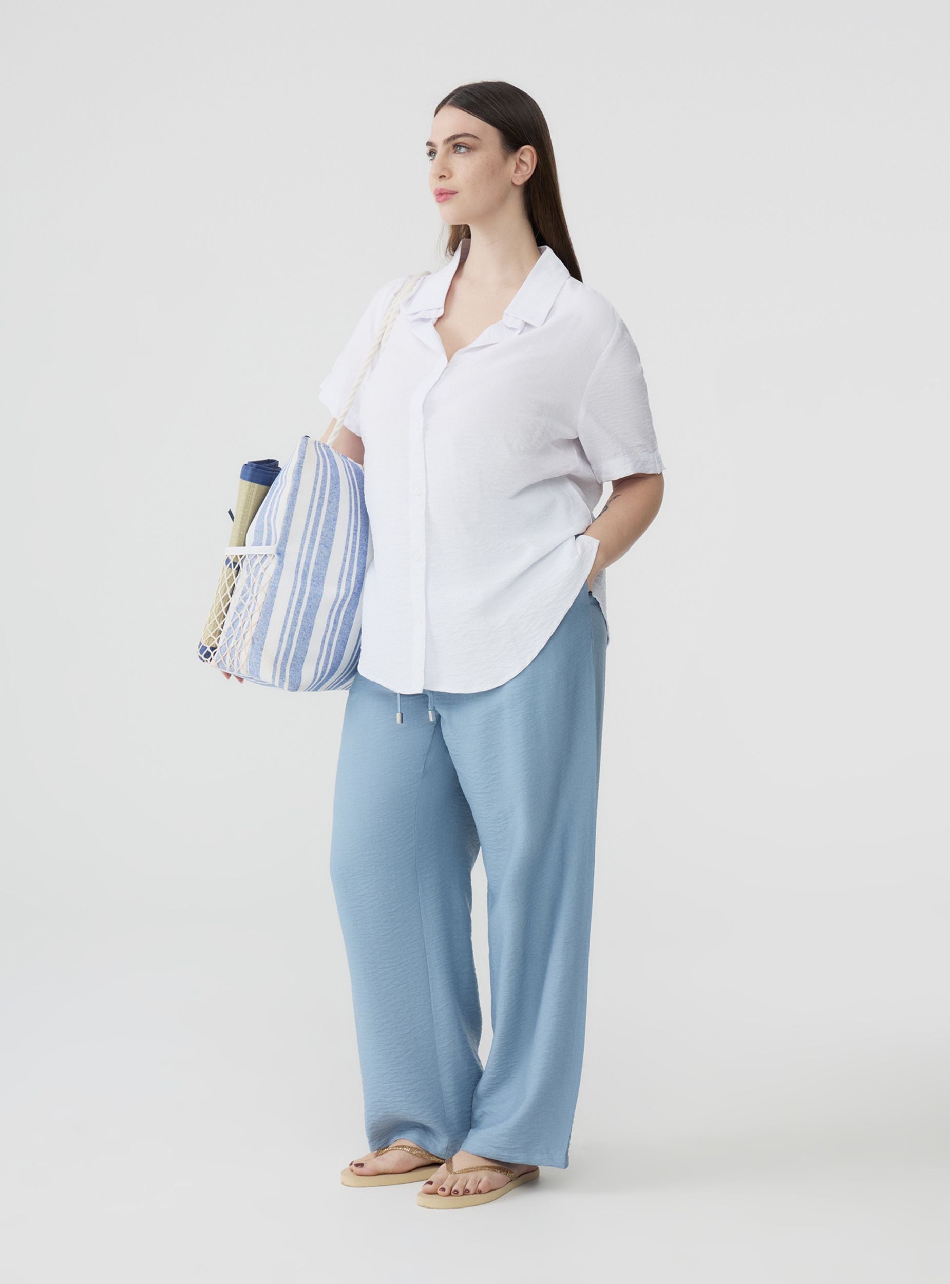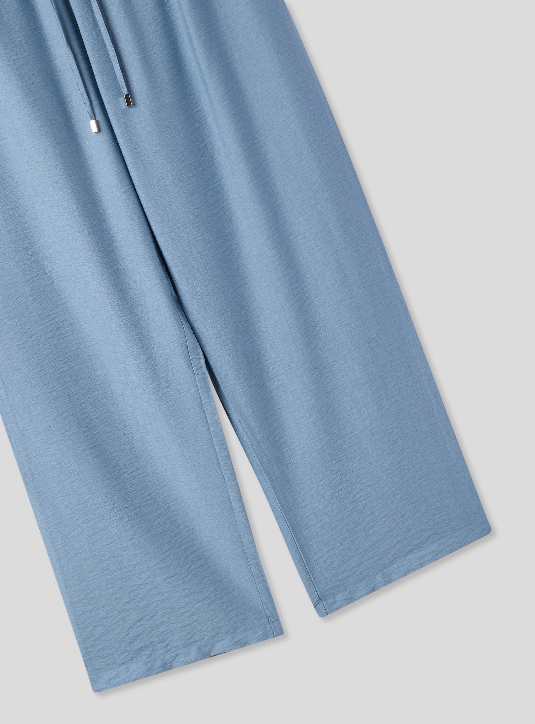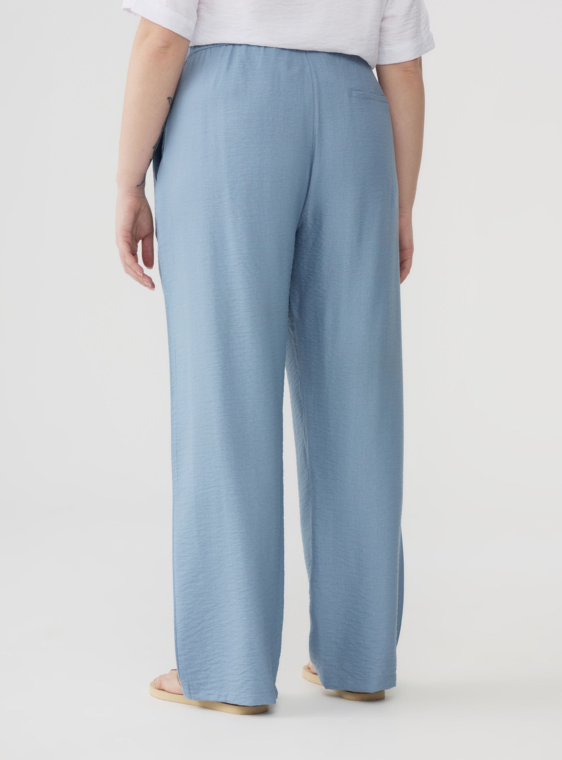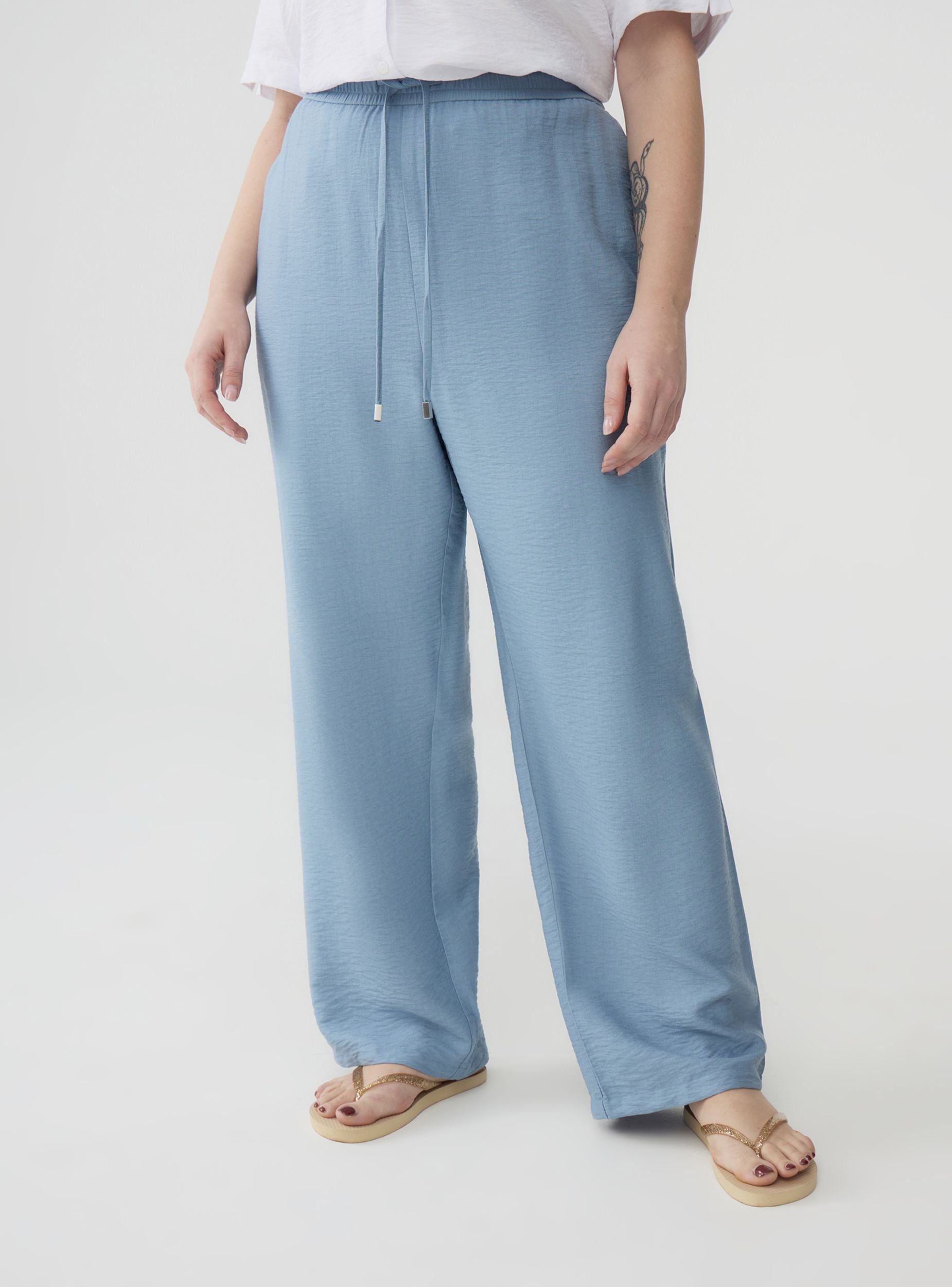 Pantaloni da donna dal taglio wide leg, perfetti per creare look freschi e rilassati. La vita elasticizzata con coulisse assicura una vestibilità confortevole e regolabile, mentre le tasche laterali aggiungono praticità. Il design a tinta unita e l'effetto lino li rendono ideali per outfit casual da giorno, perfetti con una t-shirt e sandali o con una camicia leggera per un tocco più sofisticato.Dettagli