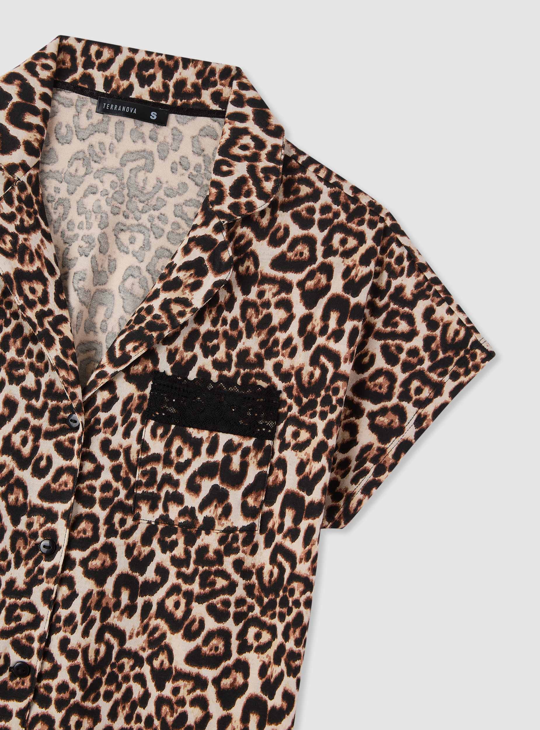 Pigiama da donna a fantasia animalier composto da camicia a maniche corte con collo a revers e chiusura con bottoni, taschino applicato con bordo in pizzo e pantaloncini con elastico in vita e fiocco frontale. Perfetto per le serate a casa e per un look notte curato, facile da abbinare a vestaglie leggere e pantofole morbide.Dettagli
